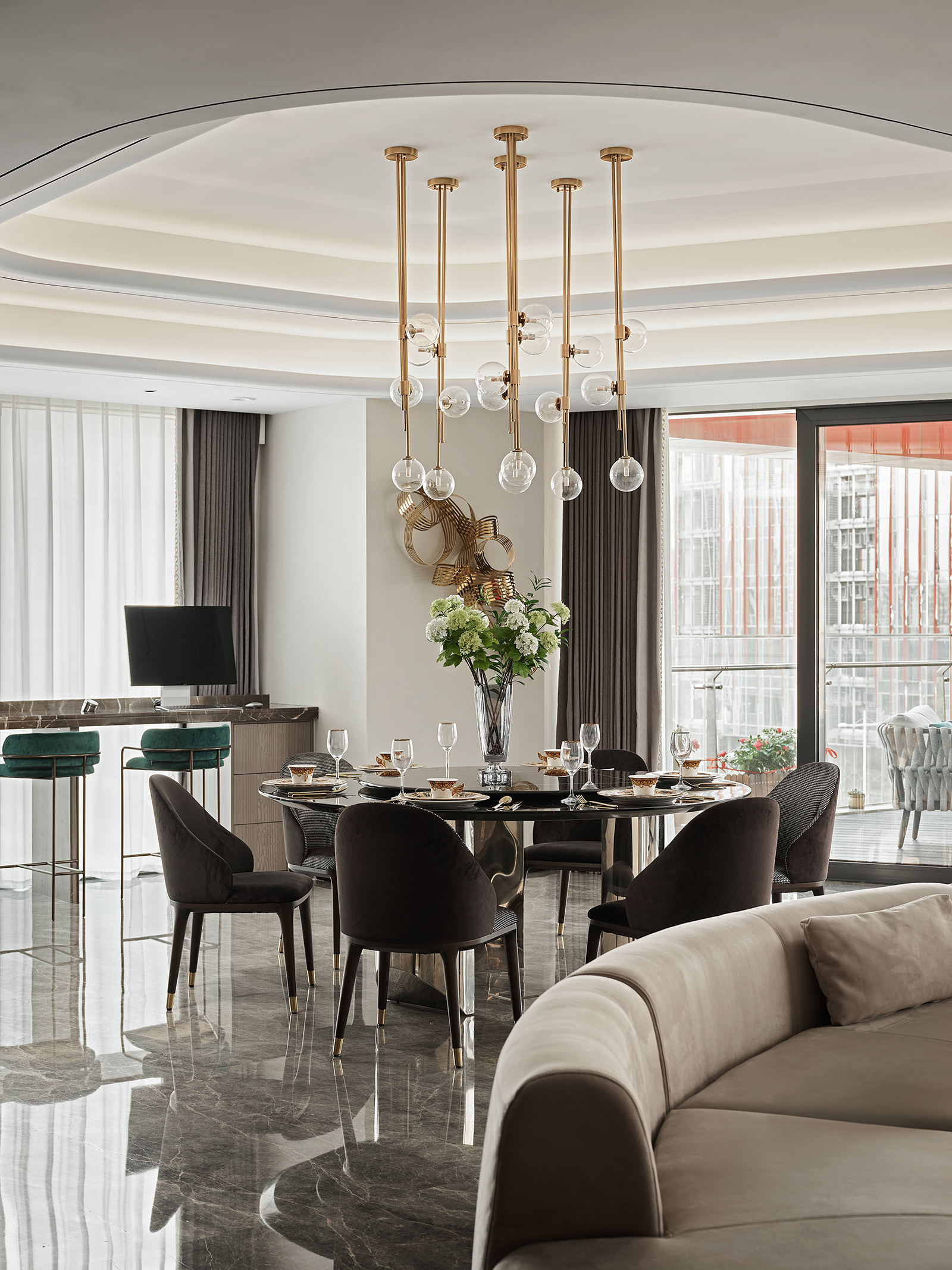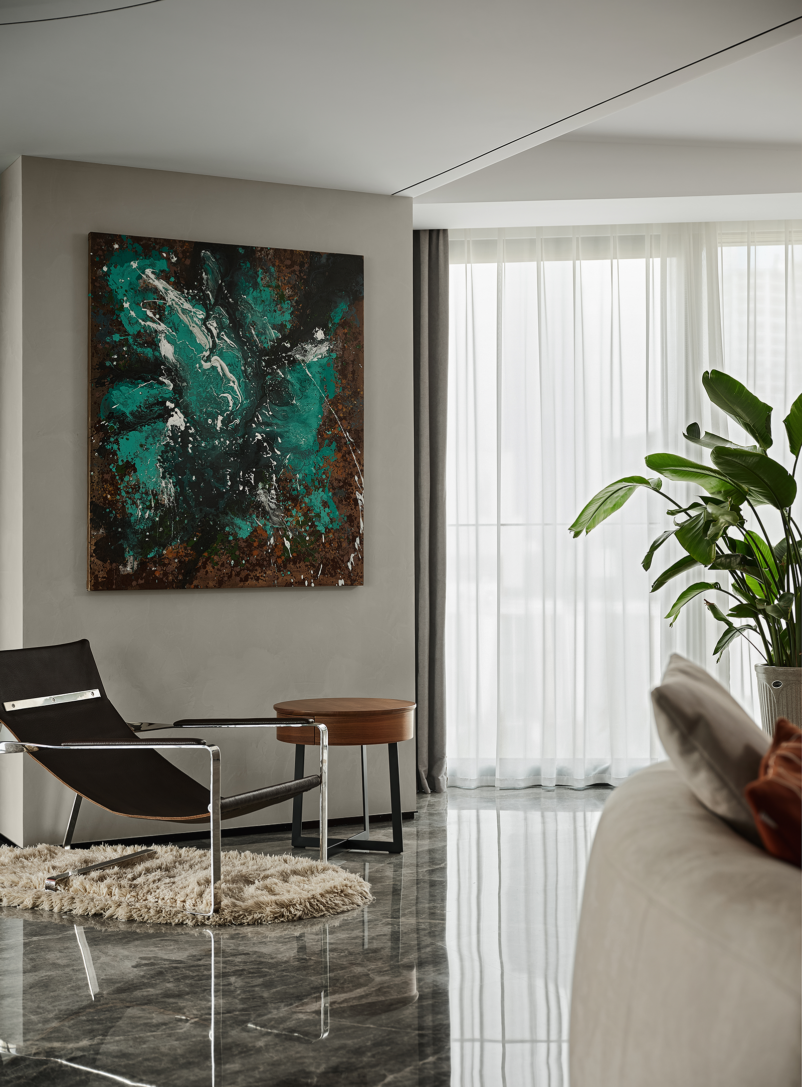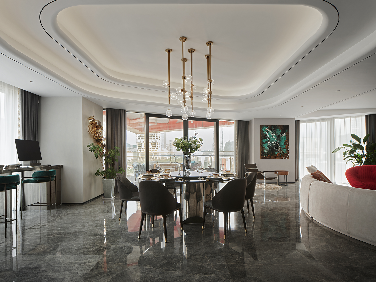 在注重家温暖与生活气息的同时,设计赋予空间奢华的灵魂,重构现代法式风情!空间以中性色调为主,硬朗与温润交织在一起,形成既冲突又丰富的场景。