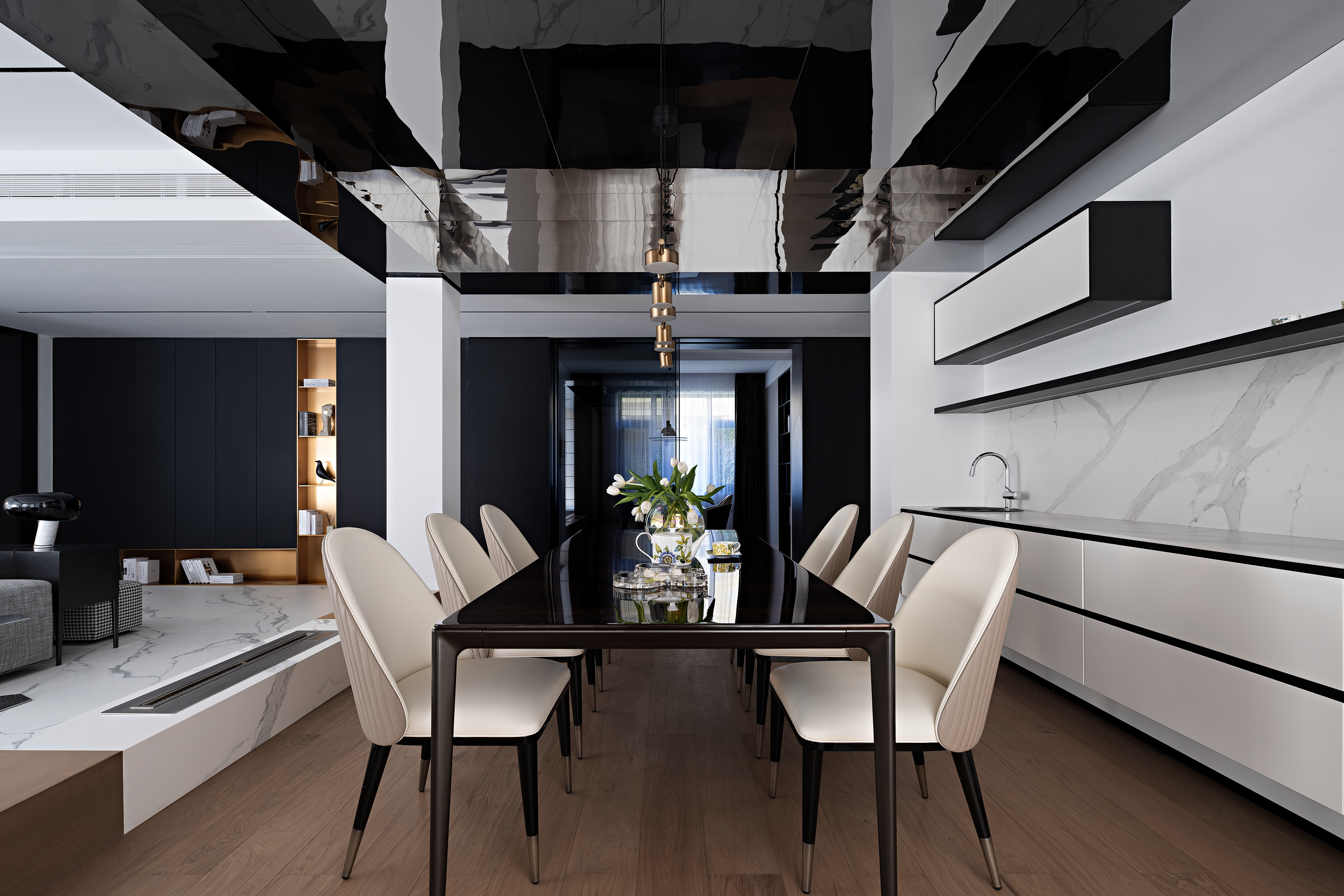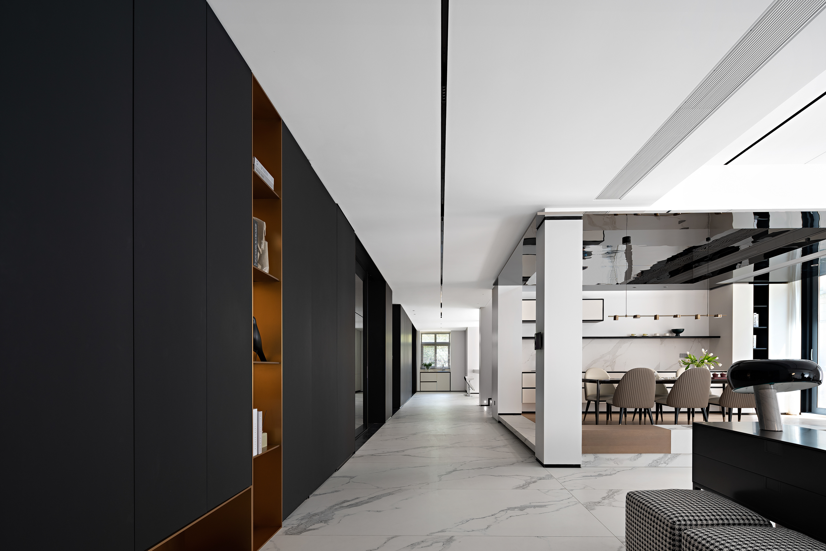 黑白灰是纯粹而又理性的色彩,也是永不过时的风格。设计师通过简化的线条和极致的节点,铺垫了空间的基底,但同时也通过多样化的肌理、究的材质、精致的家具和艺术品的点缀,叙述着空间的质感。