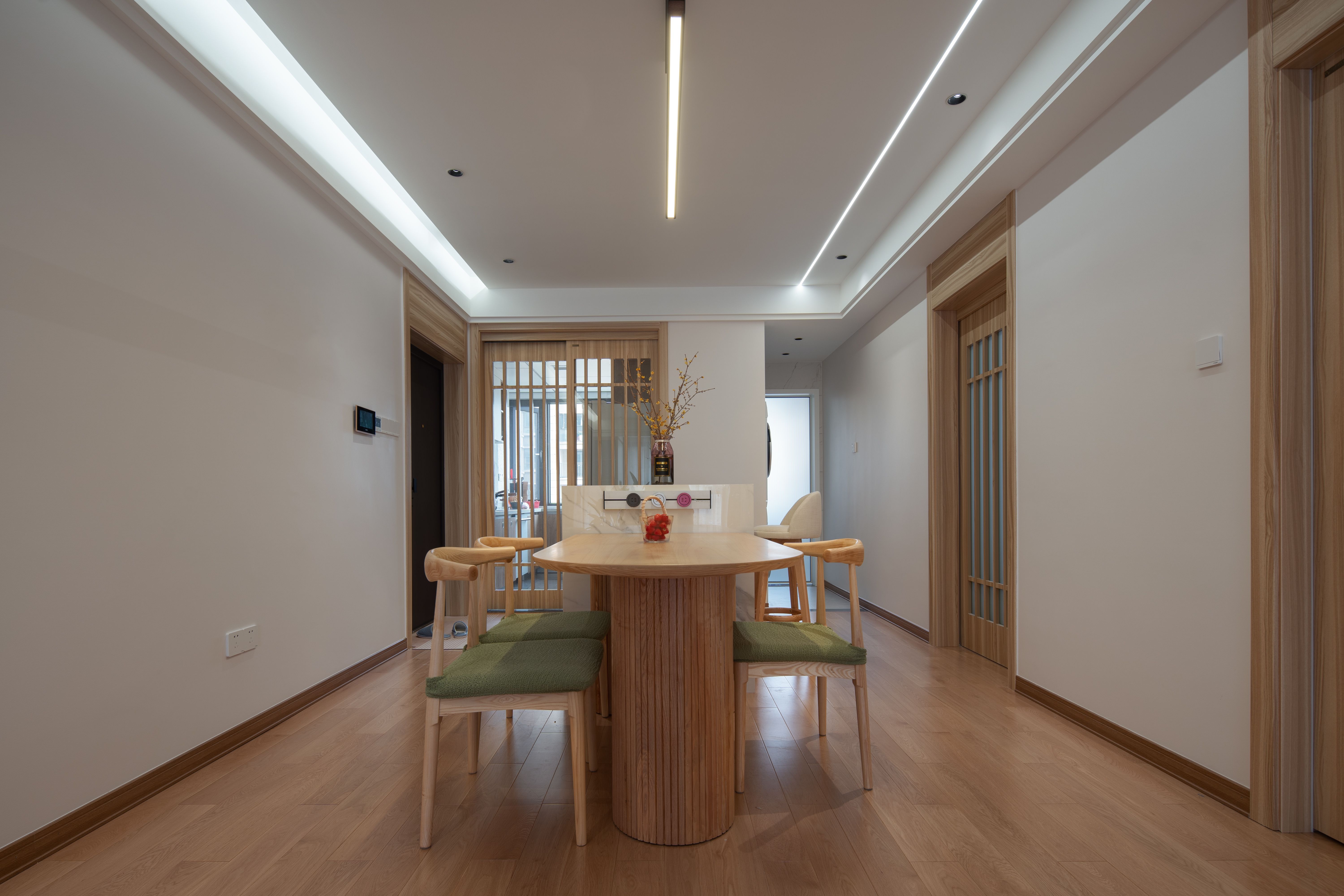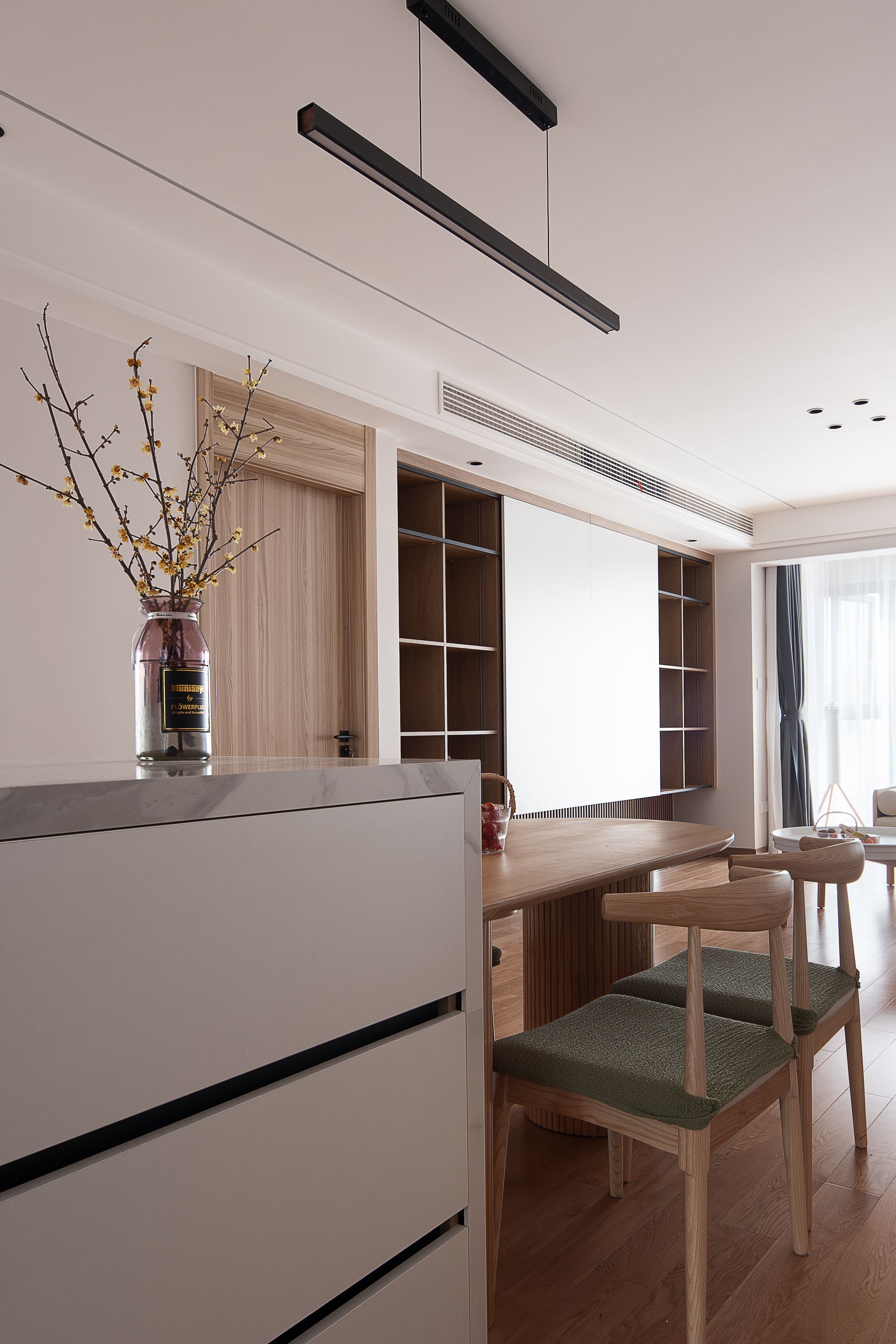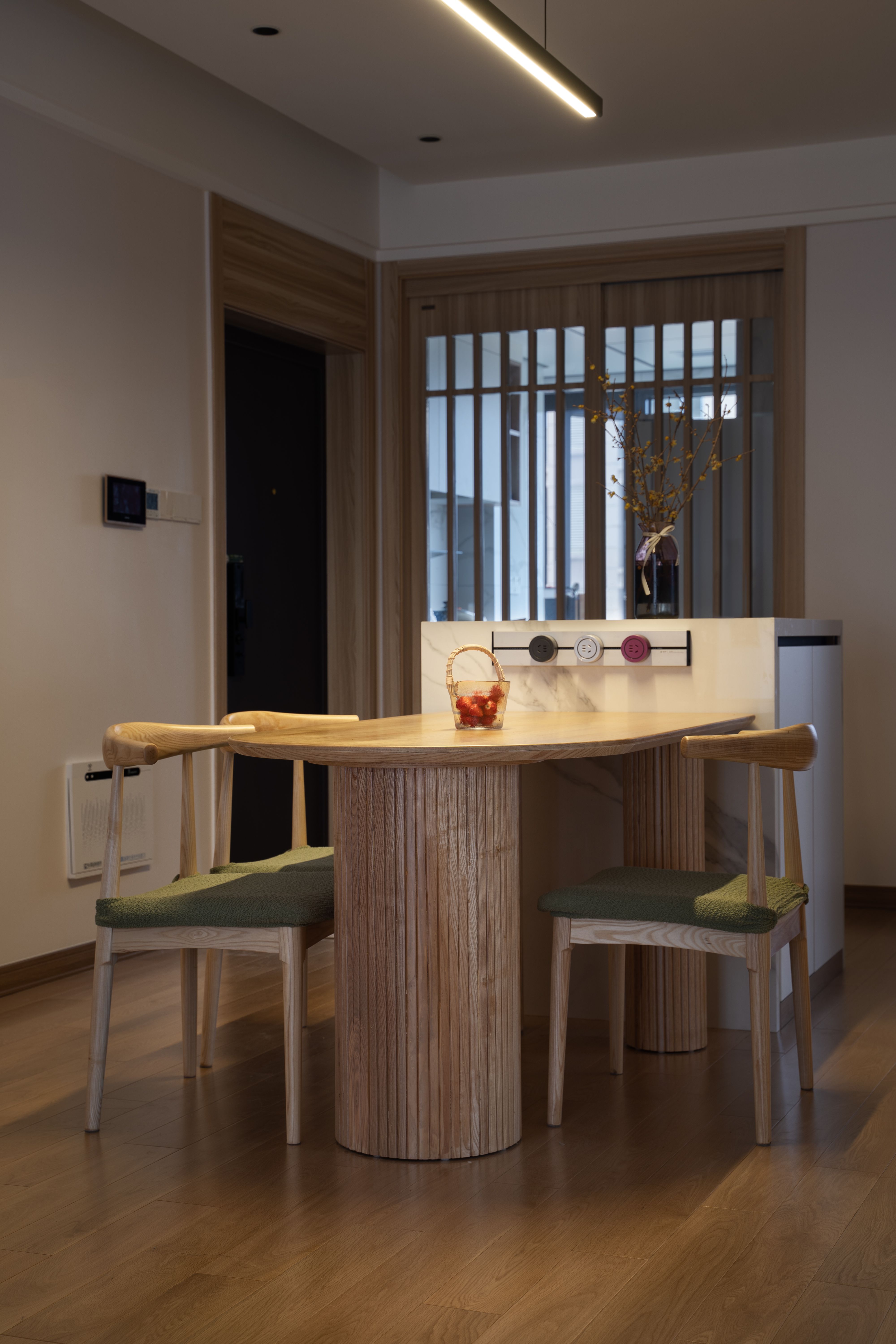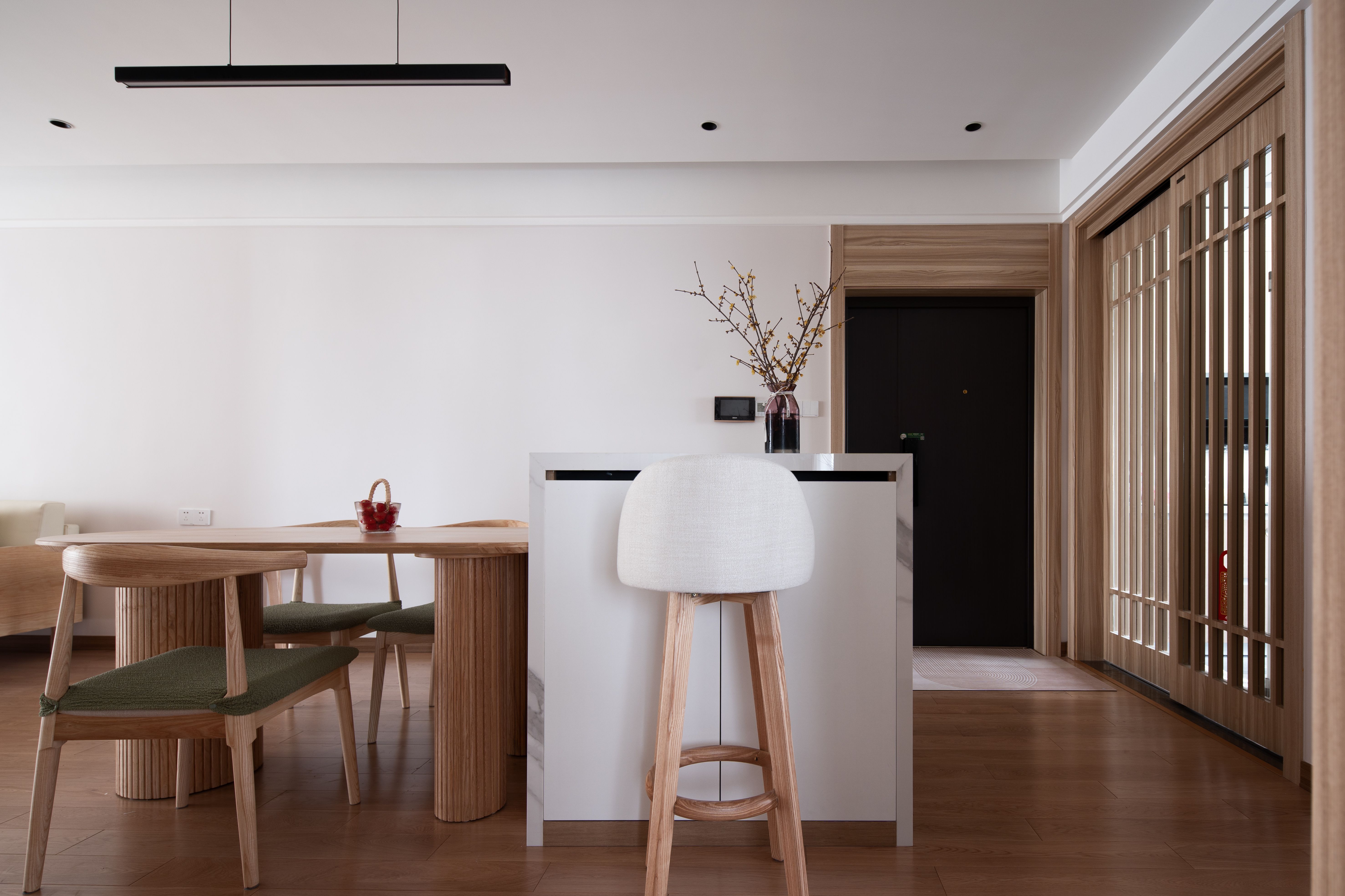 空间布局:玄关处台面的设计缓冲了原有的缺失,以白为主设计的柜台,有效分布空间并增添收纳空间,饭厅的家具也随整体采用原木材质,彰显实木独有质感,不繁琐厚重。