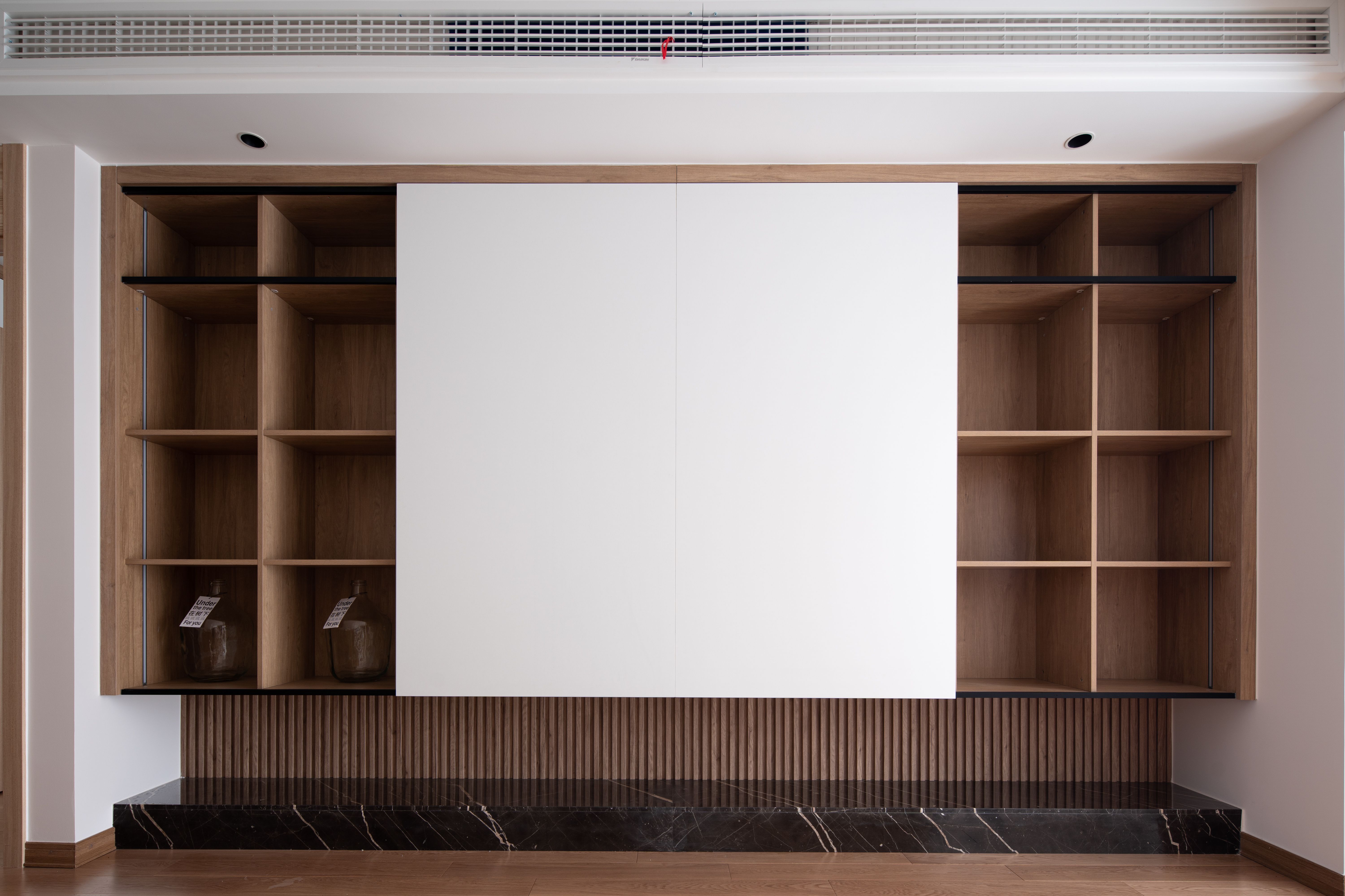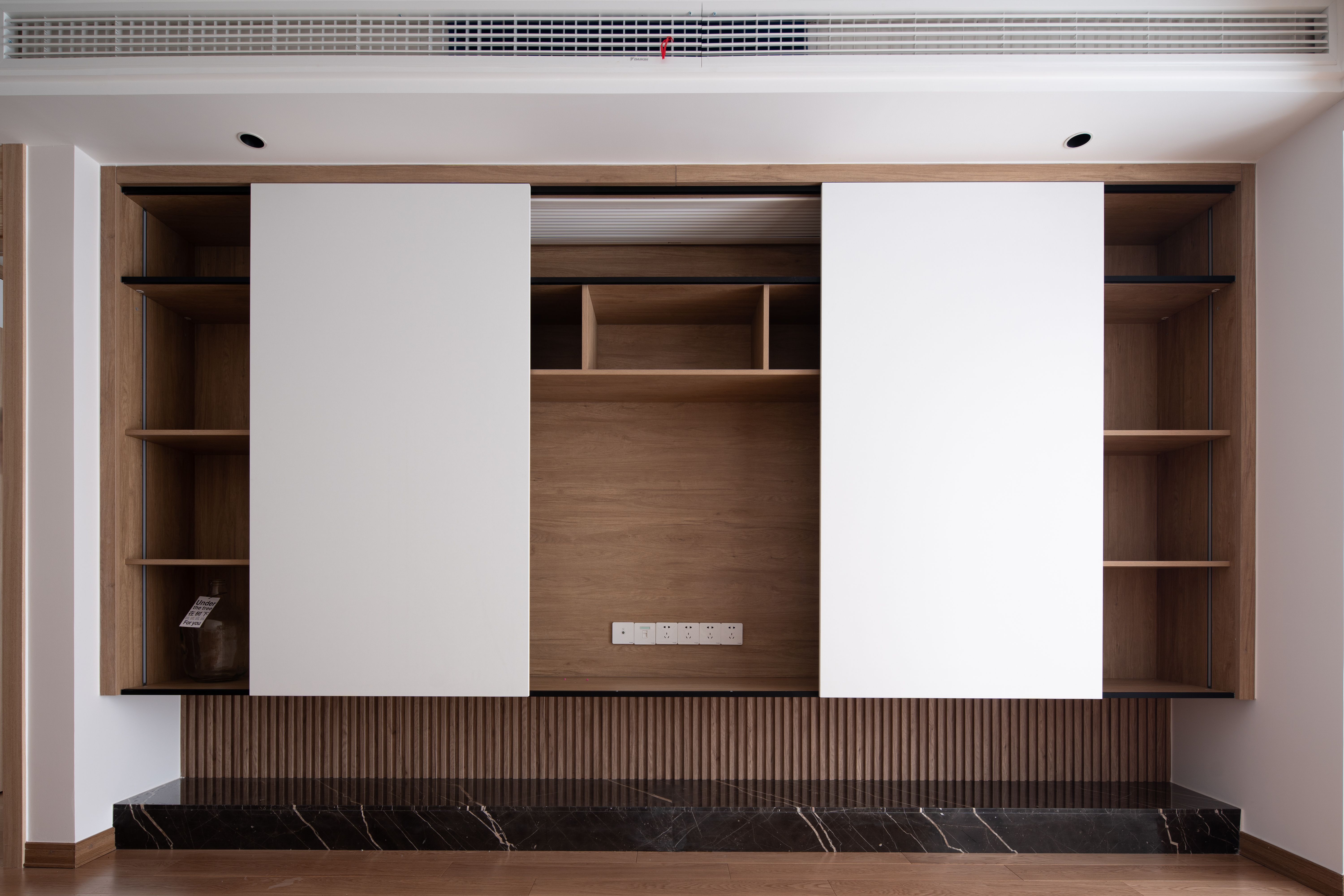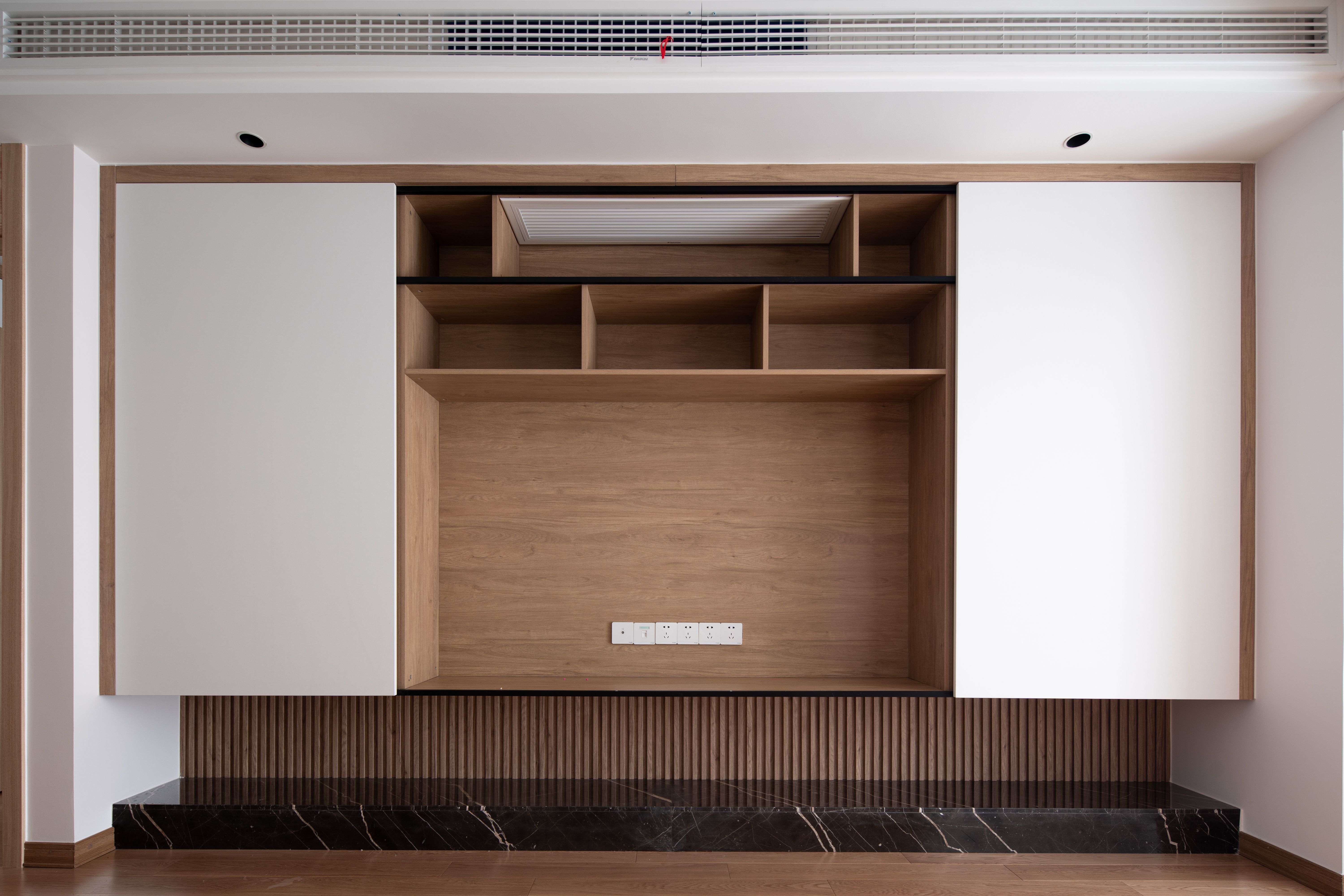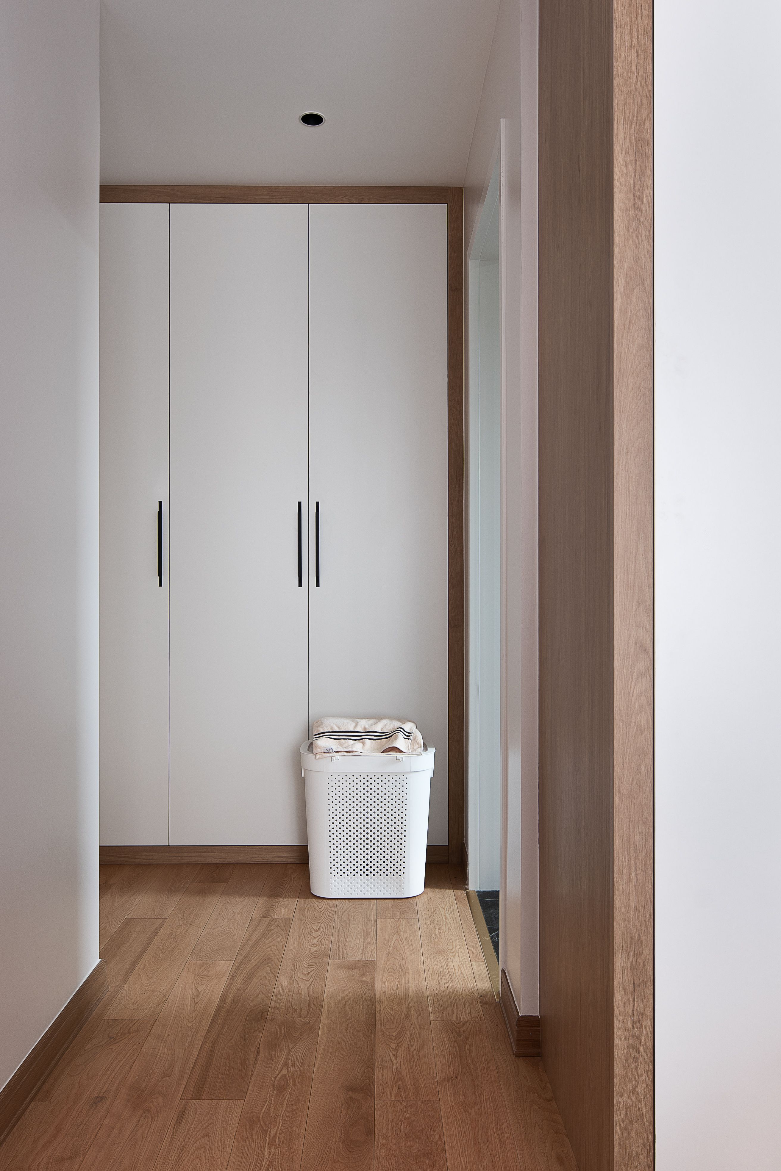 空间布局:玄关处台面的设计缓冲了原有的缺失,以白为主设计的柜台,有效分布空间并增添收纳空间,饭厅的家具也随整体采用原木材质,彰显实木独有质感,不繁琐厚重。