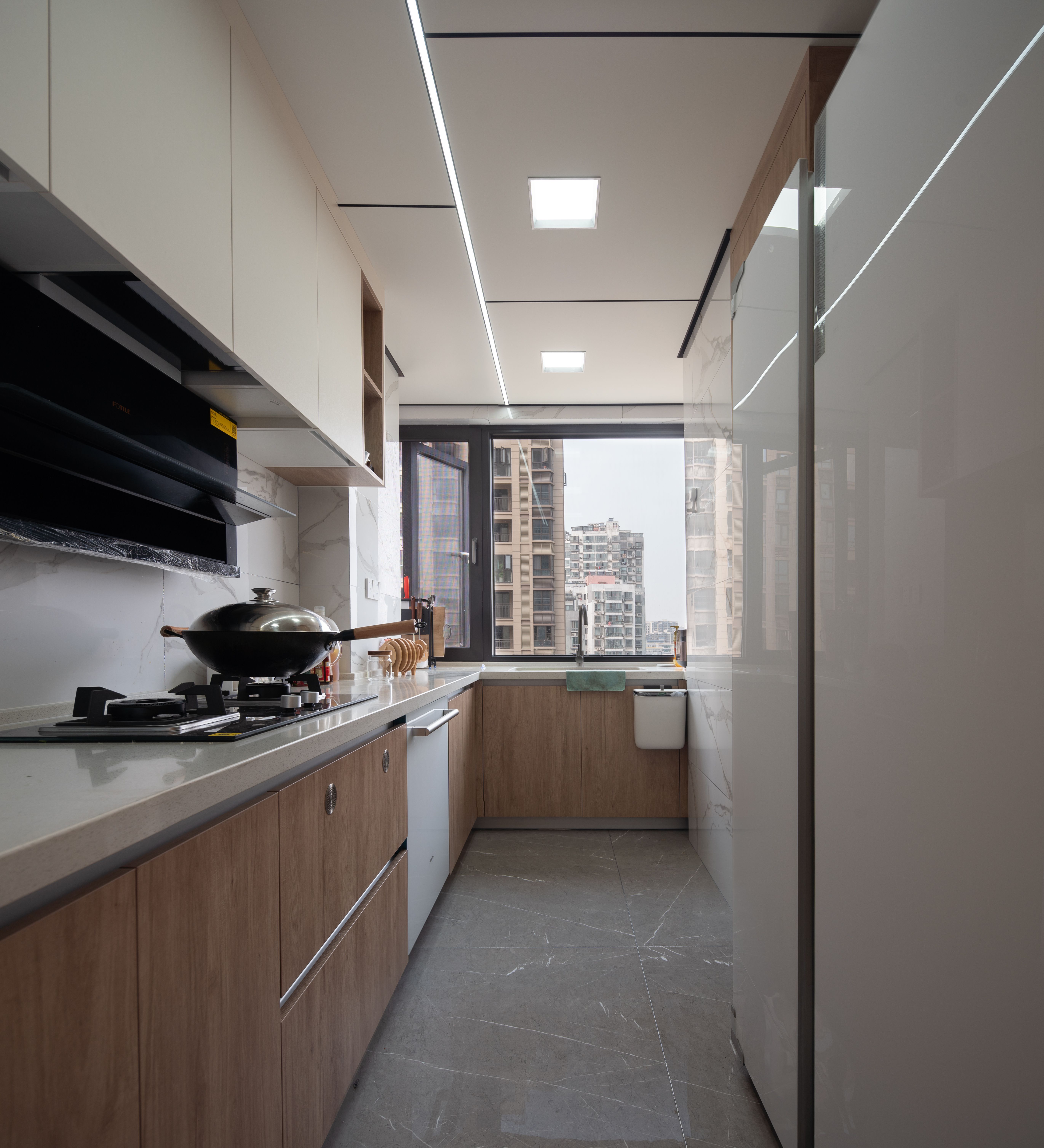 设计选材:重新规划后的厨房空间,来自小家的烟火气息,明朗的天然光线,温馨与自然融为一体,透过大片玻璃窗勾勒出全新生活的新动态。