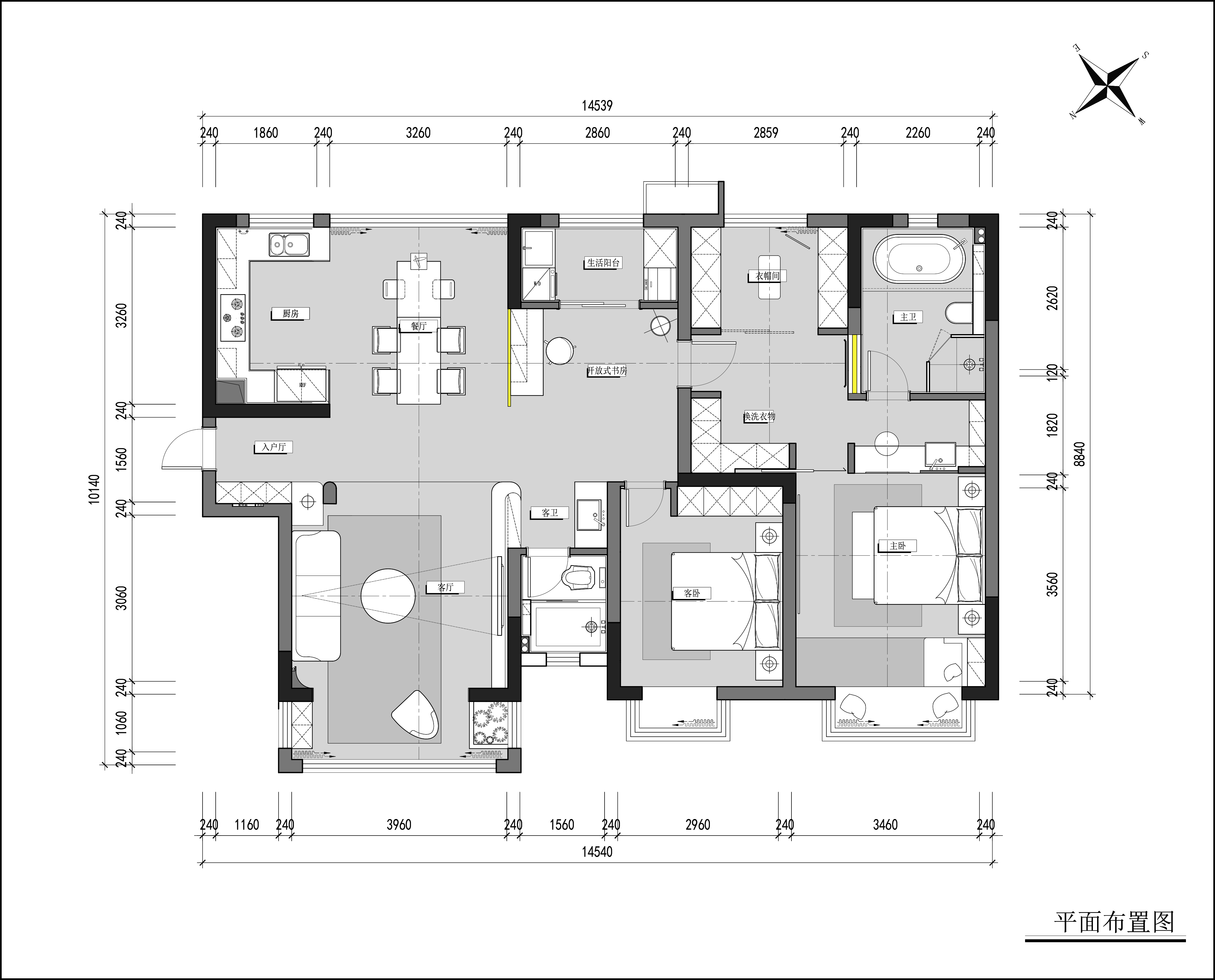 客厅、阳台、餐厅、厨房、书房整合在一起,更多的交流和互动。