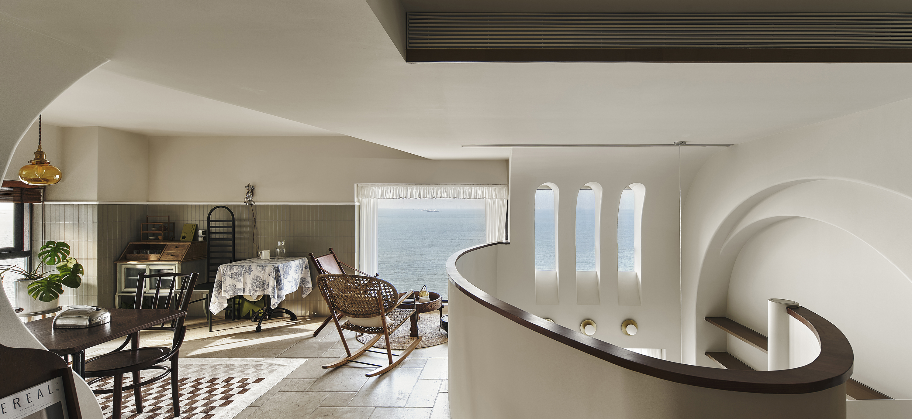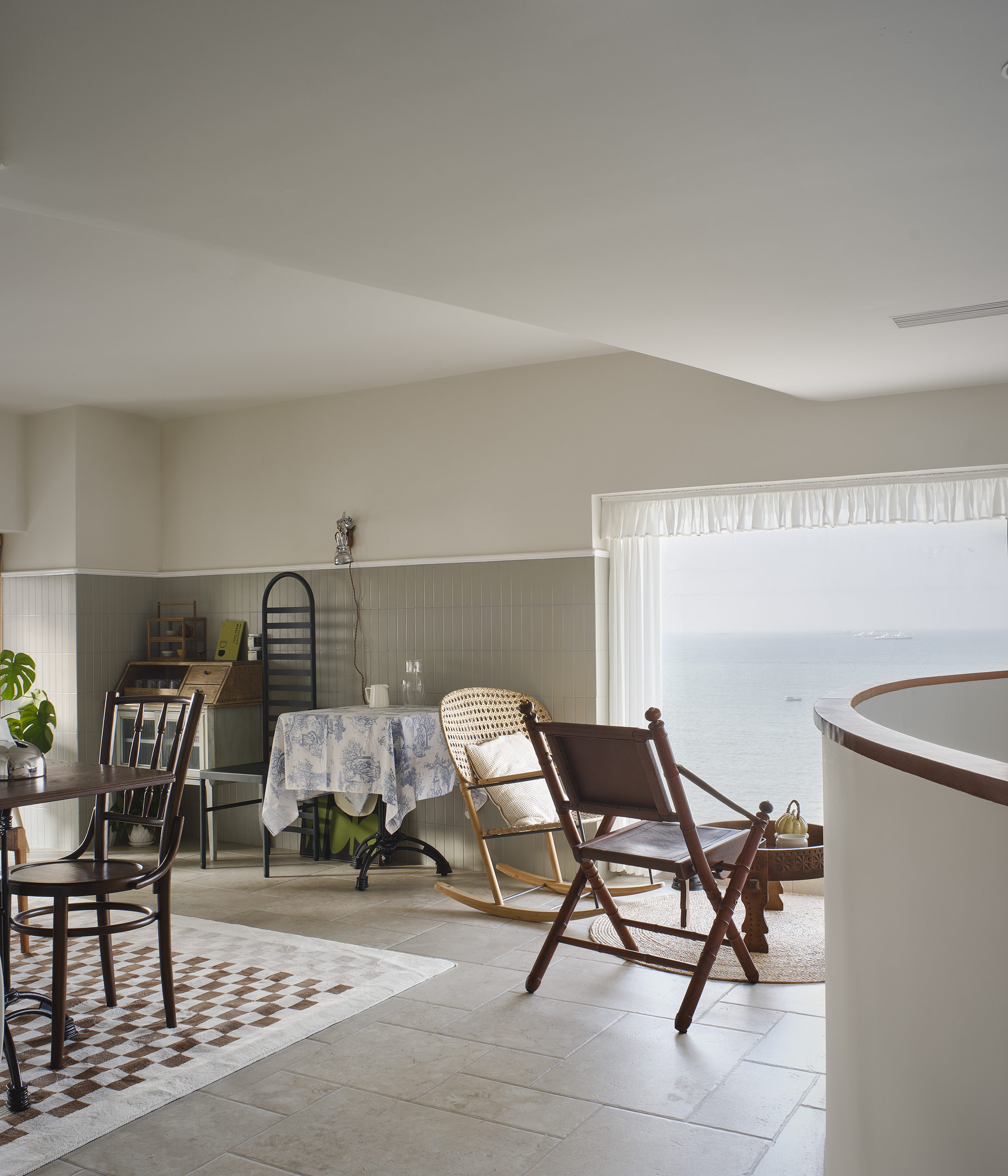 休闲区可容纳6-8人品茗畅聊。靠北窗区域可面海小憩,将海天尽收眼底。挑空区墙体拆除,制作可开窗使空间更明亮通畅,并且和楼下有互动可能