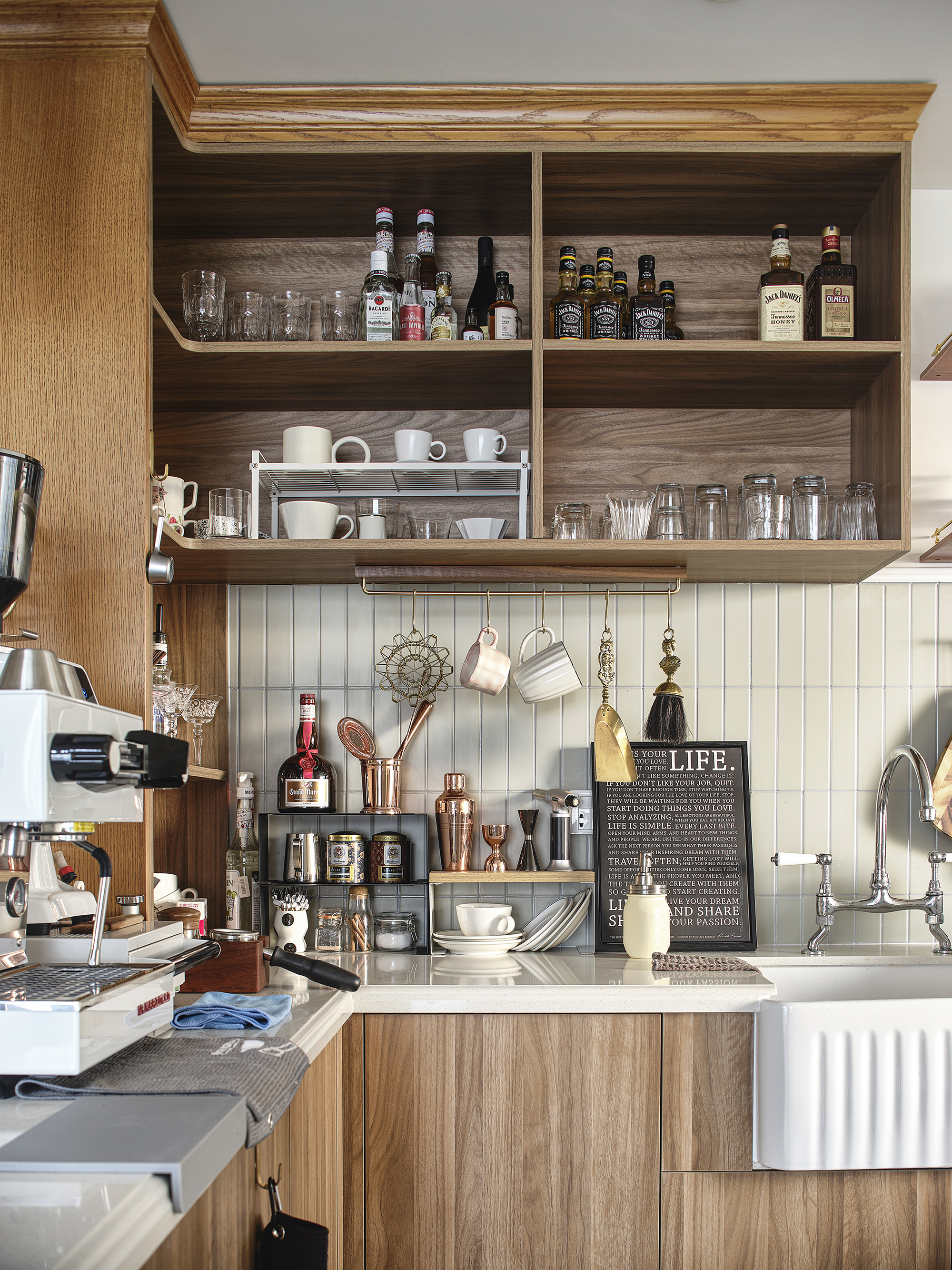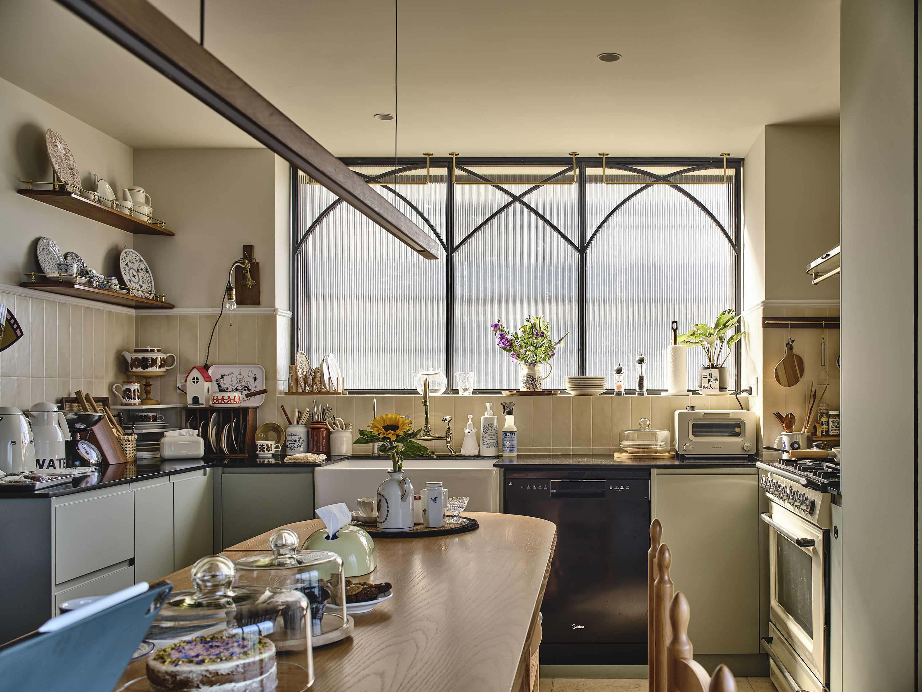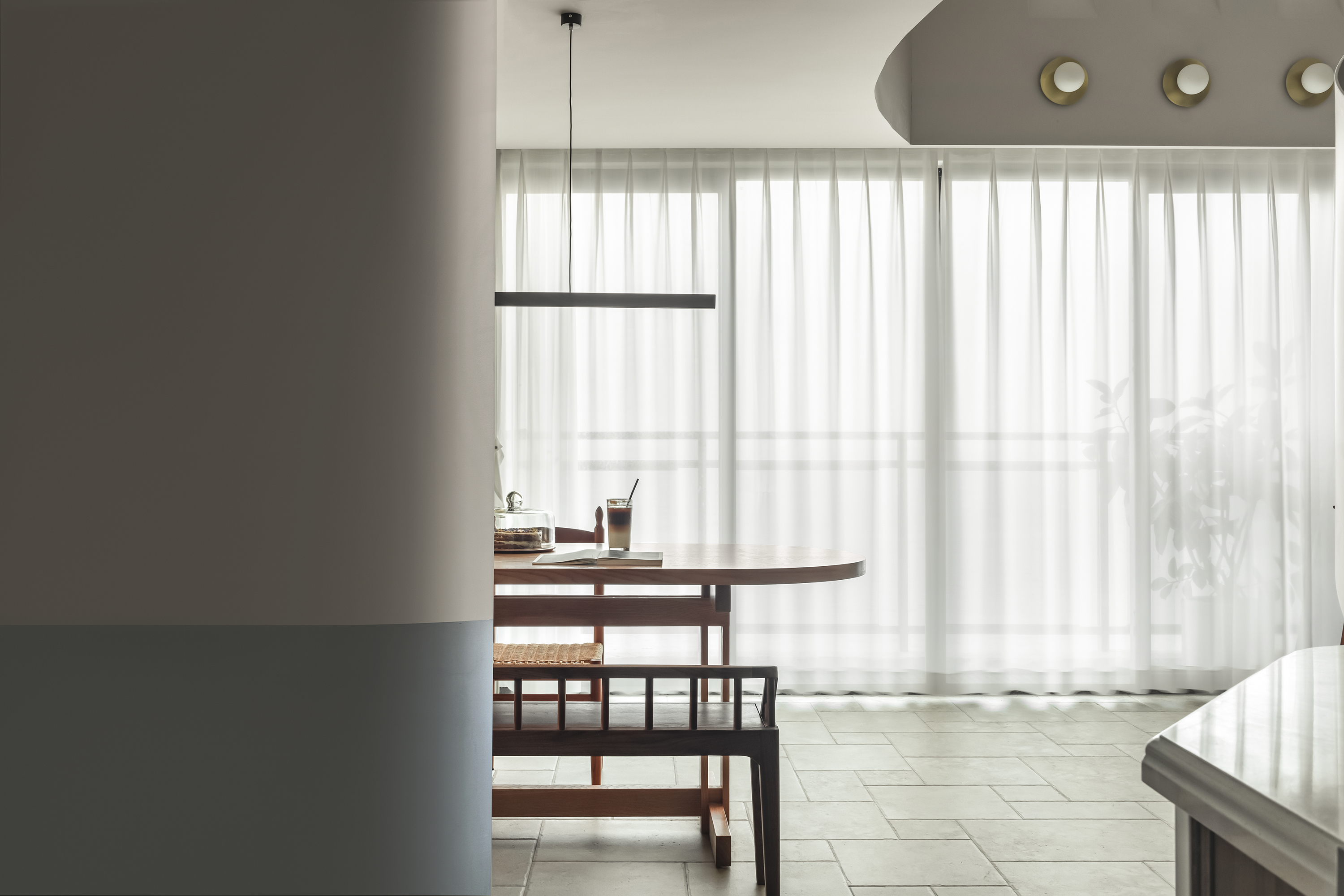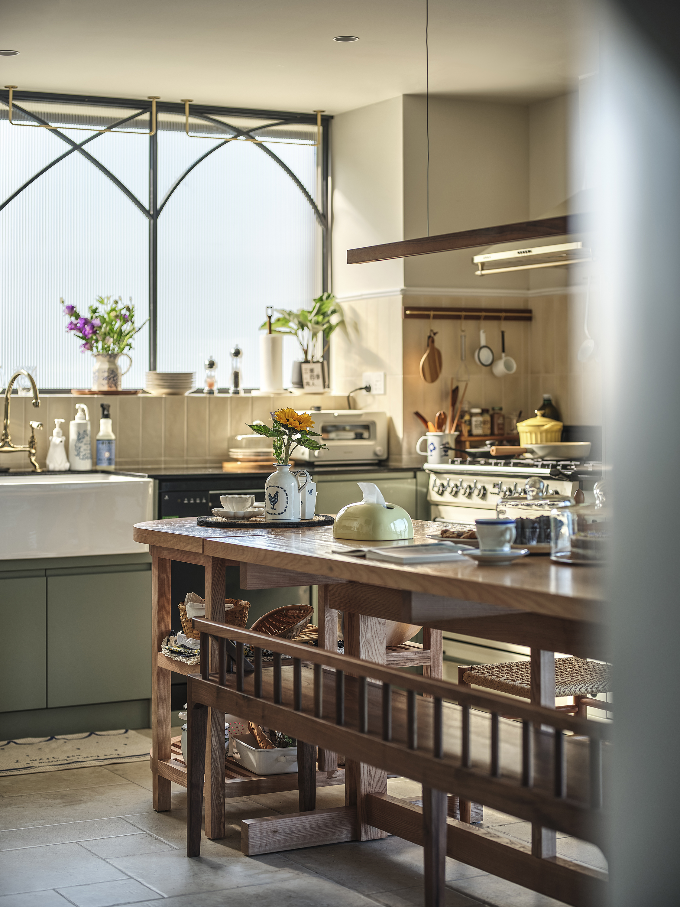 将厨房开放化,使之与会谈交流合并,界限上模糊,让空间开阔、自如。视线延伸的同时,增加人与人之间的互动;