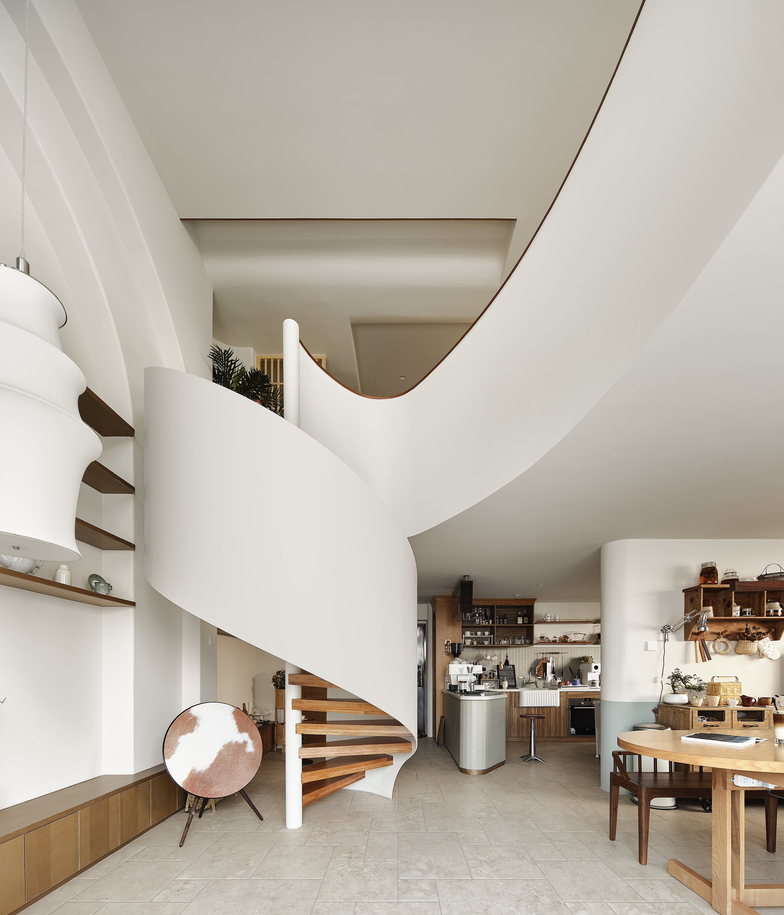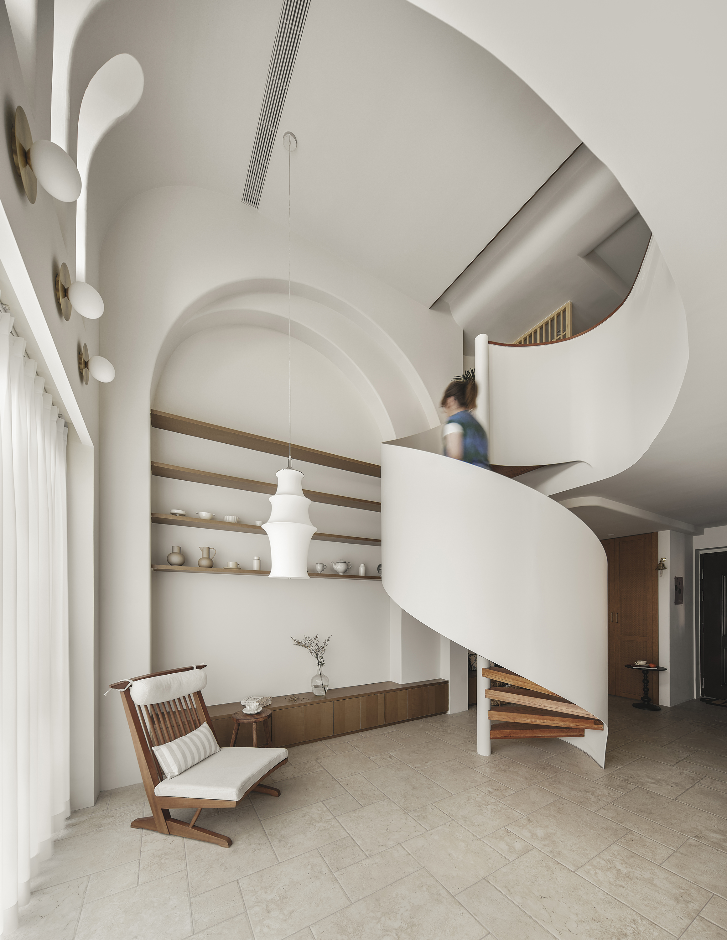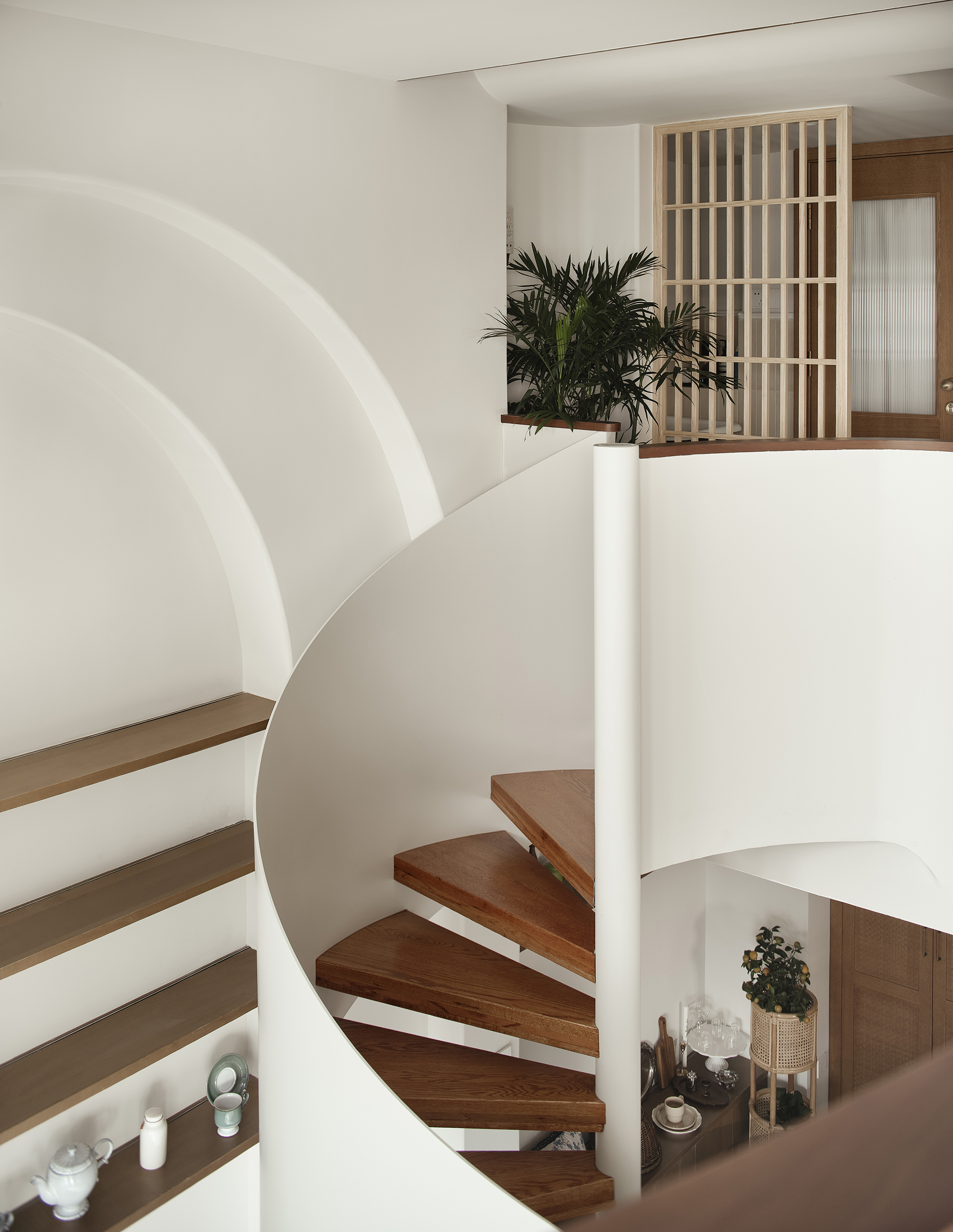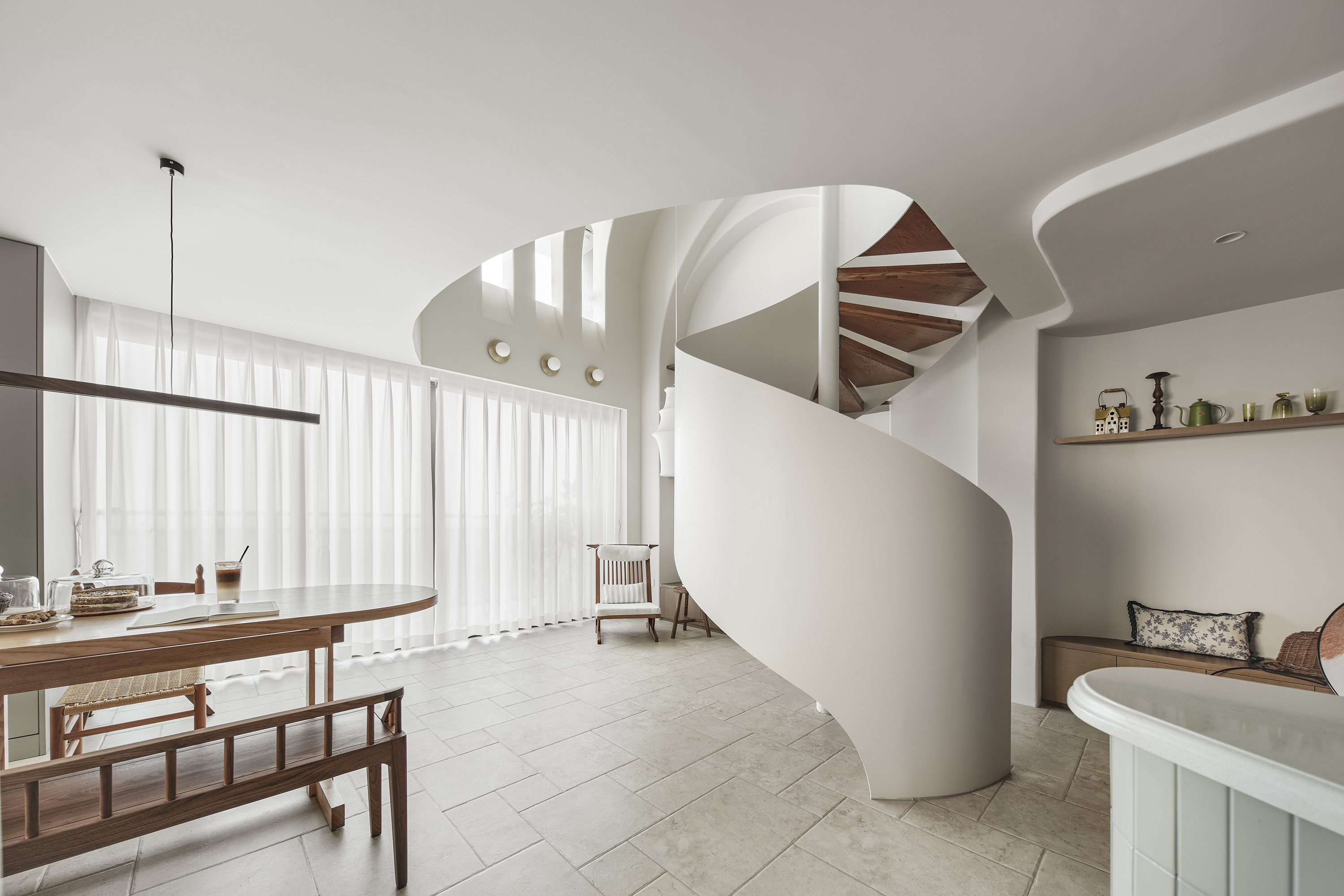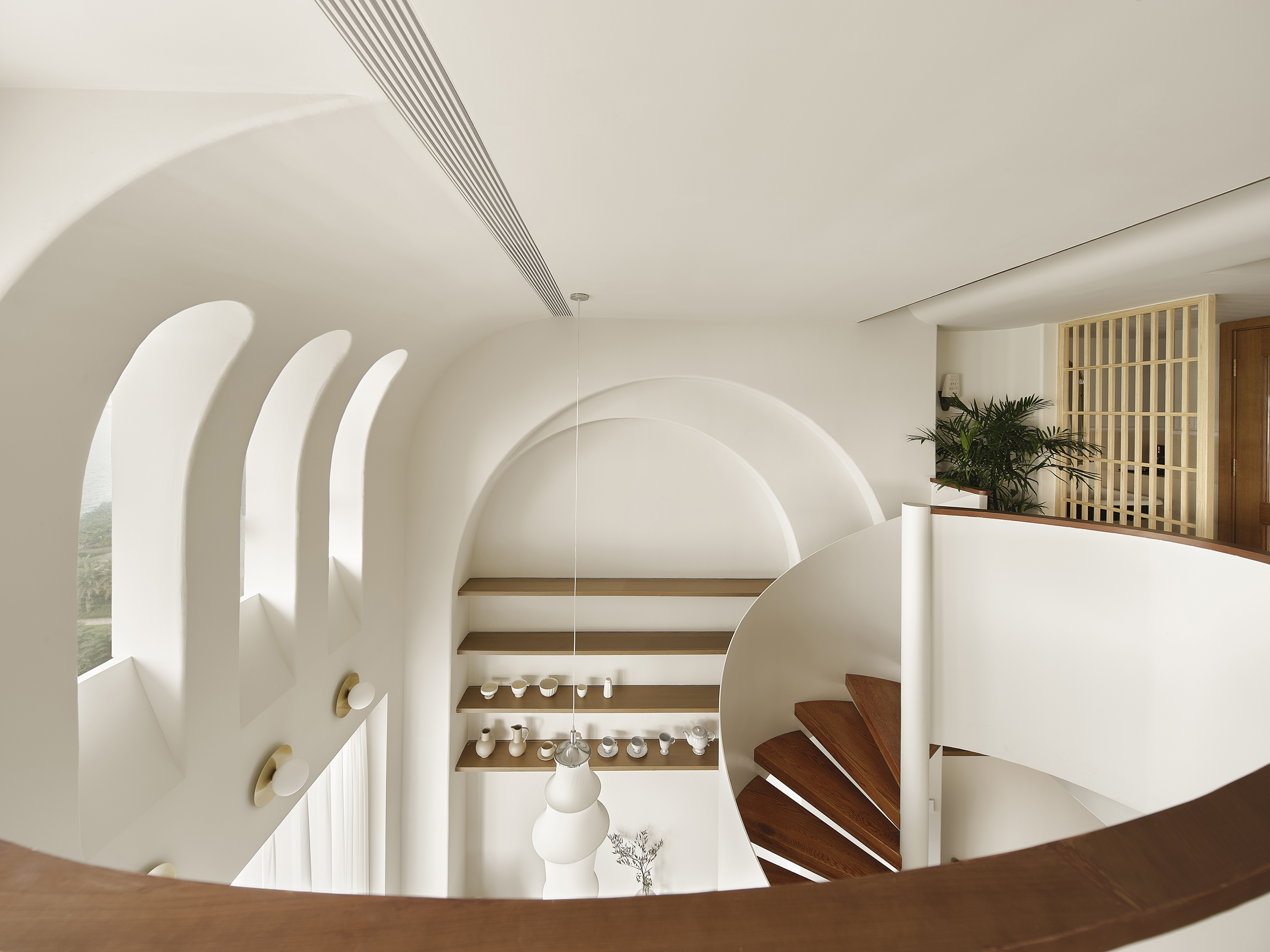⑤ 旋转楼梯的运用在解决上下楼功能的前提下,细节上将楼梯扶手和二层会客区连贯,流线型也更加柔美,和整体融合。旋转楼梯与二楼栏杆、半墙窗造型连贯一体,整体造型流畅、优美,使得两个空间能够平缓渡过;