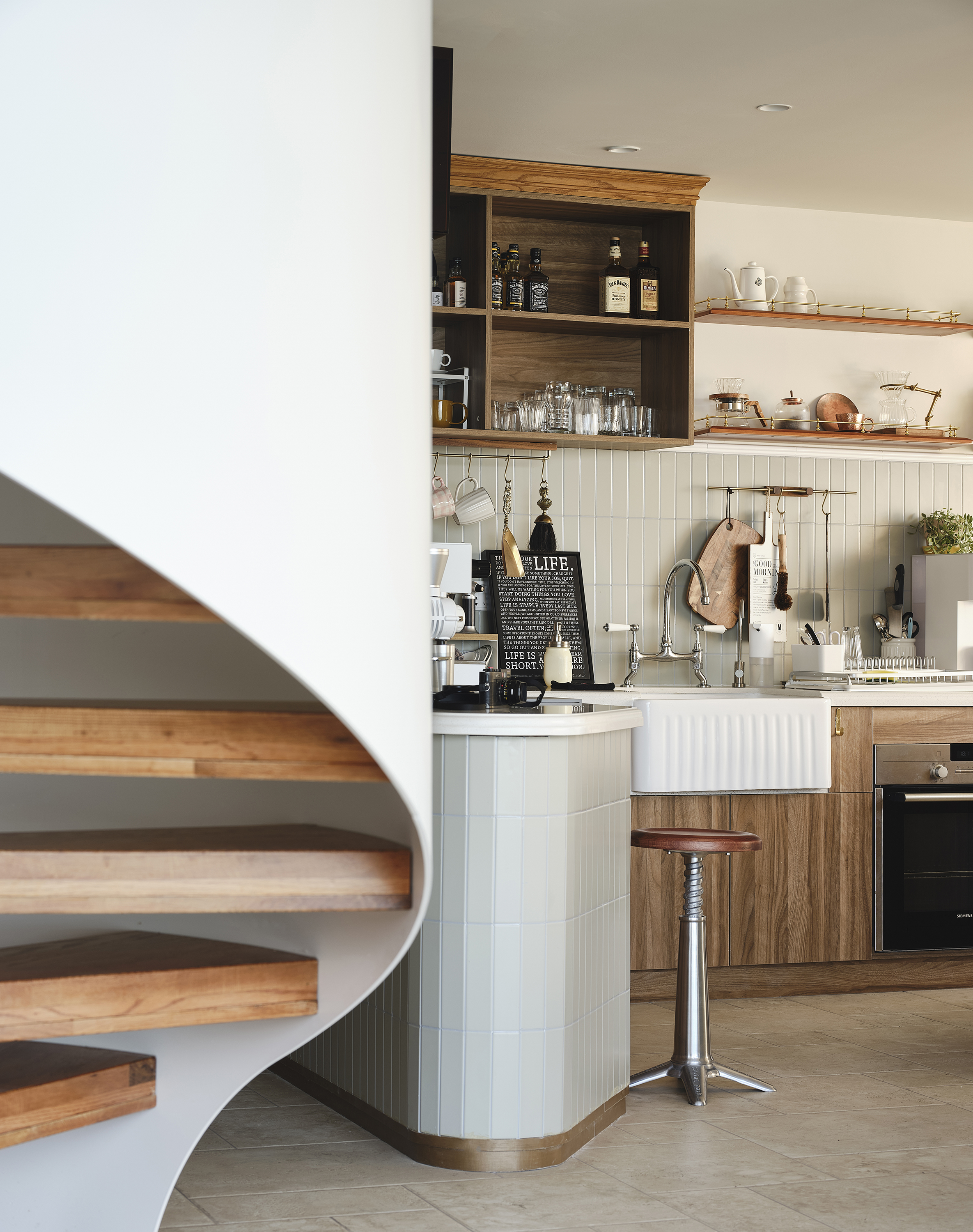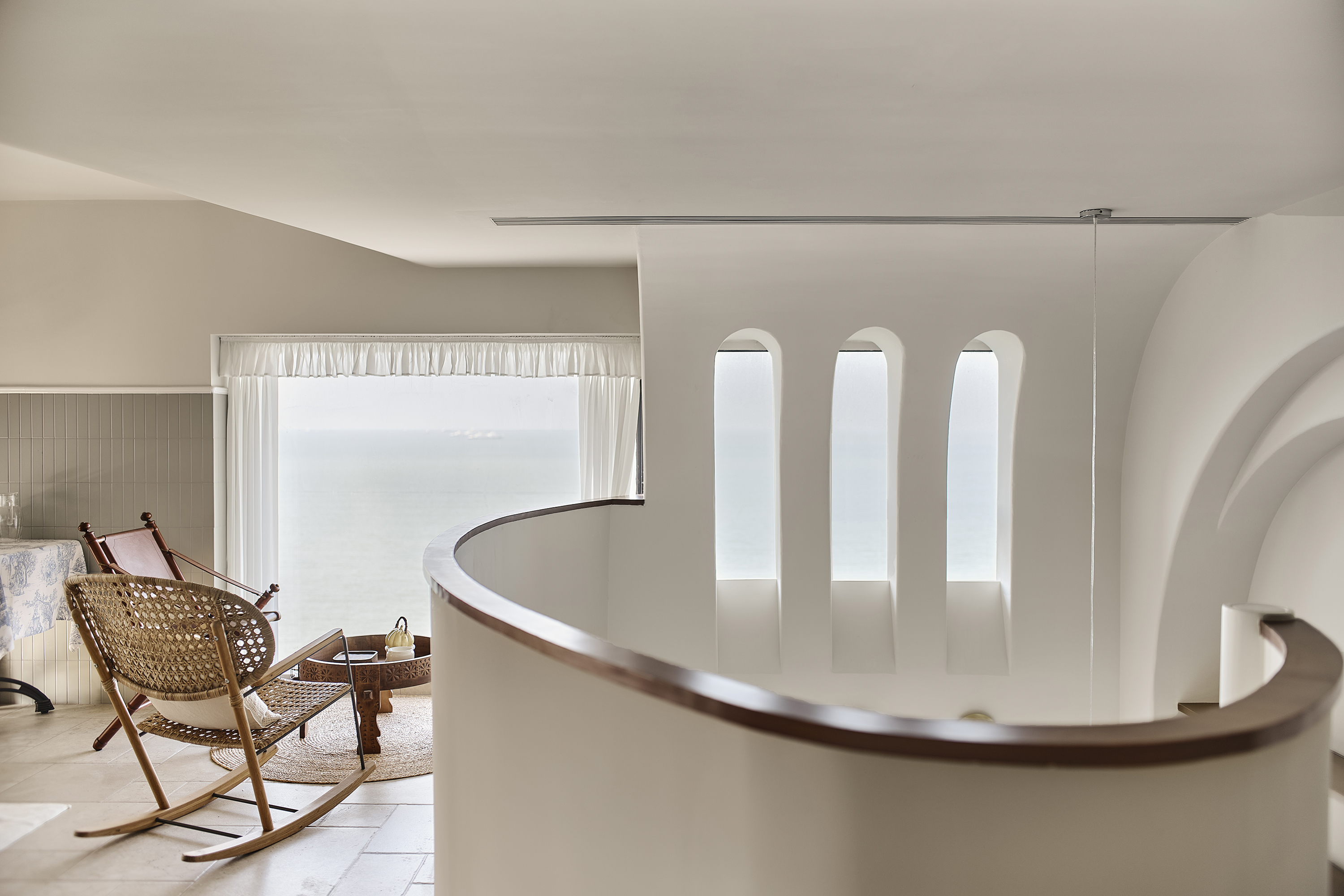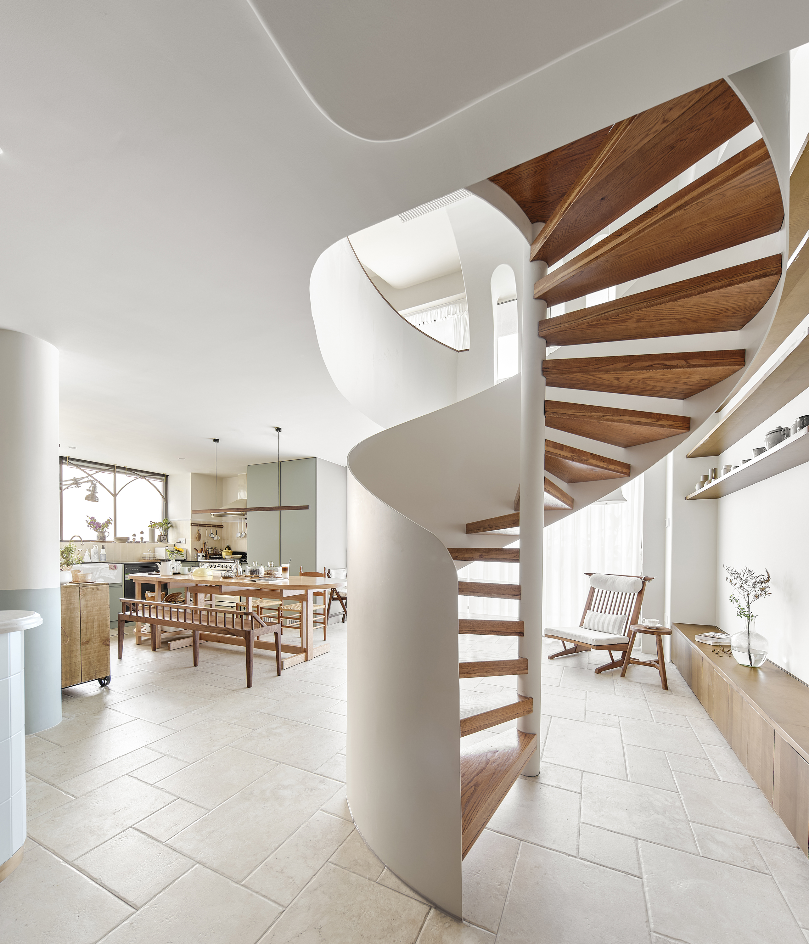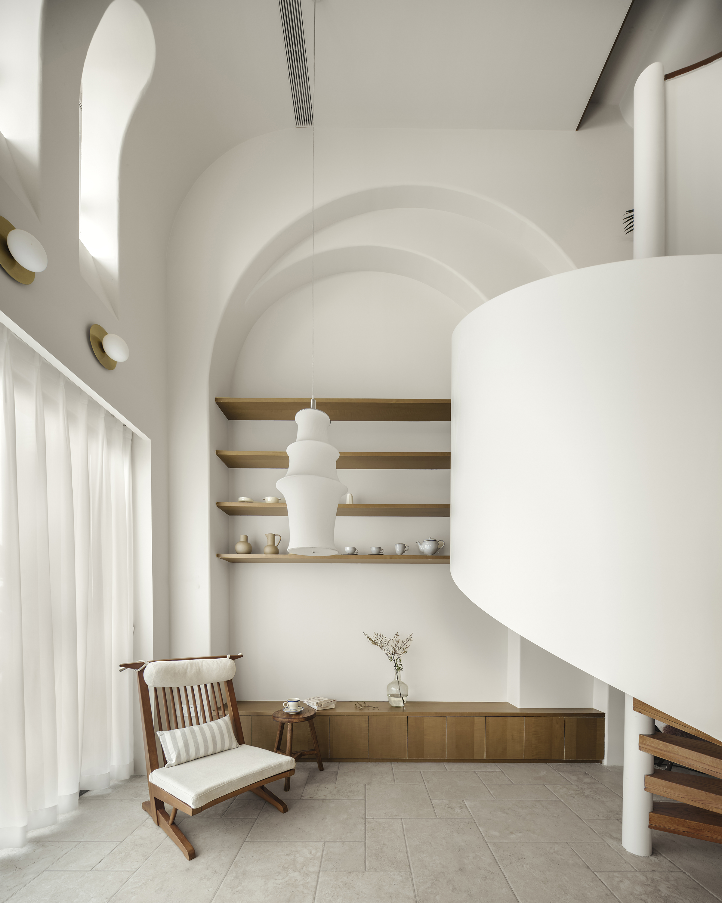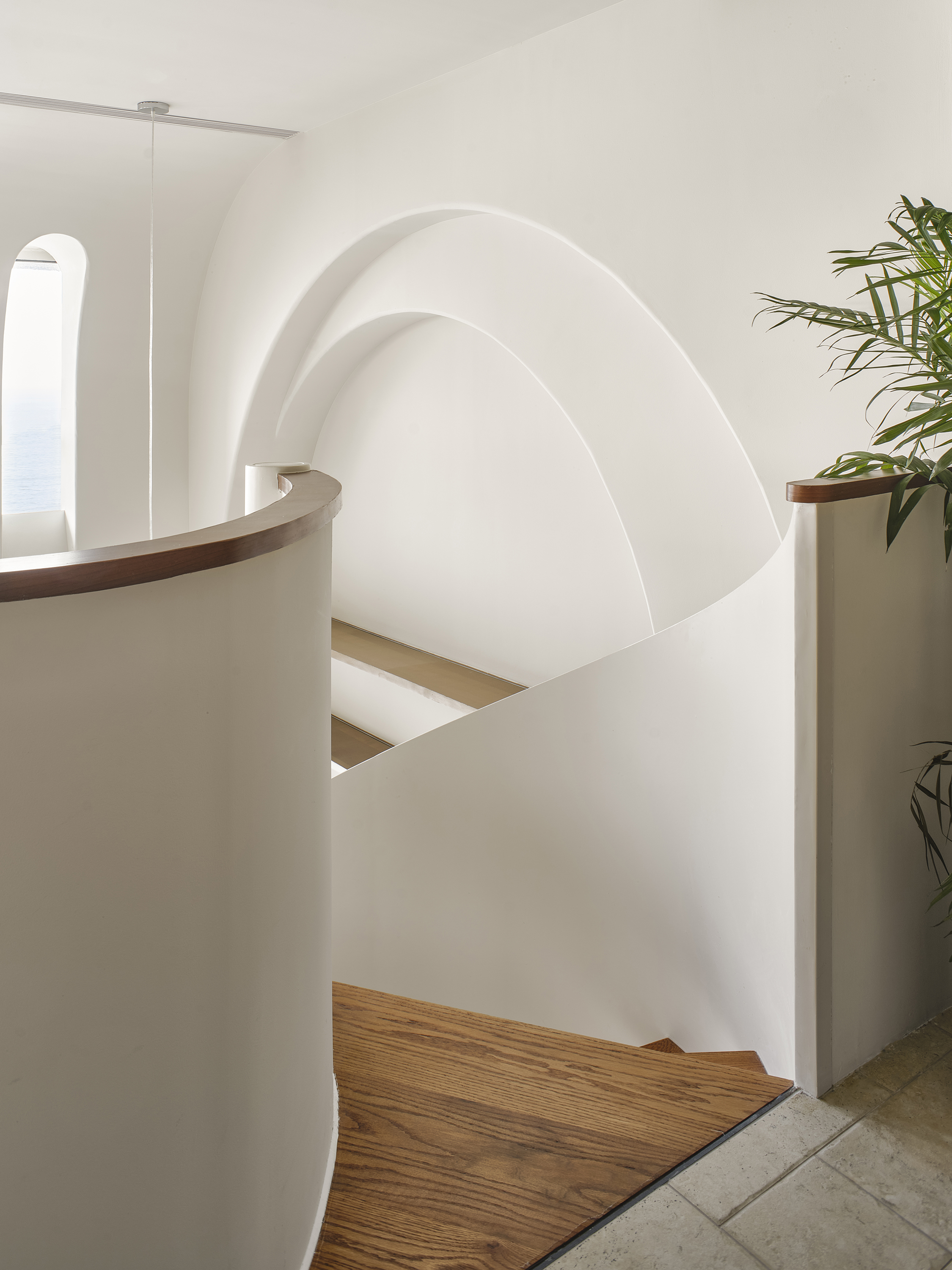 ⑤ 旋转楼梯的运用在解决上下楼功能的前提下,细节上将楼梯扶手和二层会客区连贯,流线型也更加柔美,和整体融合。旋转楼梯与二楼栏杆、半墙窗造型连贯一体,整体造型流畅、优美,使得两个空间能够平缓渡过;