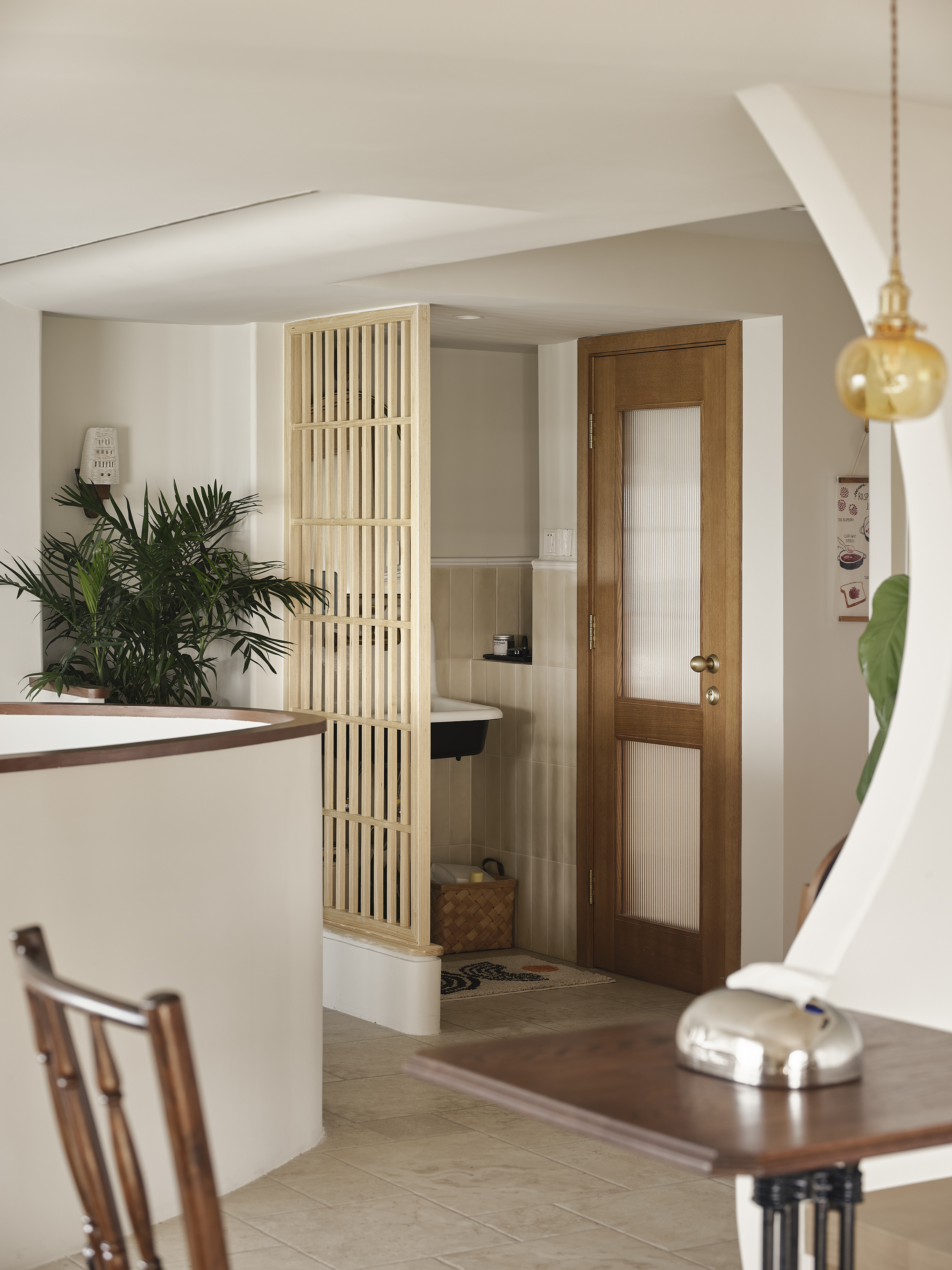 将卫生间干湿分离,通过半透隔断,让光线进入,但也一定程度上遮挡洗漱区,让空间干净灵活。