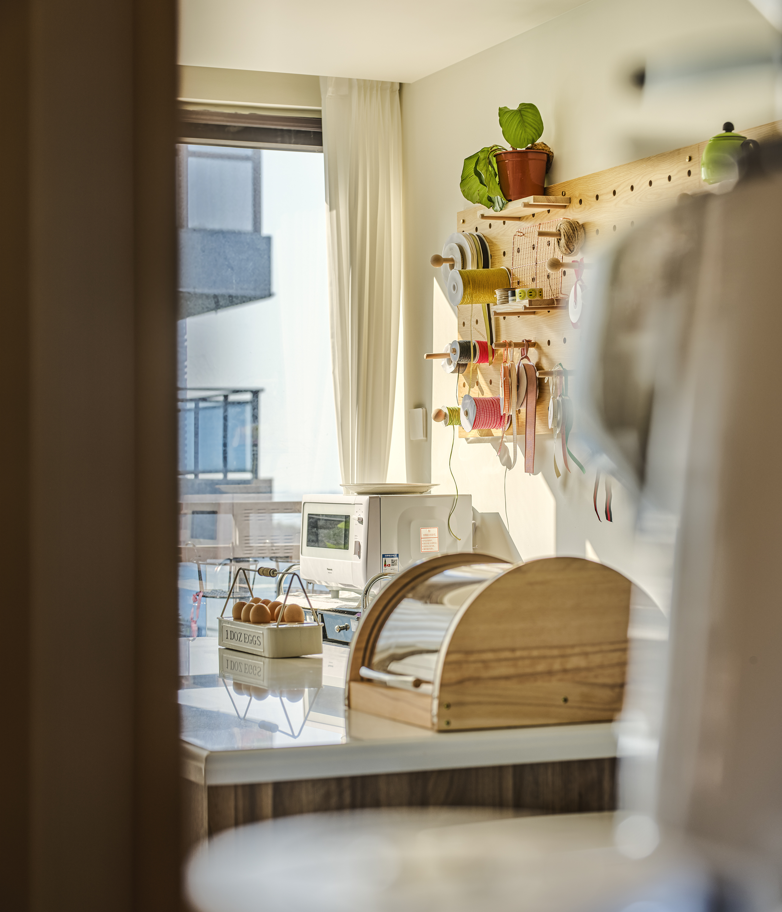 ② 利用部分释放面积,扩大定制操作区,让工作更随意顺心,操作区与咖啡区之间通过软性隔断分割,让空间自由通透,开放自如;
