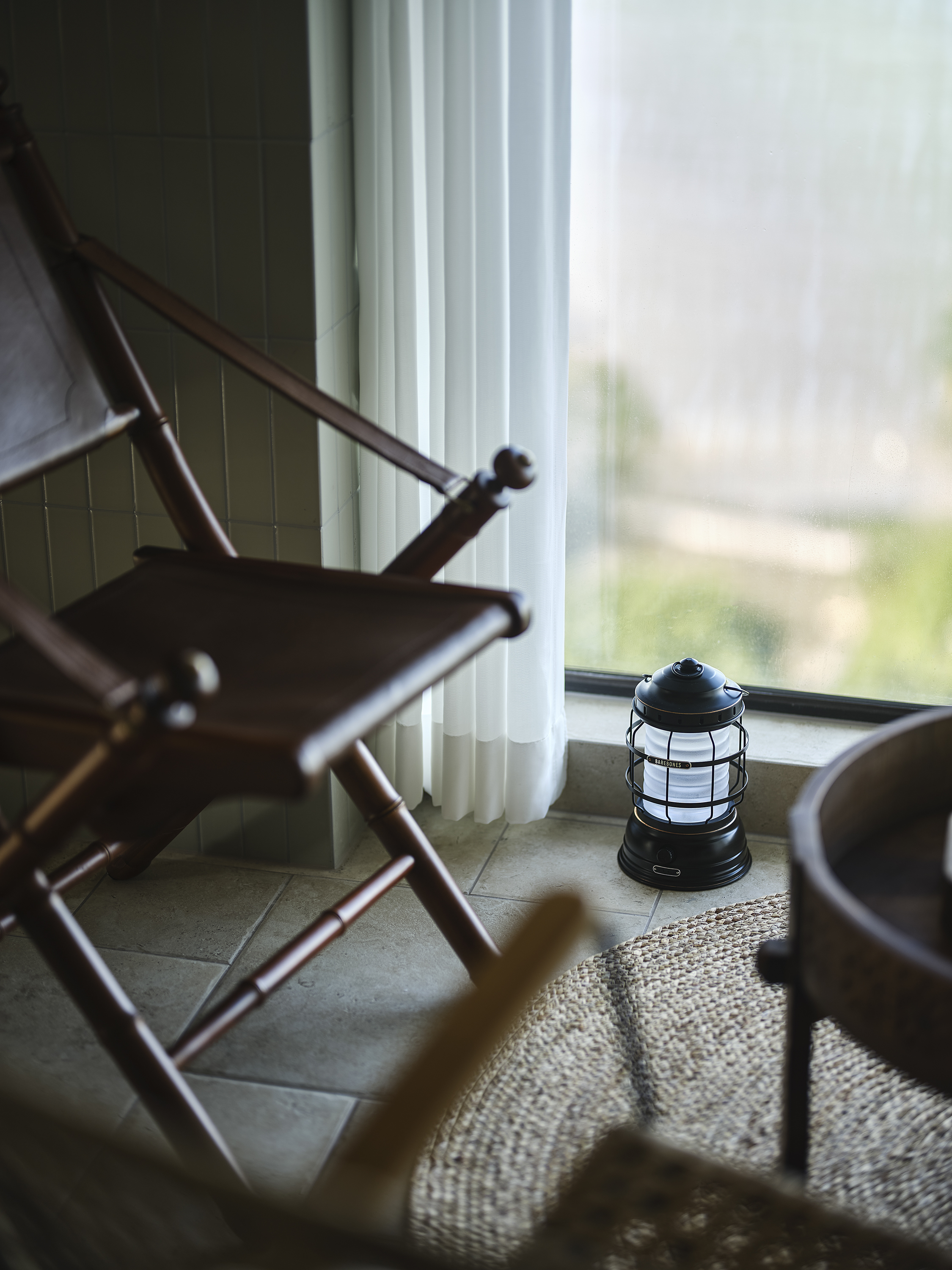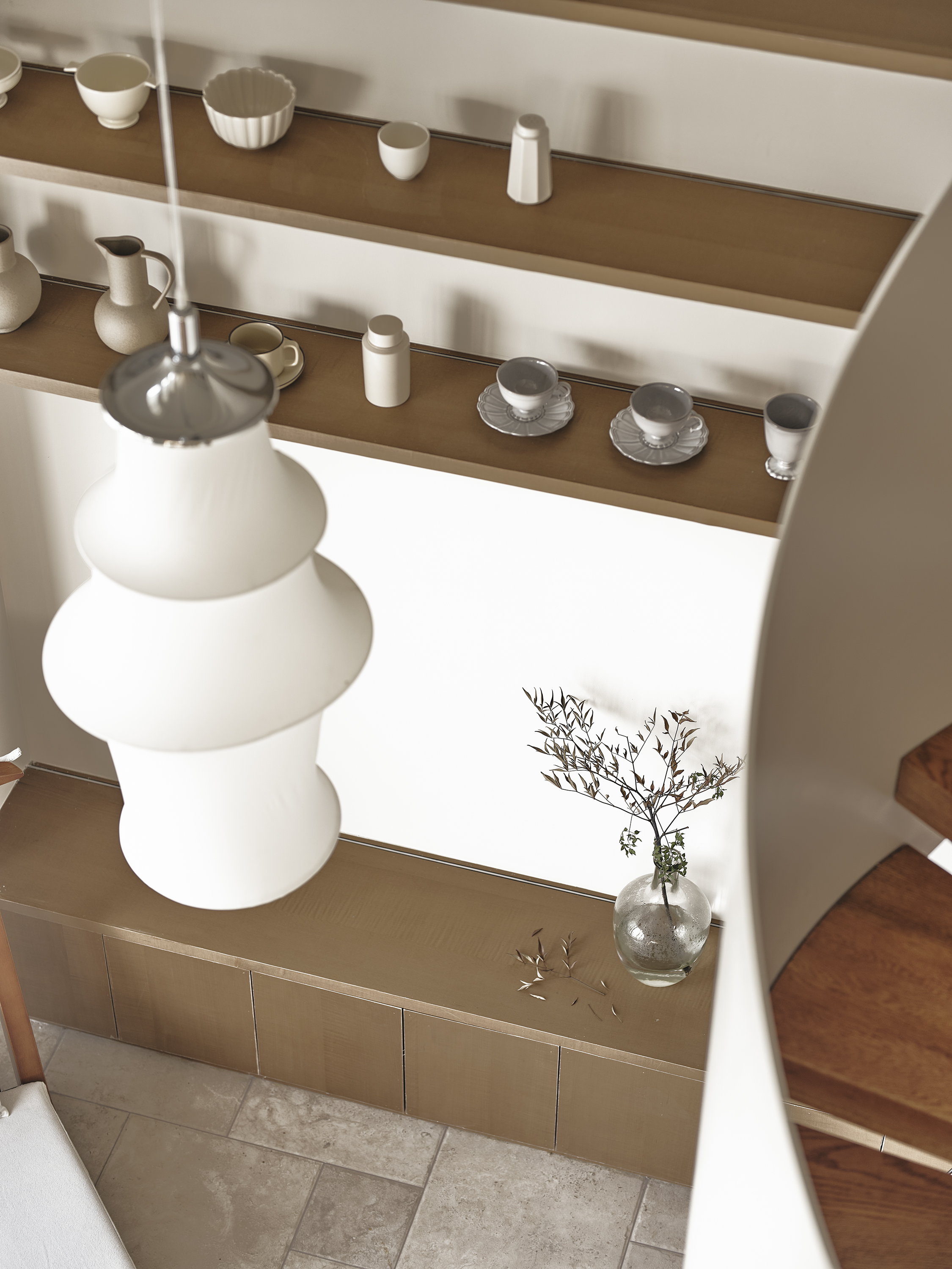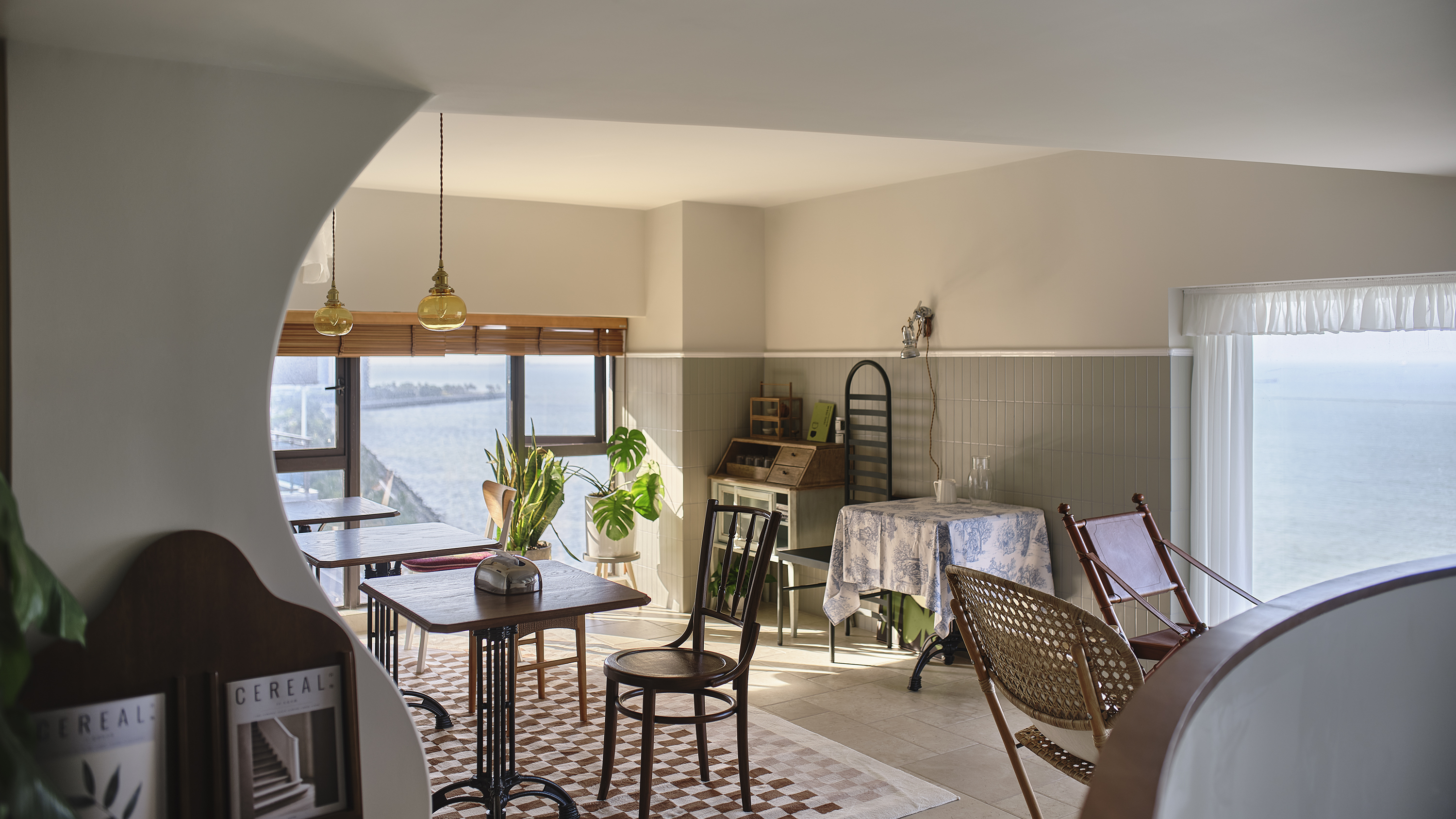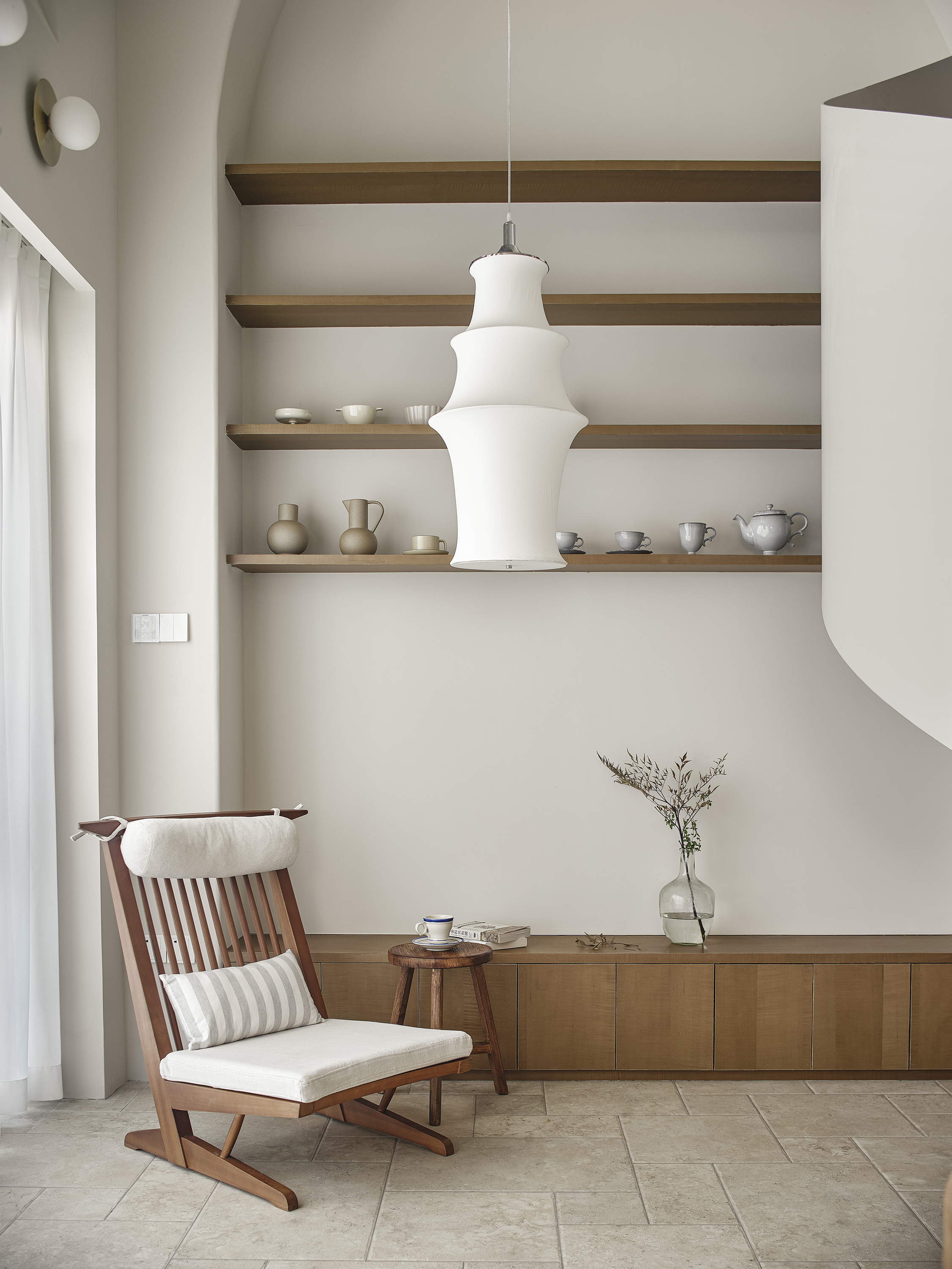使用5米挑高区制作开架展示区,安放器皿和饰品突出主题,生活化。同时可布置灯光,使之成为营造氛围利器,让人过目不忘。布置单人位,在忙碌完一天工作后可在此坐观海面放空;