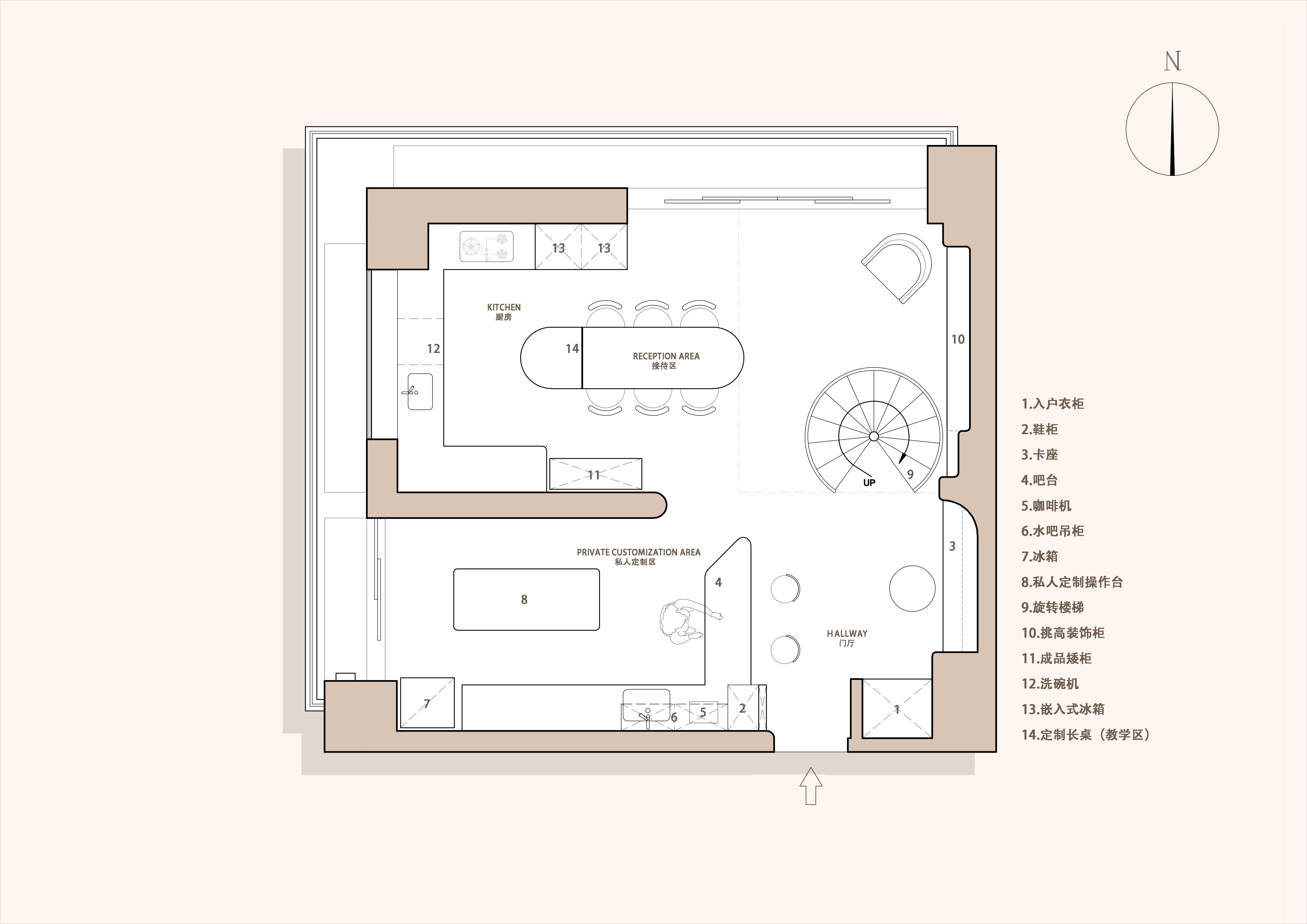 空间布局:① 调整楼梯位,释放门厅,改善入户印象。置入功能设备,如咖啡区吧台、卡座、鞋帽柜、展示等。对视线和动线进行引导,此区域也是一个小型互动区域;
