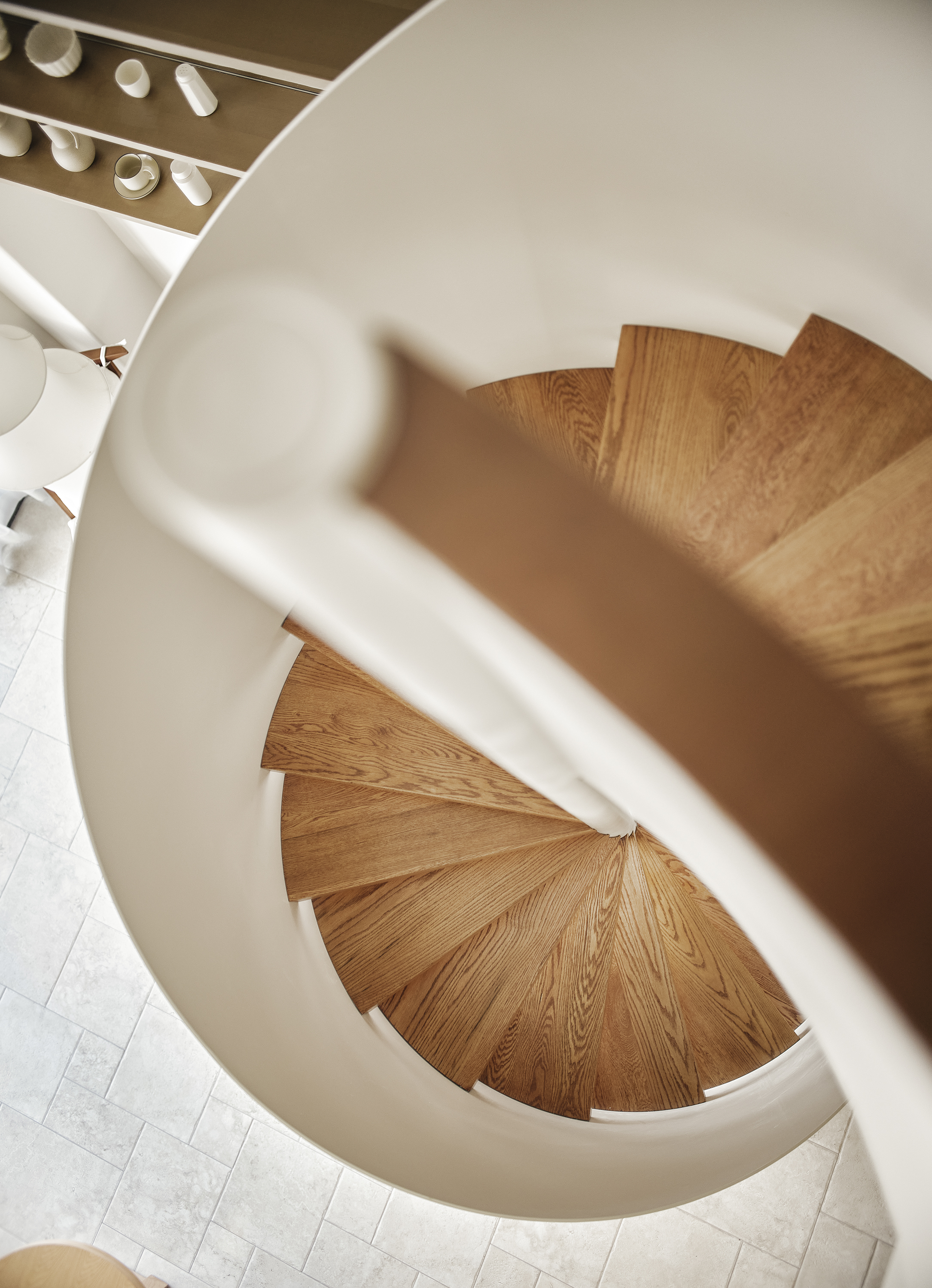 旋转楼梯的运用在解决上下楼功能的前提下,细节上将楼梯扶手和二层会客区连贯,流线型也更加柔美,和整体融合。旋转楼梯与二楼栏杆、半墙窗造型连贯一体,整体造型流畅、优美,使得两个空间能够平缓渡过;