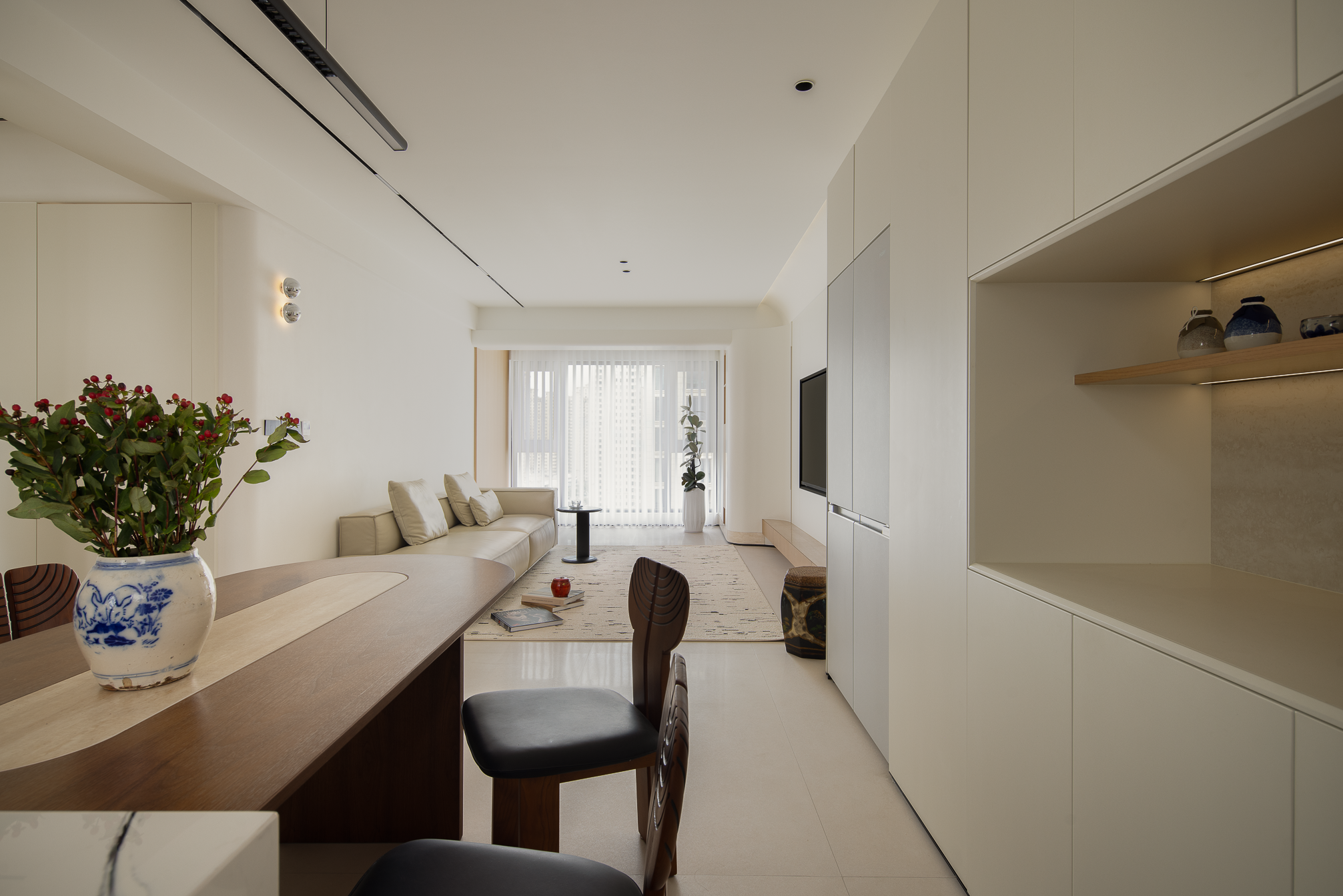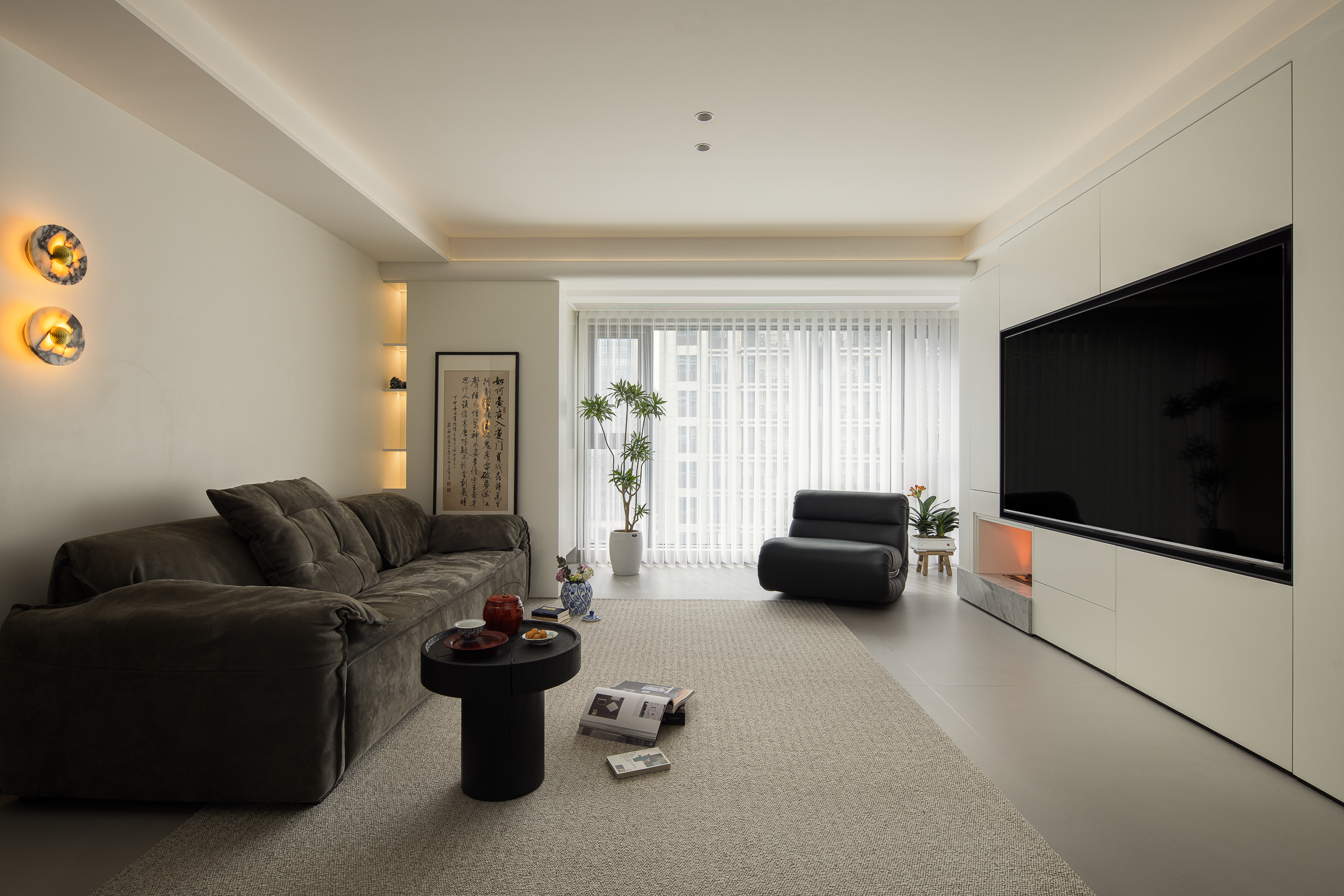联动造景 在客厅与书房之间,通过可推开的隐藏式移门形成两处空间的联动,人为造景,以结构成框,让空间本身成为会动的相片。而开阔的机构,增强视觉的延续感的同时,也拉进了人与人,人与空间沟通的距离。