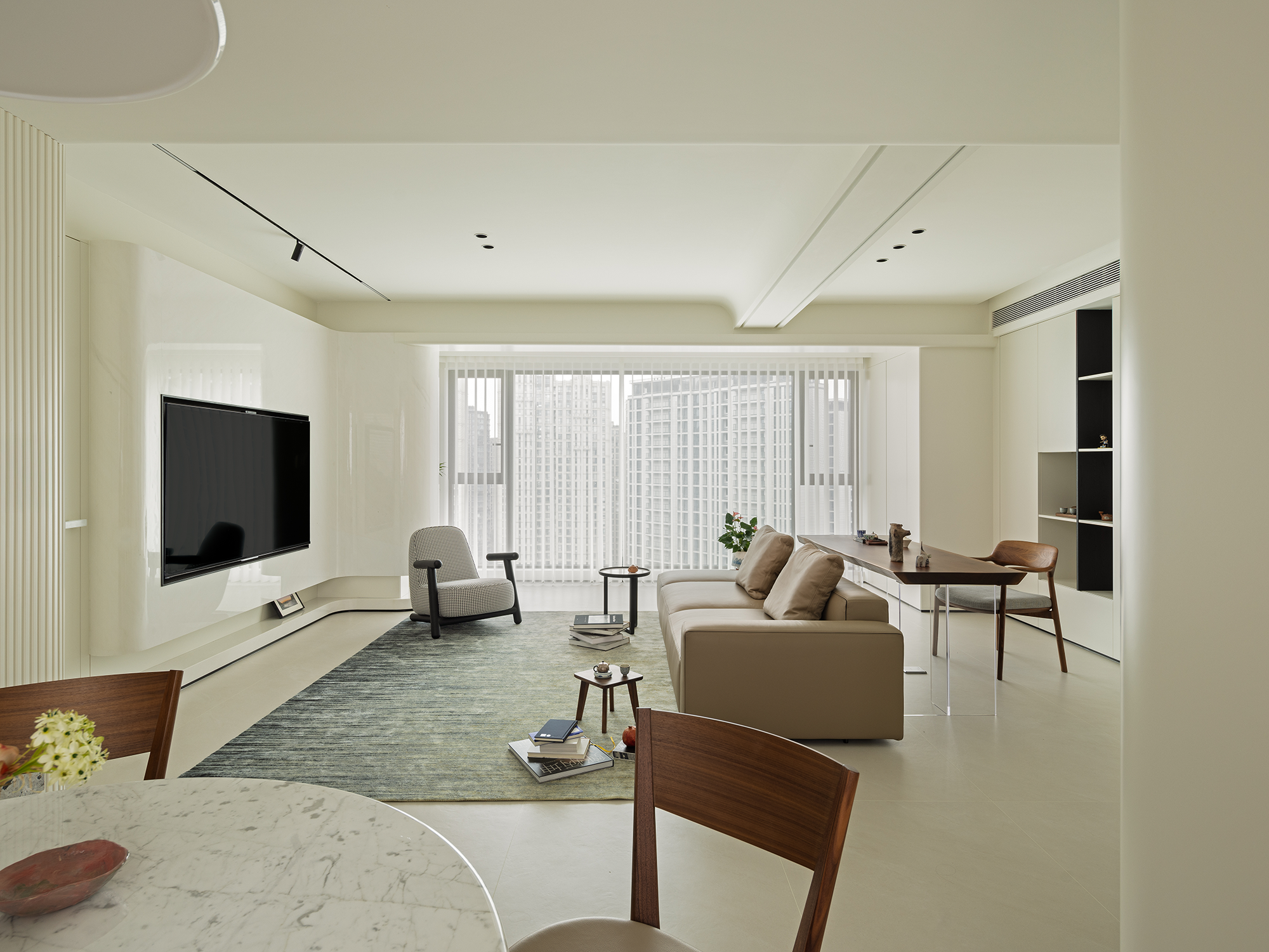 入室见光。 以一盏轻巧的吊灯打下亚克力换鞋凳的影,形成五彩斑斓的初印象。镂空设计的玄关与透明的换鞋凳,降低空间的厚重感,带来轻巧细腻的体验。玄关的“轻”,与客厅的“重”形成对比,极具层次感。