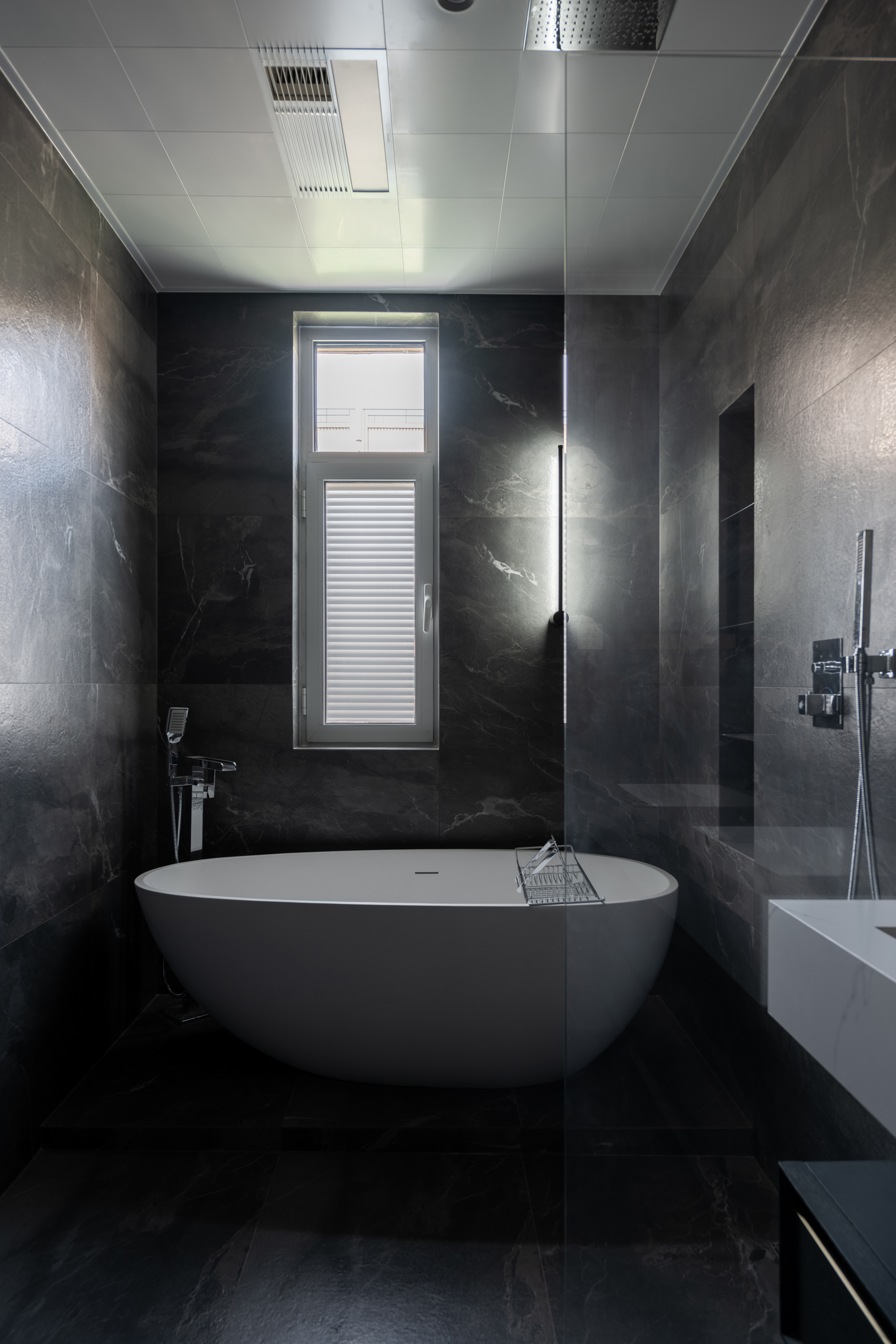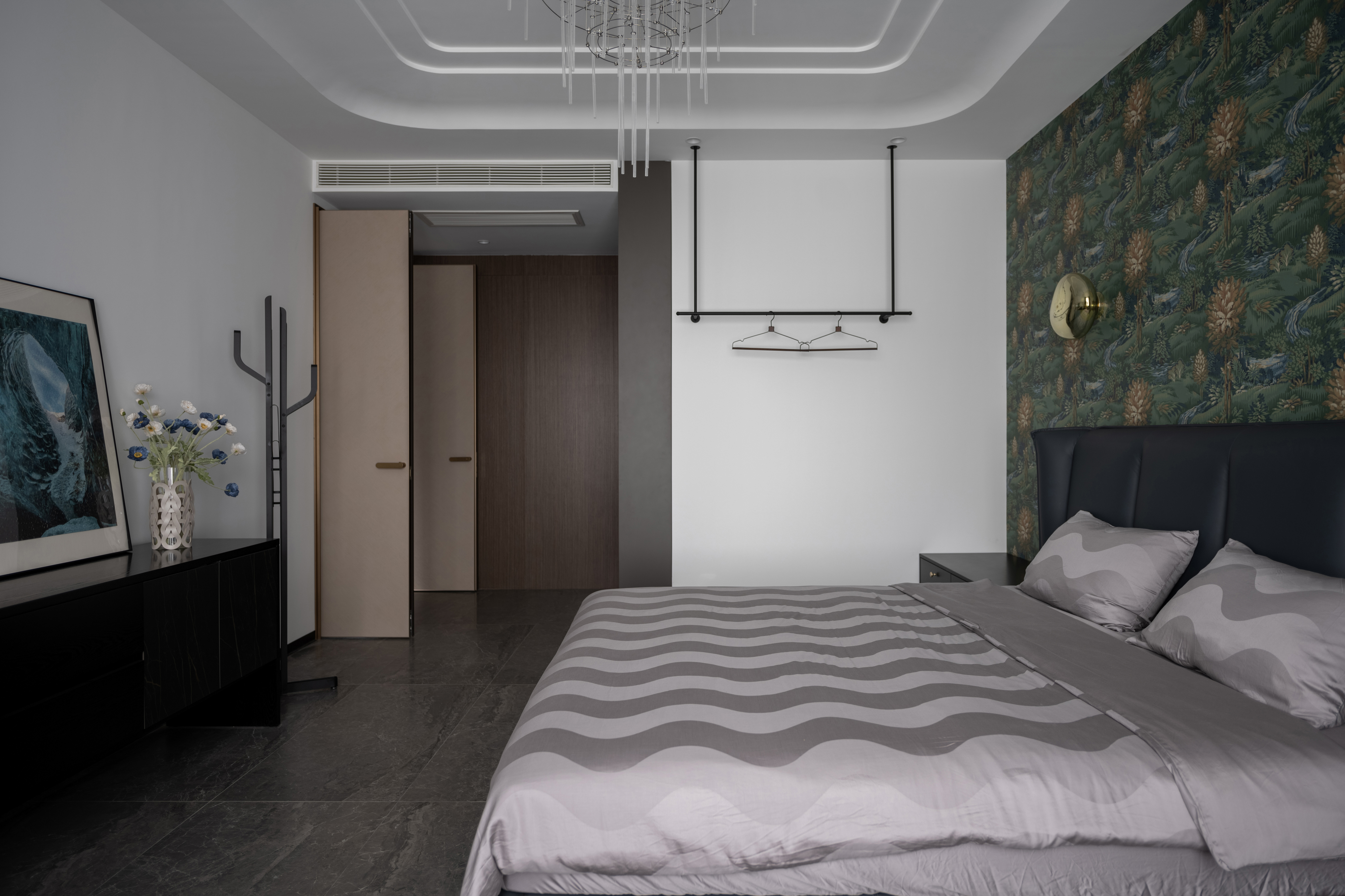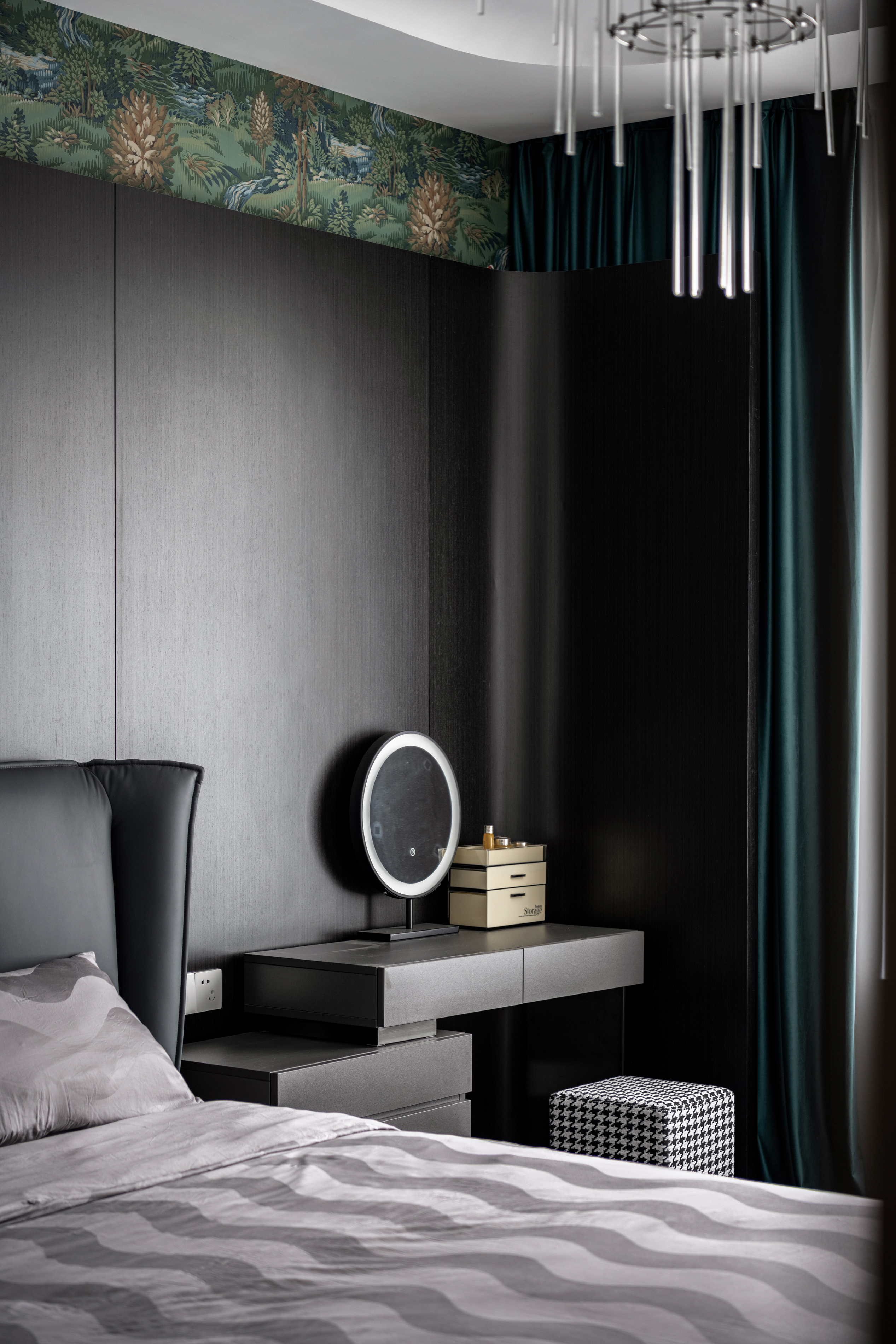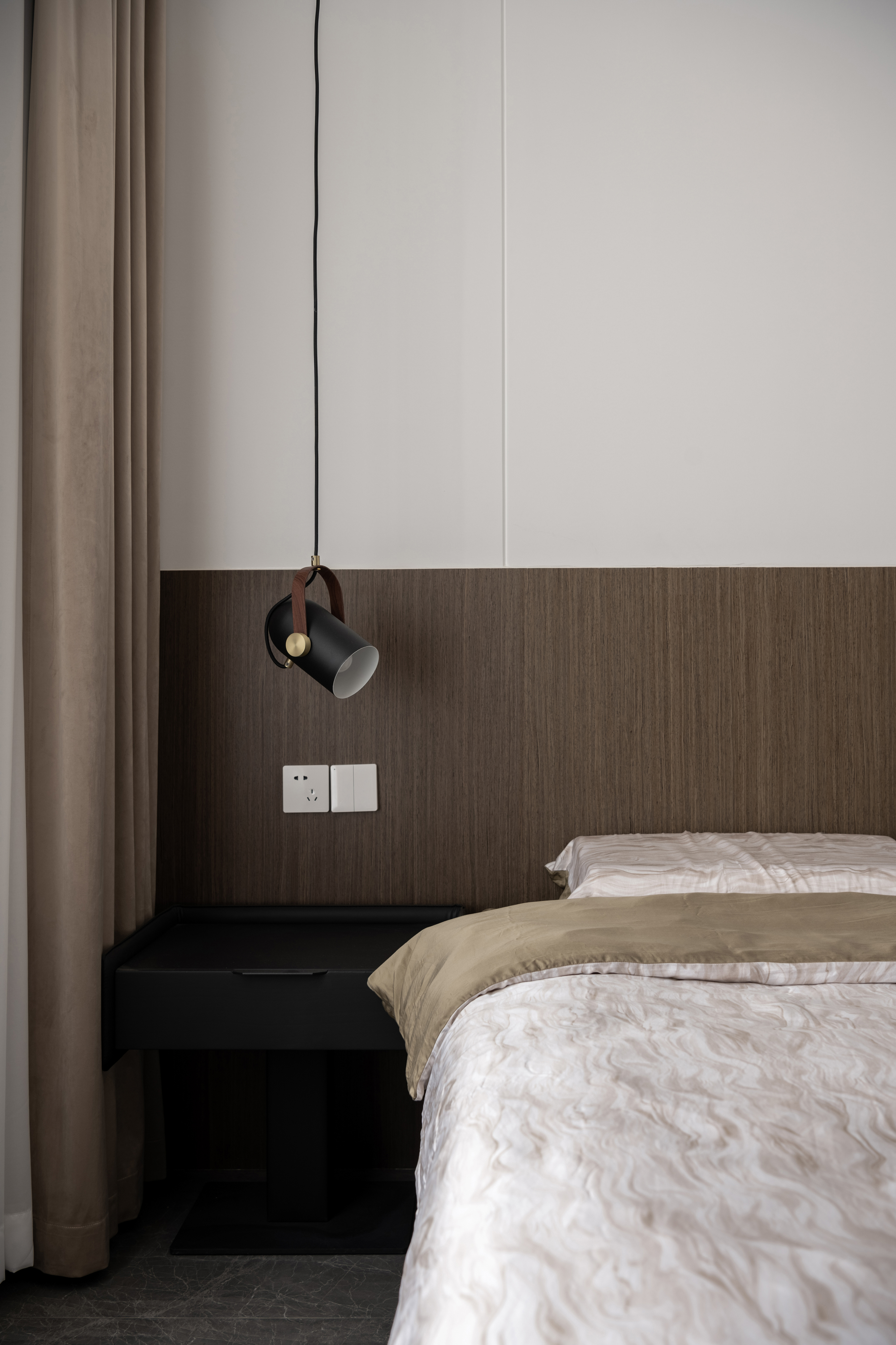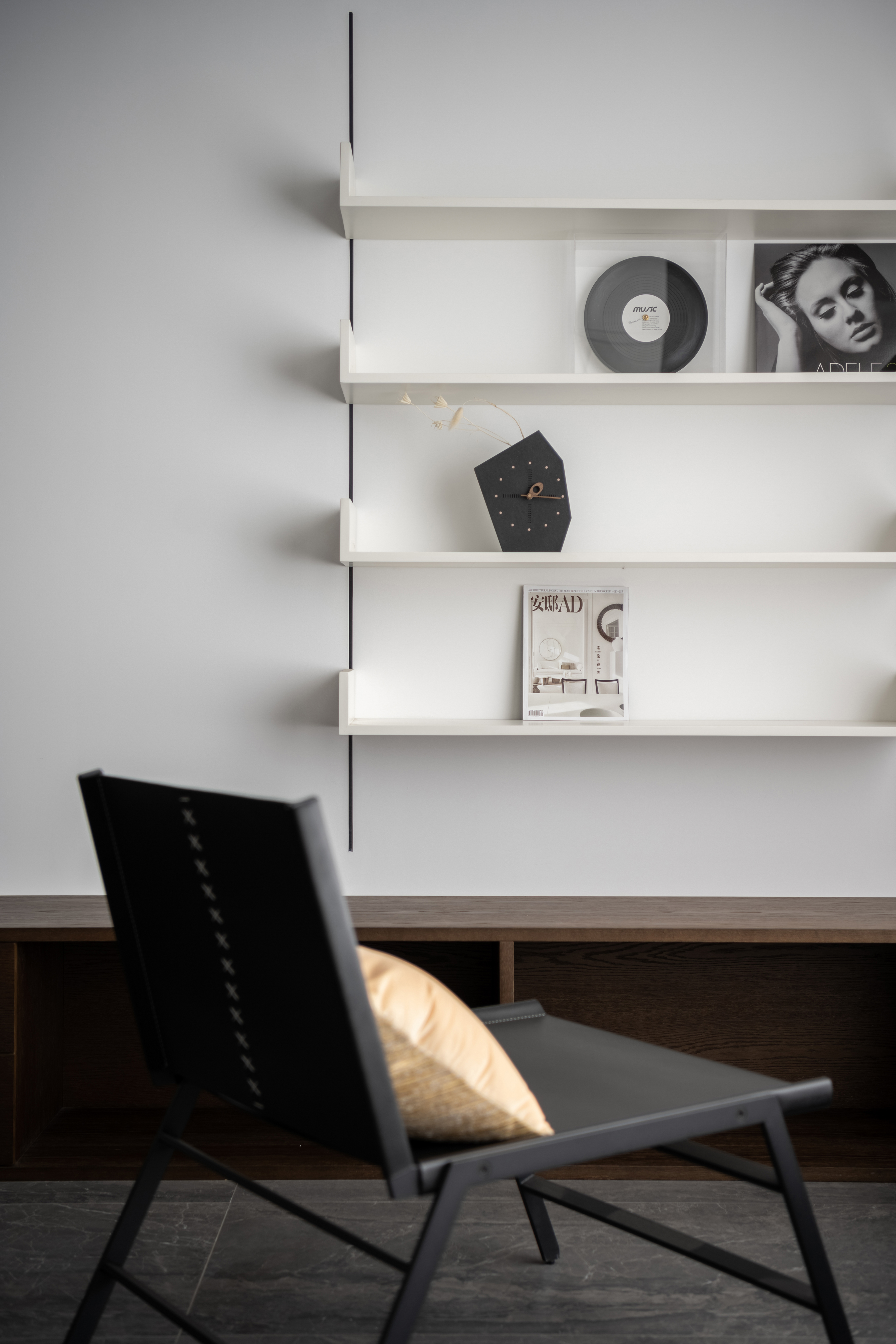 设计选材:空间整体在保持白墙的同时分别用黑胡桃/壁纸/石材/金属板做了局部立面,通过局部应用高品质材料的手段来呼应低碳与经济学。
