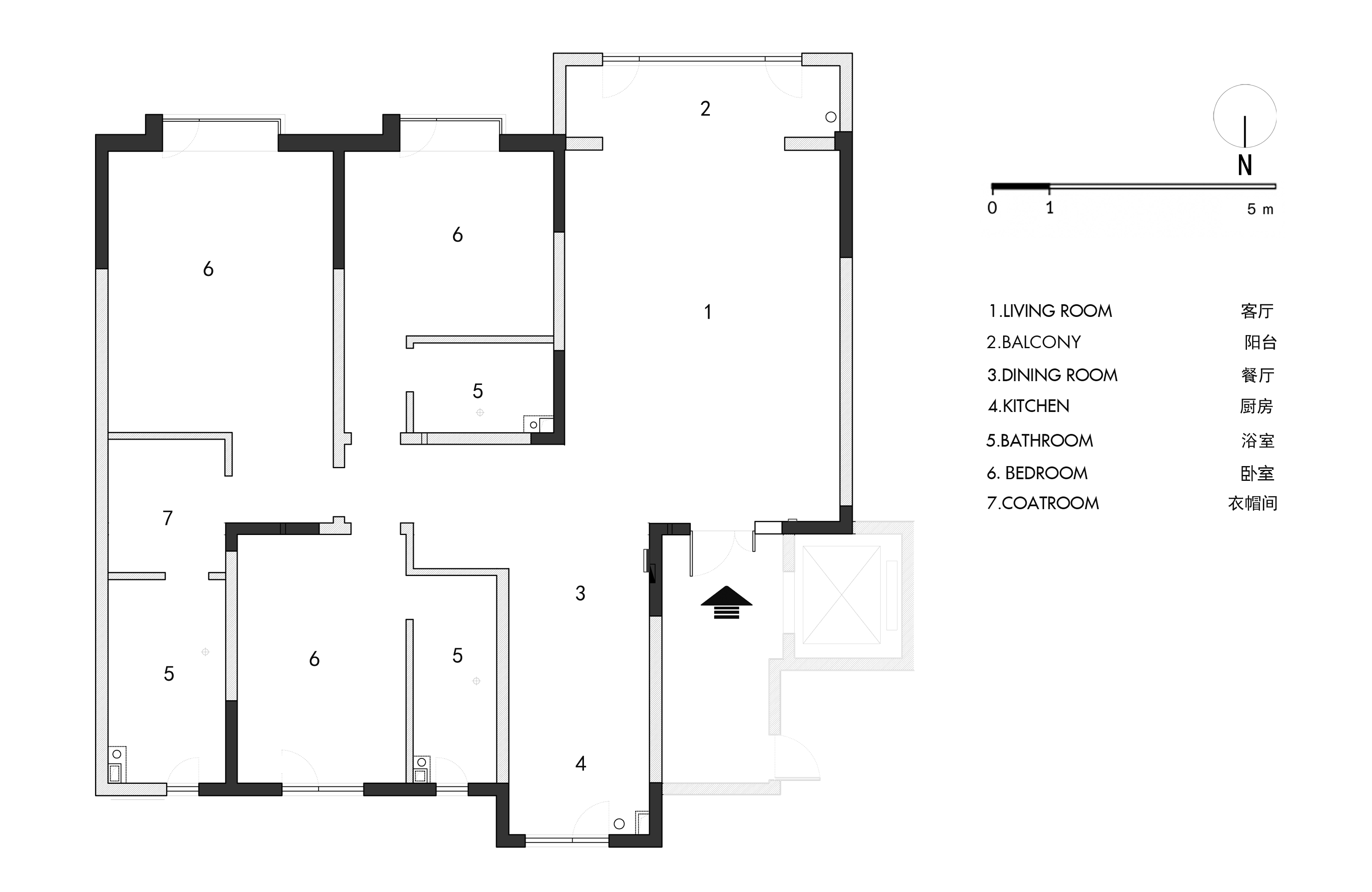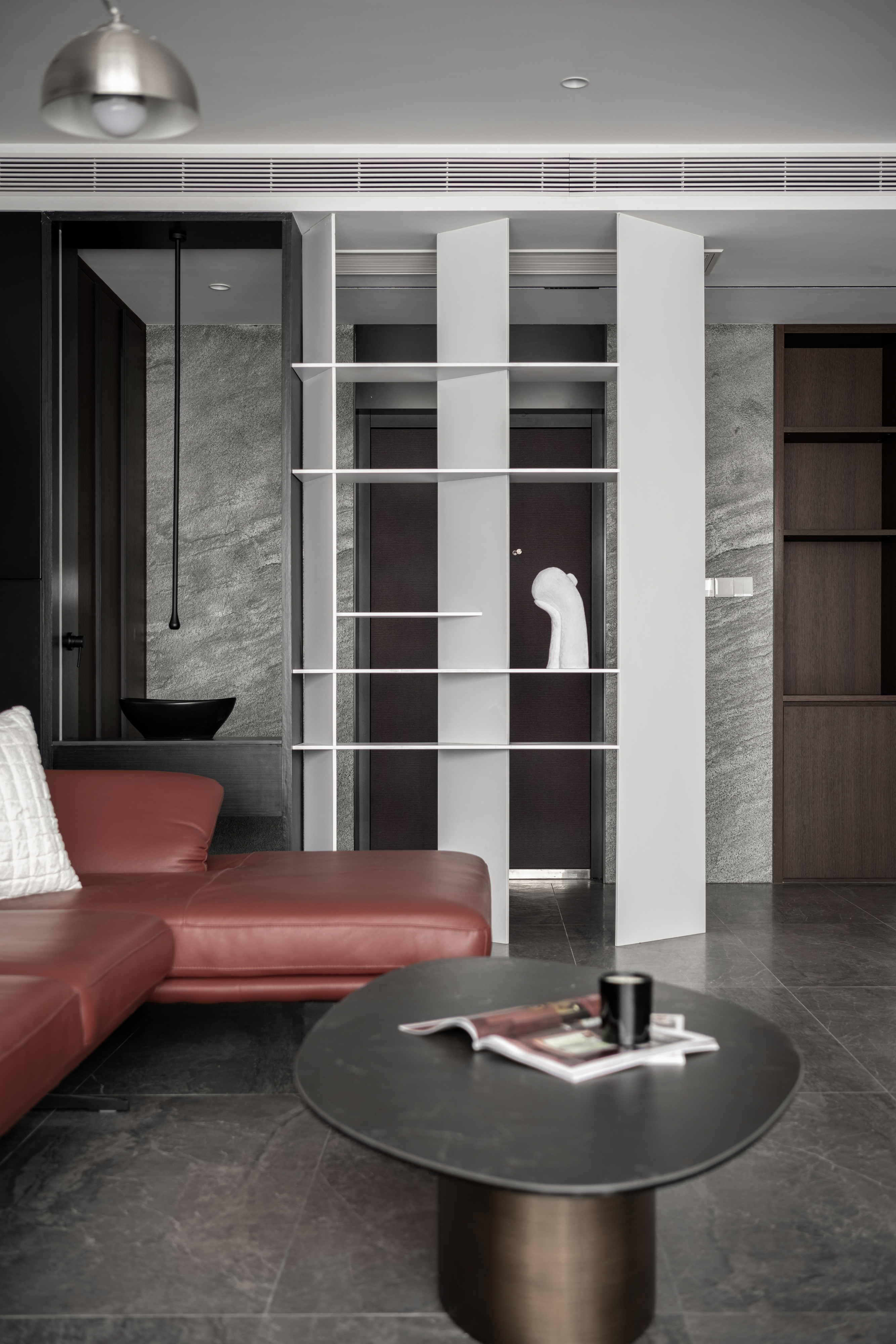 空间意境:在环境风格上用构成的手法来平衡“黑白”两个系列的材质: ①在客厅用“手枪手势”来延展沙发背景(伸出去的食指代表东西横梁、中指无名指小拇指代表弧型的壁纸墙); ②在餐厅用平面构成的手法雕琢白墙; ③在玄关用立体构成的手法设计隔断来分割光影。