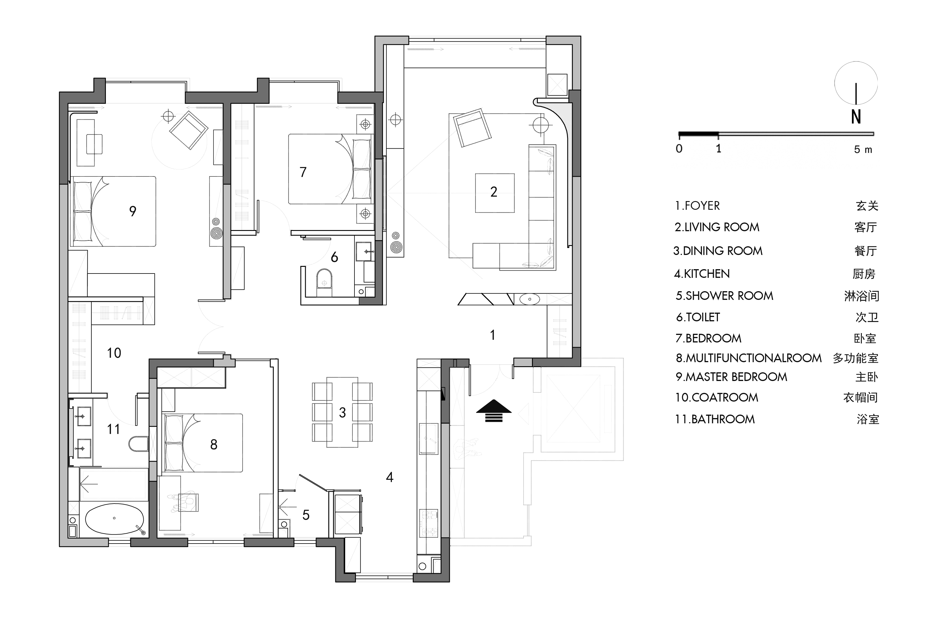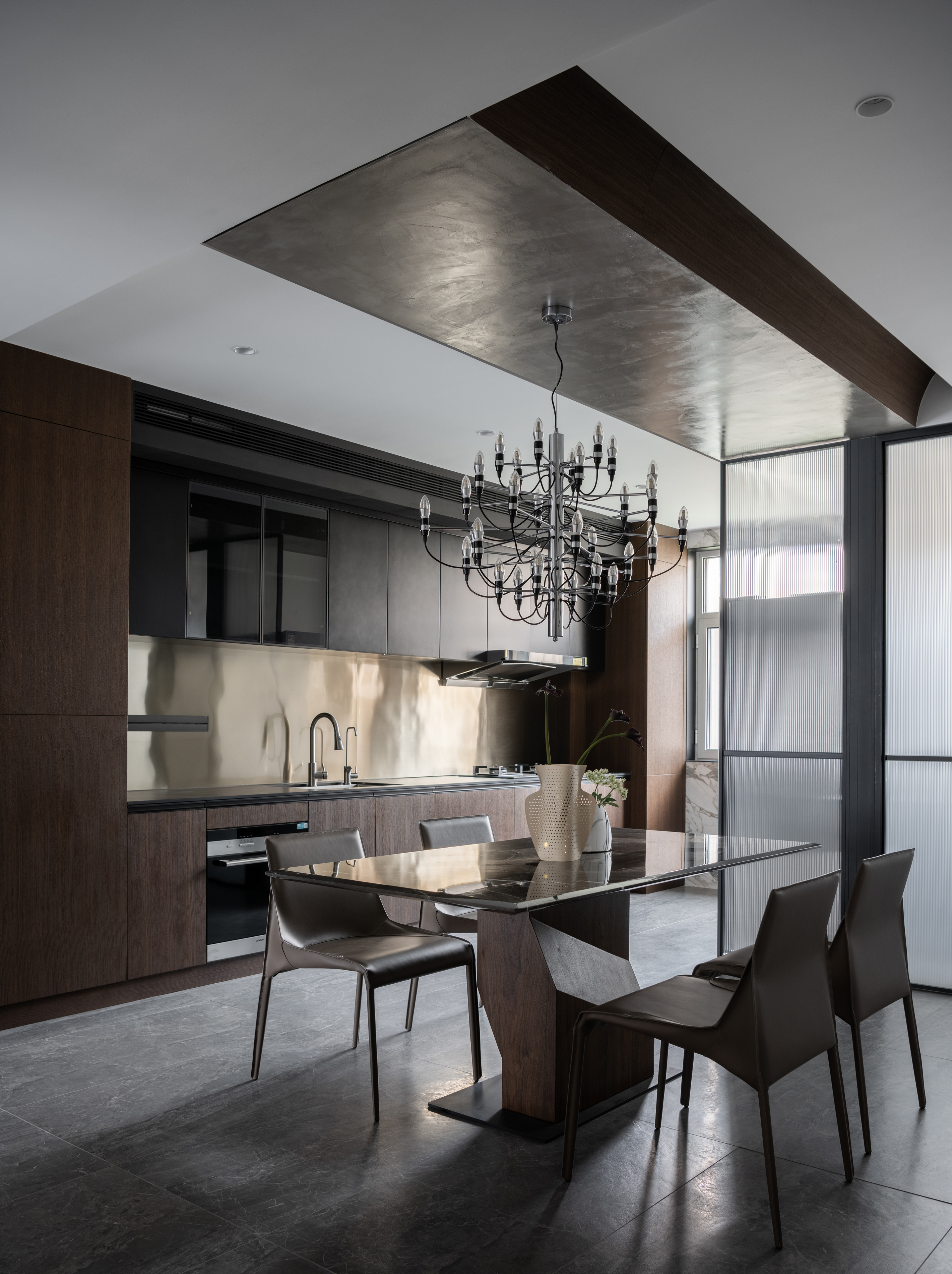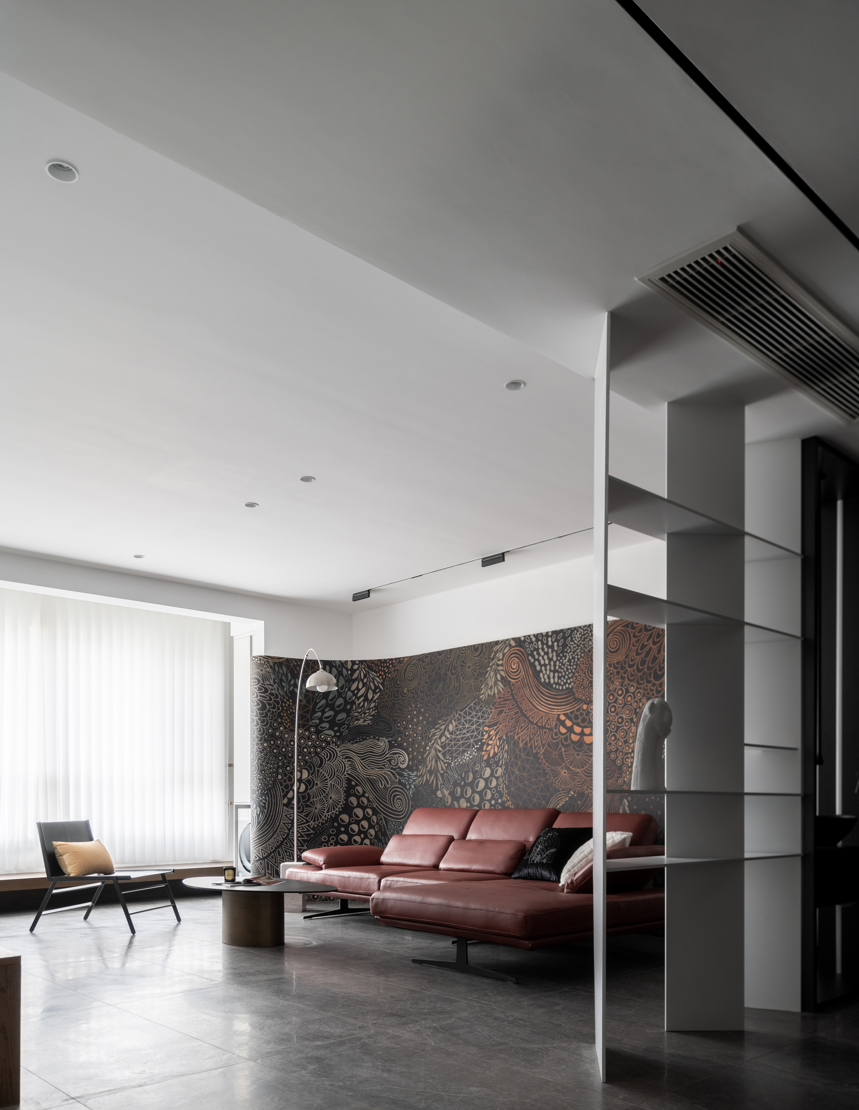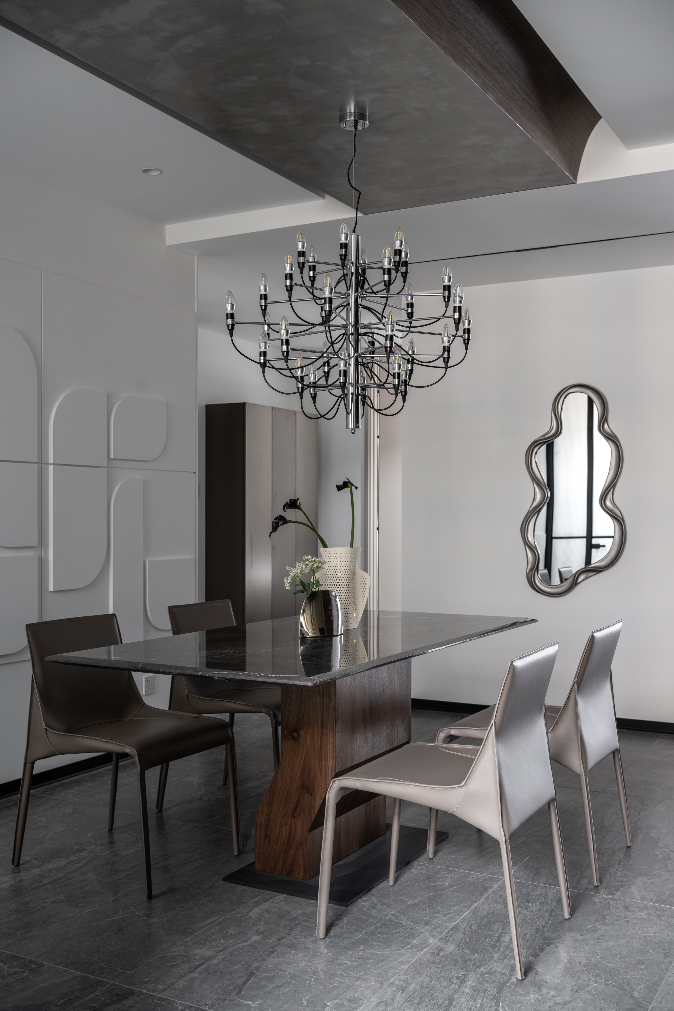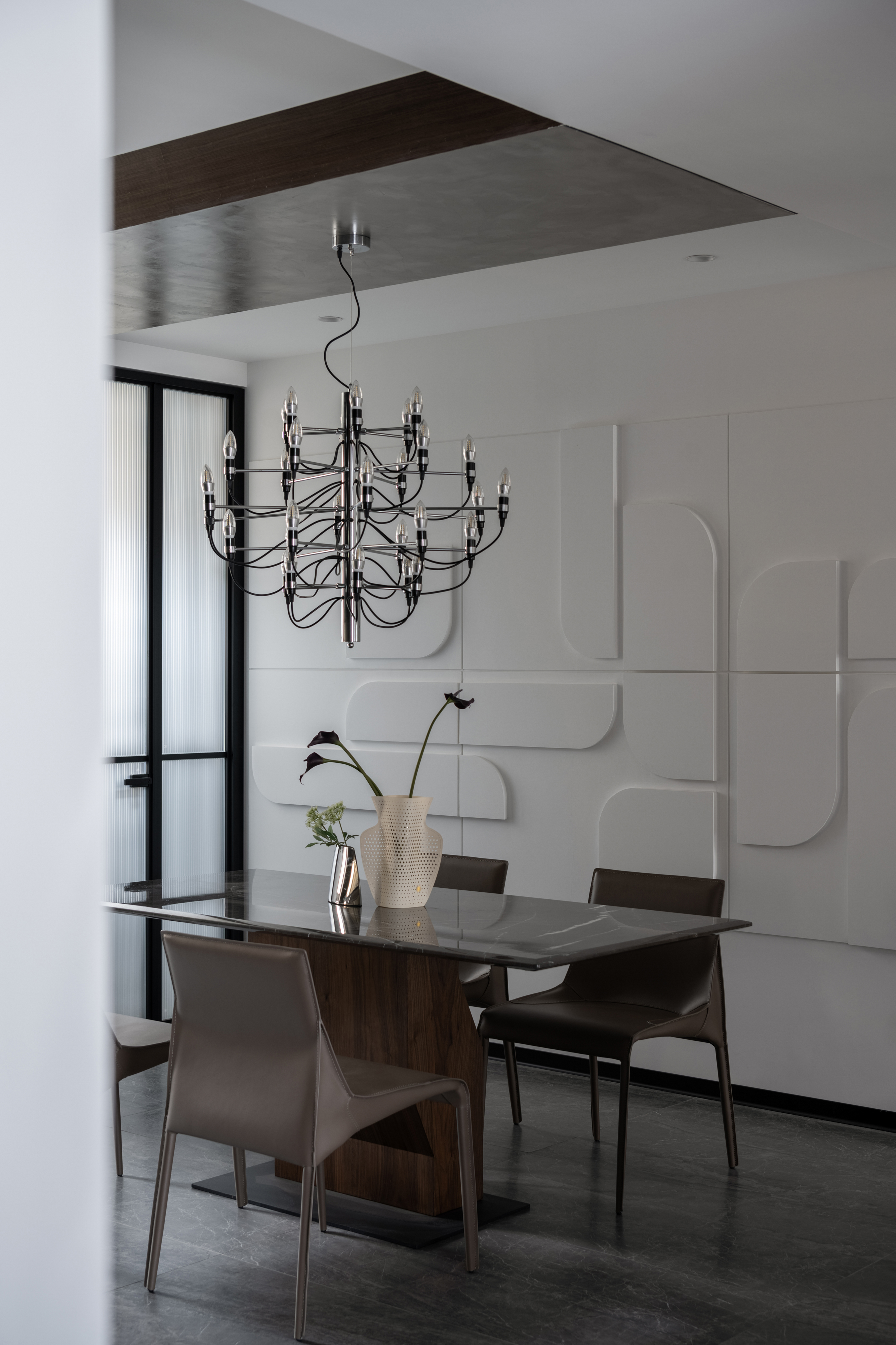 项目定位:在设计前期业主就明确要用三款单品样式:Flos的Arco落地灯/2097吊灯和一款凤凰壁纸,从而得知空间的主调是意式风格。 之后结合预算和克制表达的设计初衷,简要的遵循了意式家具展厅的部分意向,通过家具呼应硬装的策略来满足业主表达自我的品质需求,比如让沙发形式与硬装木作呼应让空间在平面上充满向外的张力,让餐桌的材质形式与顶面结构形成对衬关系使得空间丰富耐看,最终用设计的方法来突破条件的限制表达设计意图。