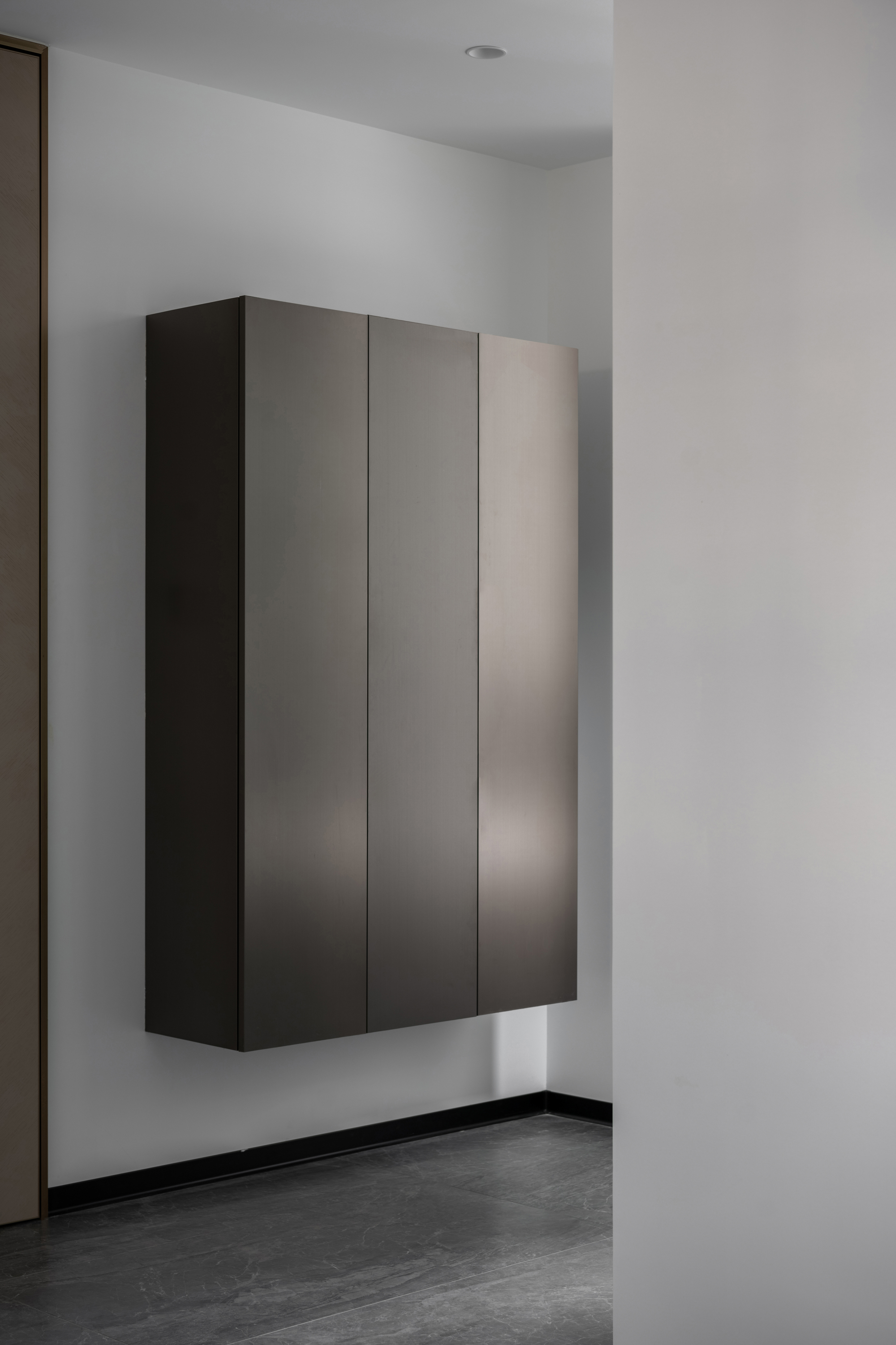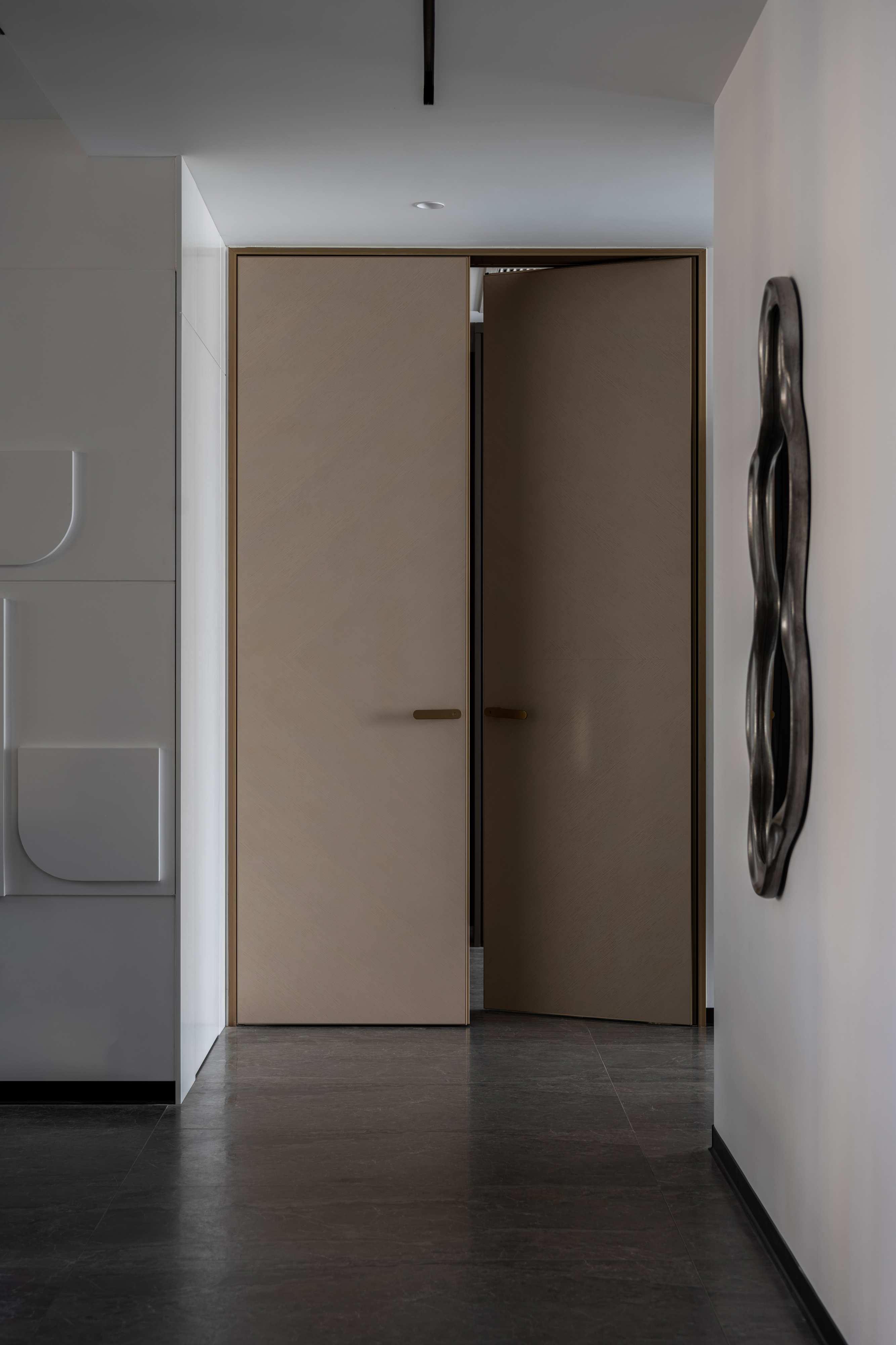 空间布局:在布局处理上用“框形结构”的概念来处理关键的三处局部: ①客厅的L型沙发与地柜及地台连成的L型成咬合对峙态势; ②厨房配置近5米的”一“字型组合橱柜; ③主卧门改成通顶的双开门, 在保持看似独立的同时又相对统一,以此凸显空间大气的本质。