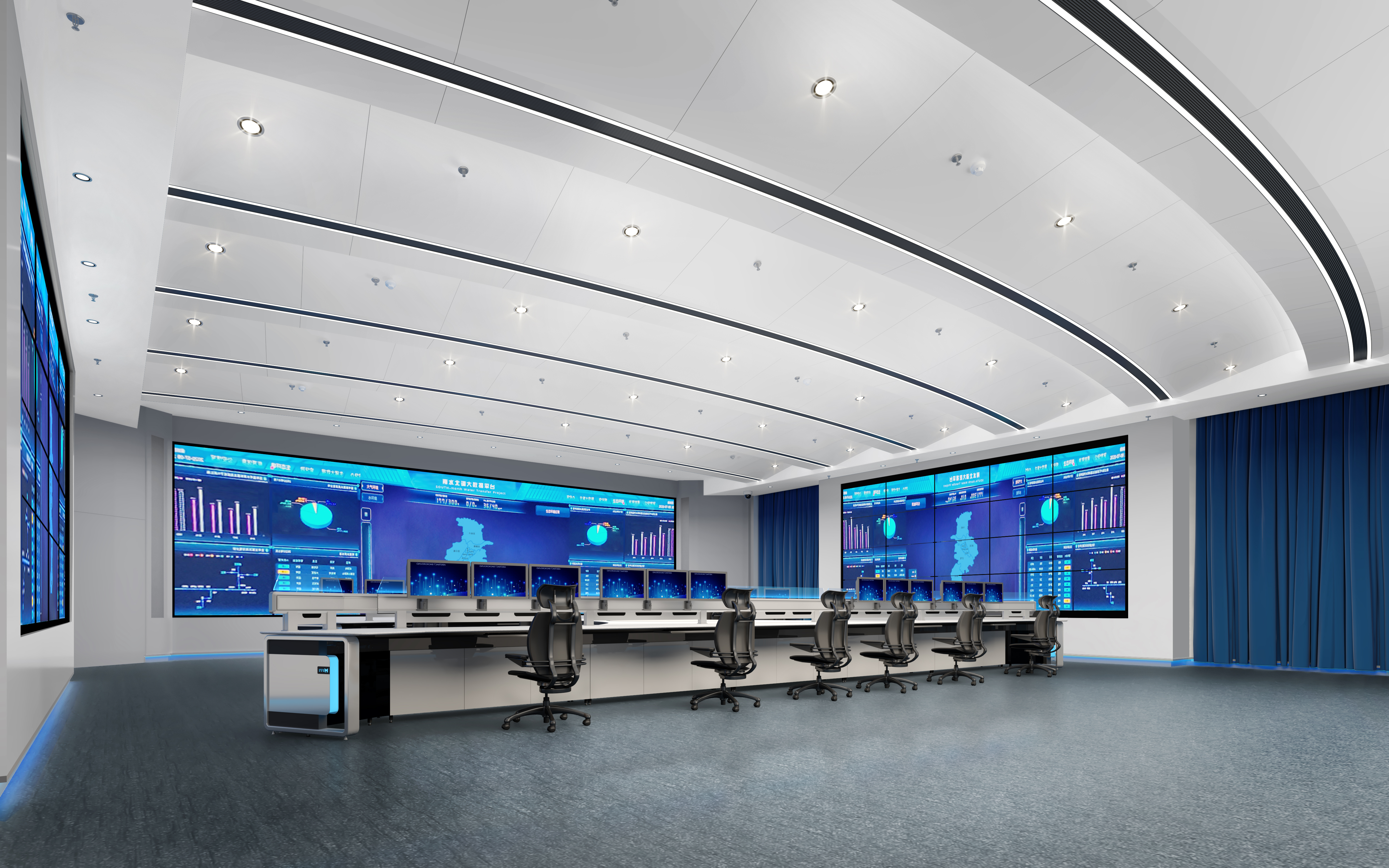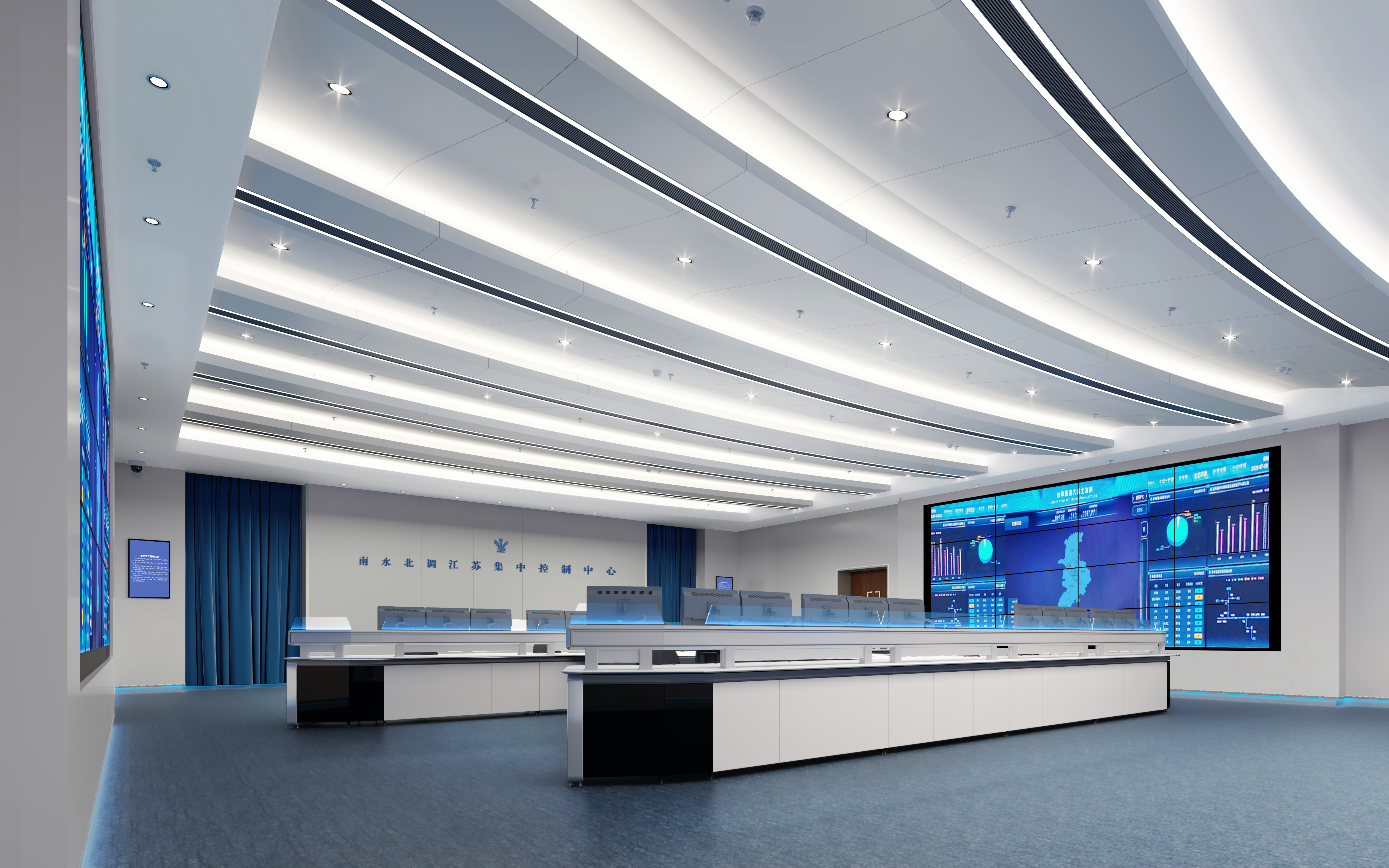 空间布局:空间的布局根据需求进行合理推演,指挥大厅三面均由LED屏幕组成,用以观测实时水文动态,指挥操作台在中央布置方便进行观测,简洁与穿透、秩序与弧线、光影与气氛尽在设计中融合并且升华。