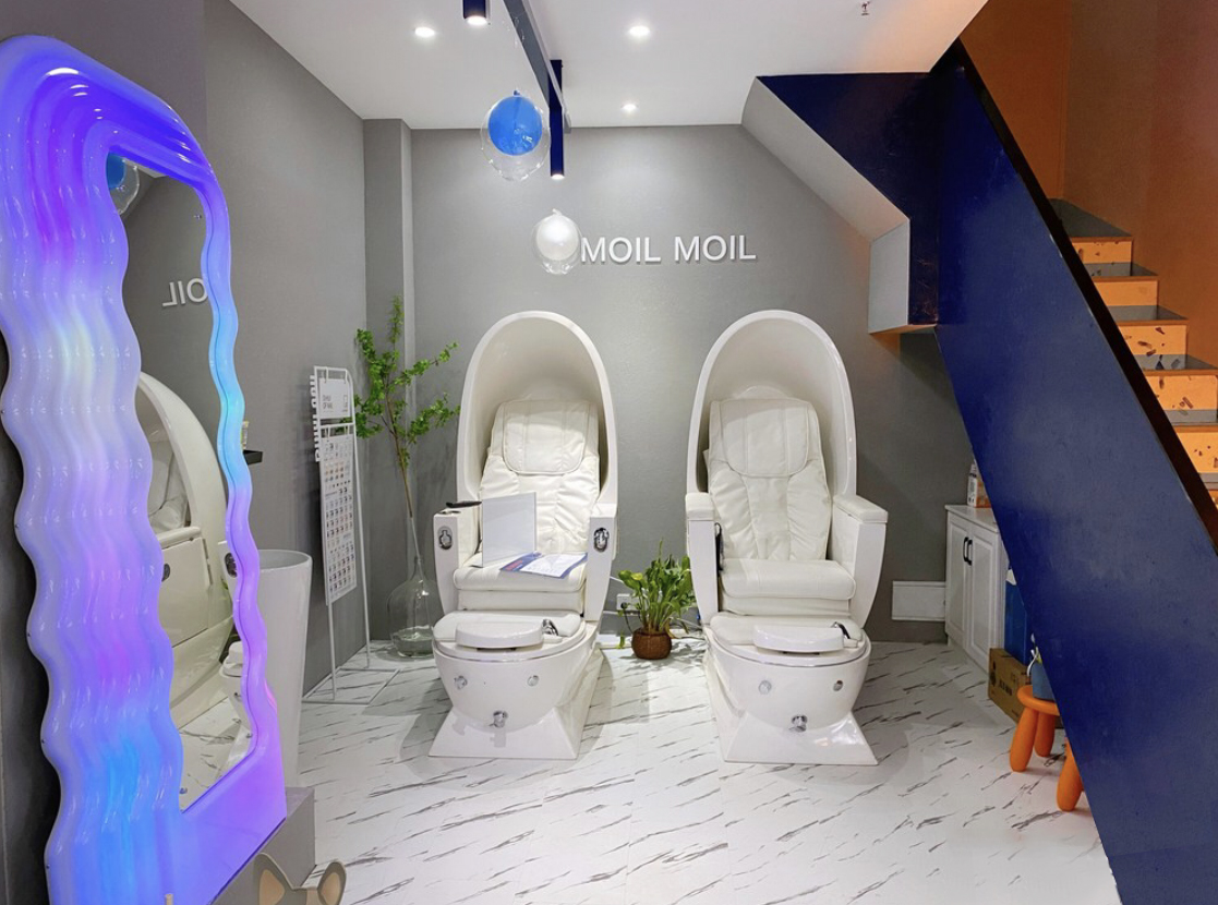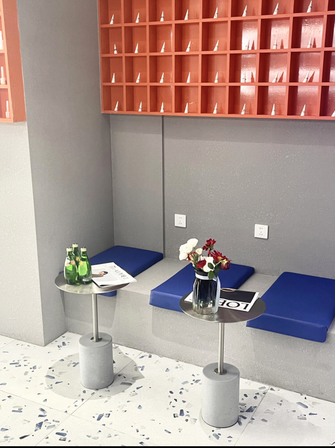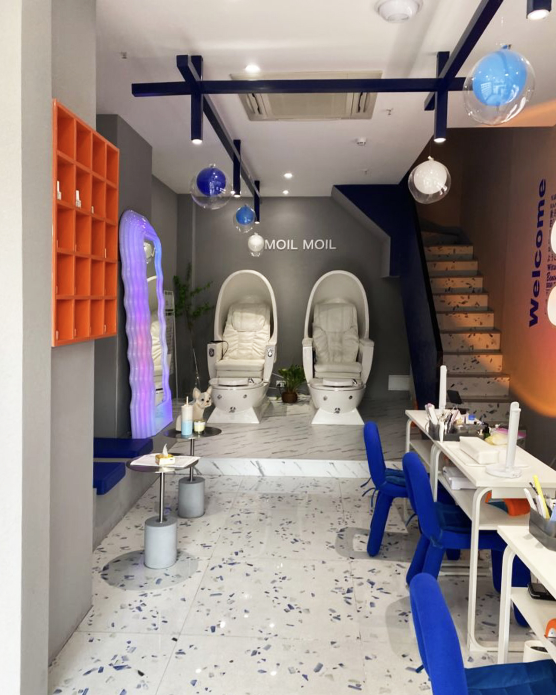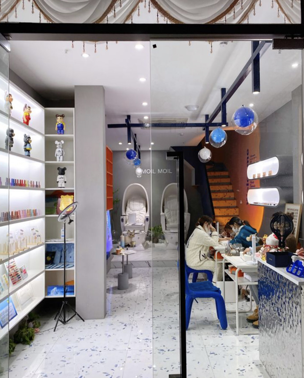 空间布局:当客户从街头走进店面,能够丢下忙碌,收获闲适,入口处是一整面美甲液的展示墙,用来将店面的氛围拉满,专业性得到诠释,穿过入口是美甲区,此区域设计简约大方,用符合年轻人的语汇来对美甲空间进行表达,造型前卫而又多元化,充满魔幻气息的镜子与远处的蛋形美容椅呼应,搭配空间中的克莱因蓝色,突出一种神秘主义的美感,休闲区简练而充满细节让人能够产生新潮的感受,橙色的美妆展示柜很好的提升了空间的品质感,步入二楼是VIP美容区,设计温馨舒适,适合做SPA等多元化服务