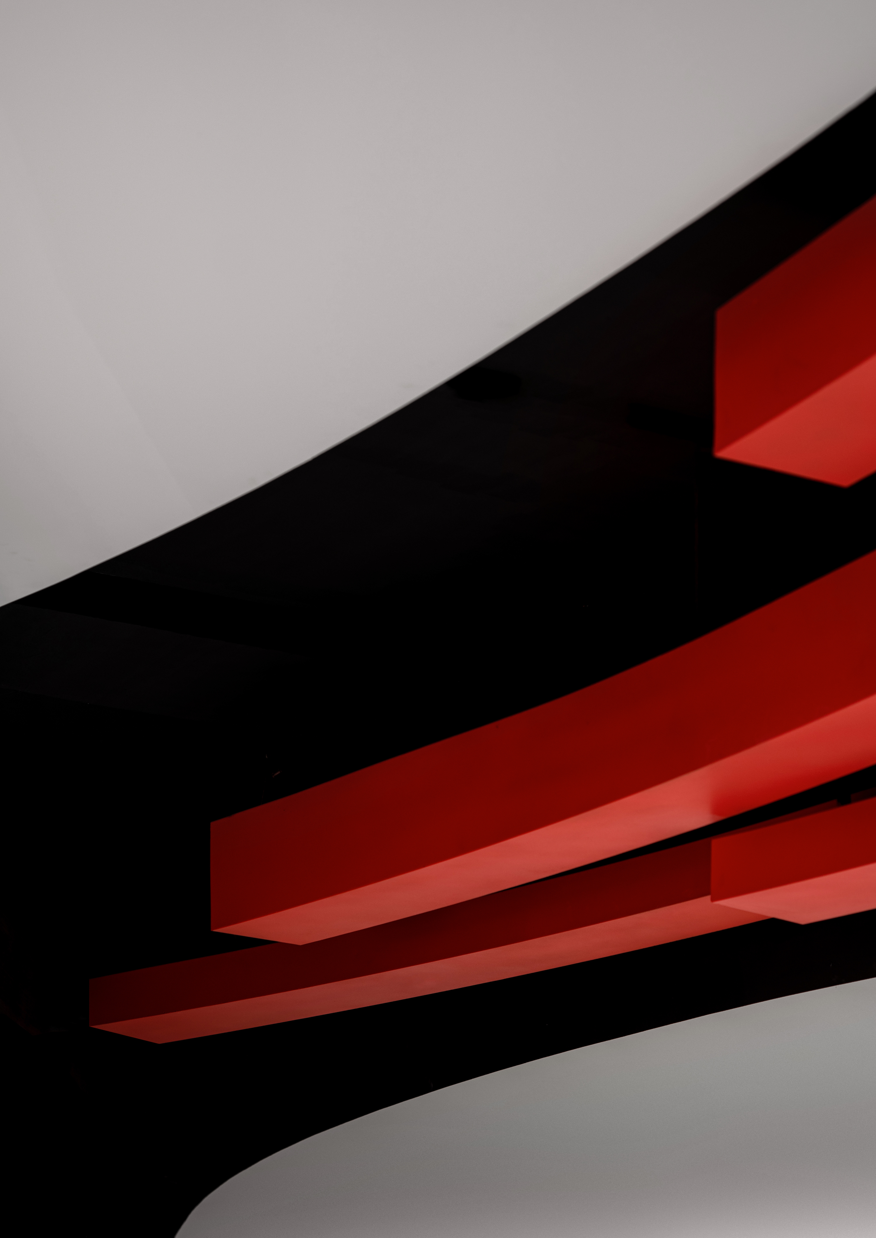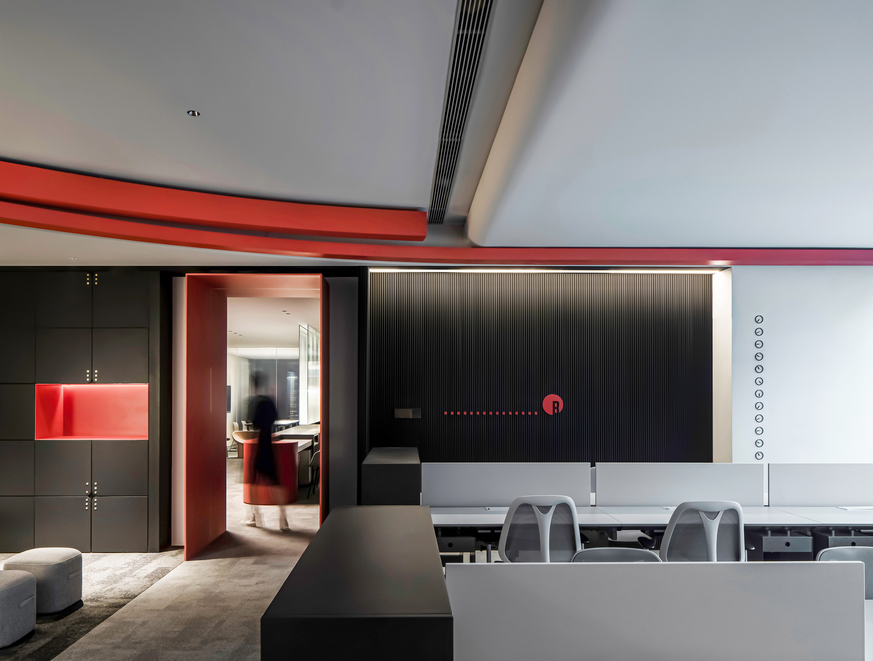 设计选材:为了增添更多的趣味性,空间颜色上除了深灰色背景外,加入由品牌色系中提取的一抹红色,跳脱于空间之上,设计上刻意保留了较高的饱和度,与底色形成开放的对话关系,同时利用人造灯光的漫反射营造光线在空间中的流动与变化。