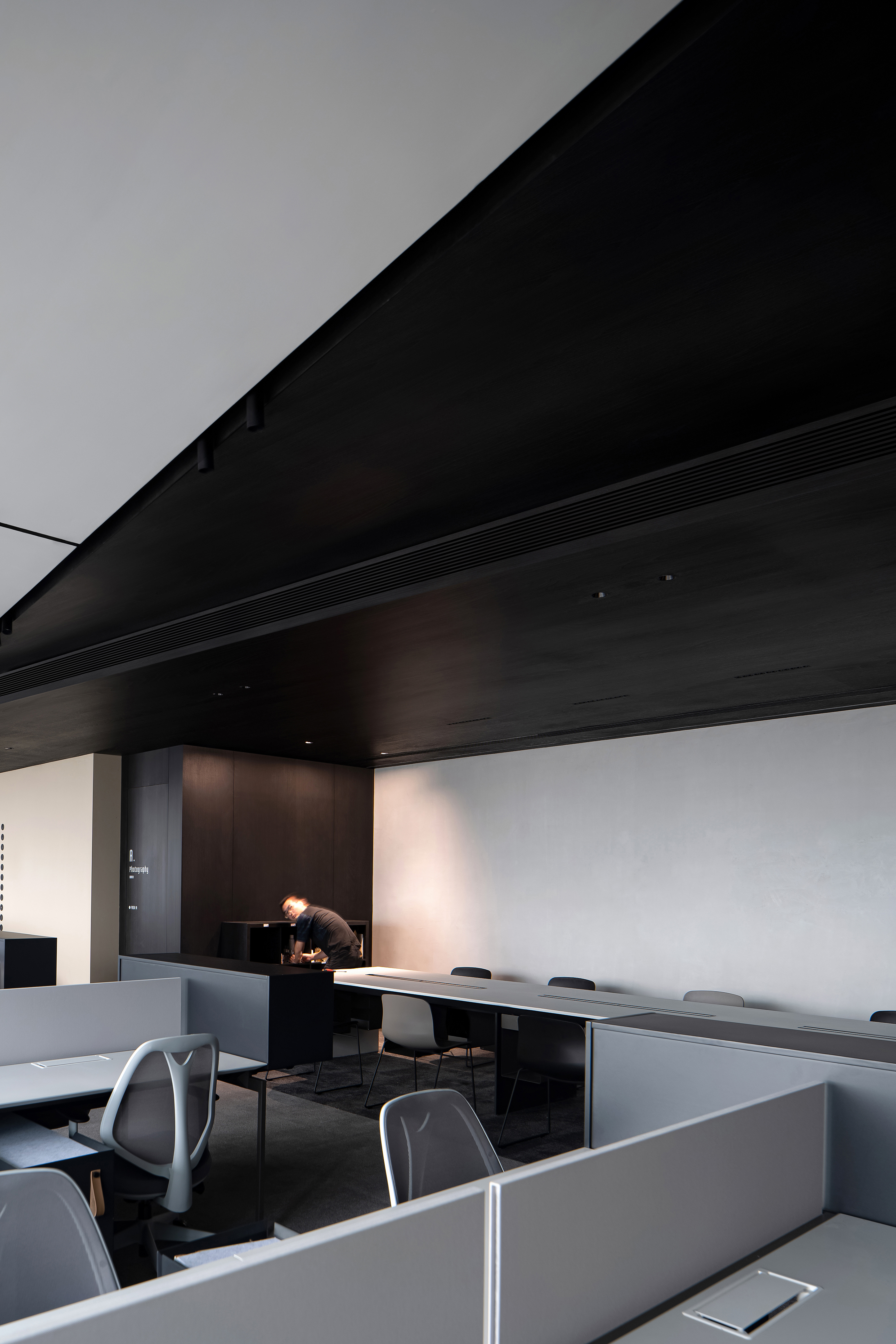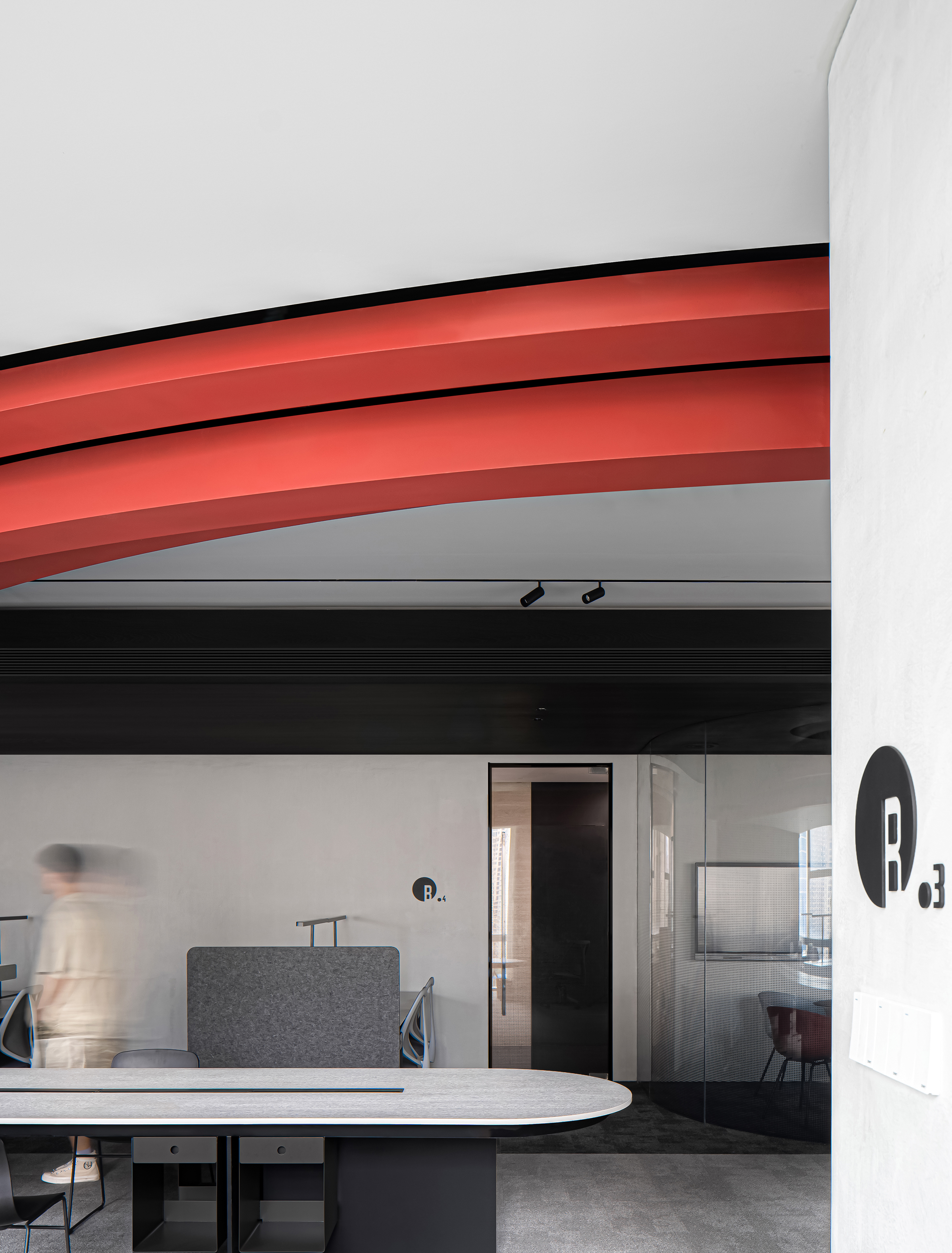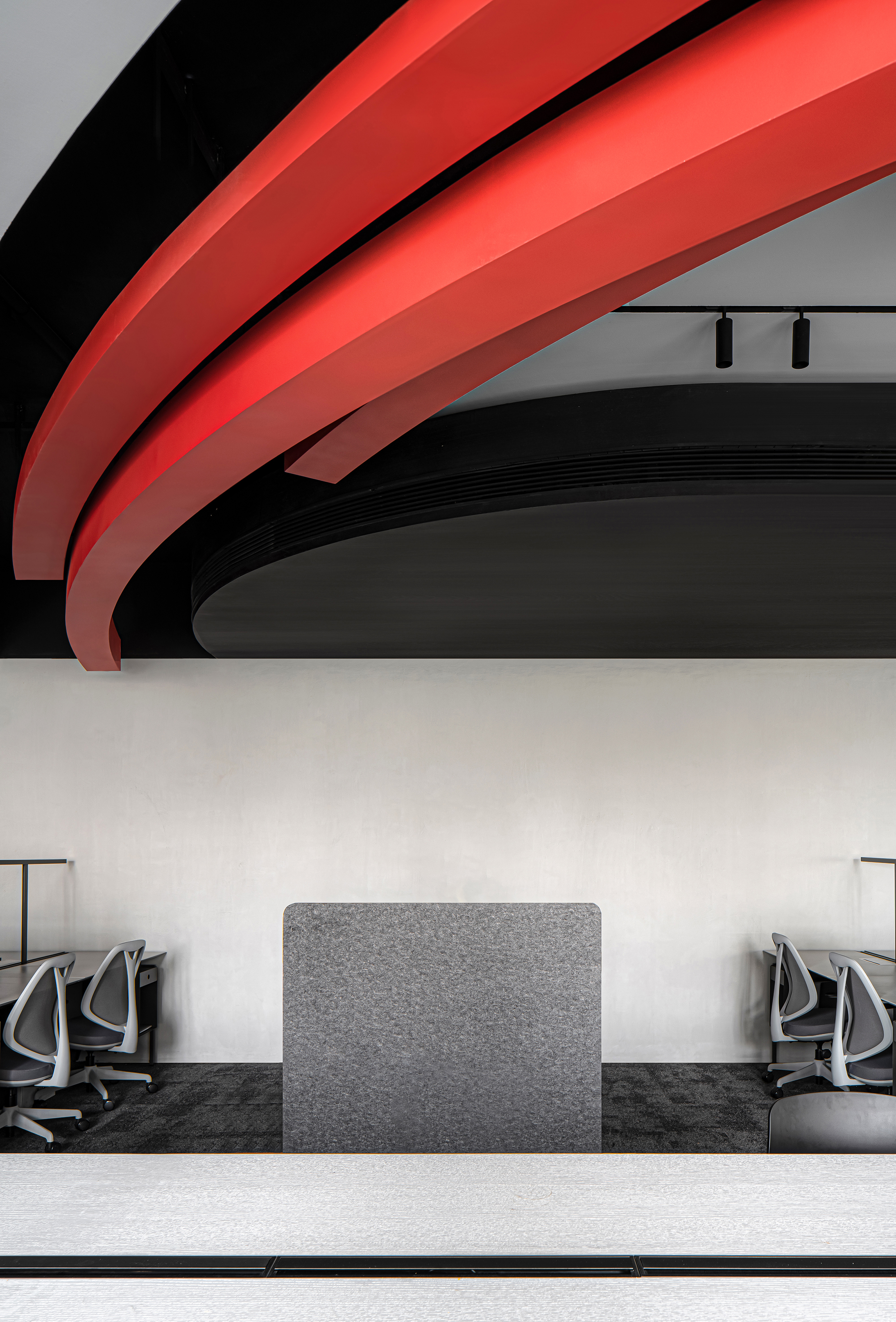 空间布局:本次设计以办公空间为载体传达企业自身的文化精神,创造属于品牌自身的个性与态度,空间元素中建构曲与直的抽象符号,通过提取与品牌产品形态相关的曲面及棱角形式置入空间,以视觉对撞来产生强烈戏剧性的空间体验。两个主空间有序组织硬朗的体块与充满感性的曲面形态,试图描述由空间表象导出的品牌认同感,同时简化空间内部结构及设备的复杂度,以一种抓眼的极简造型呈现在空间中。