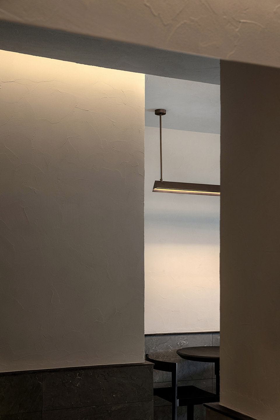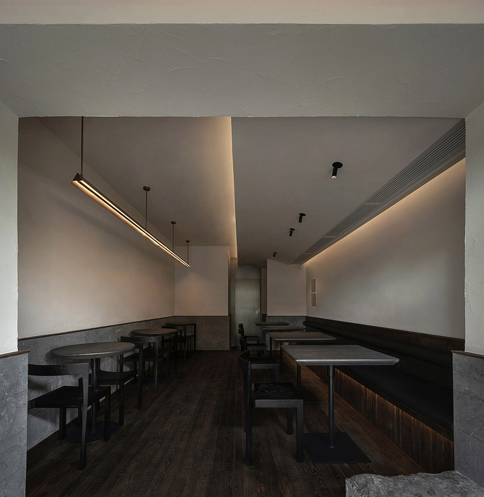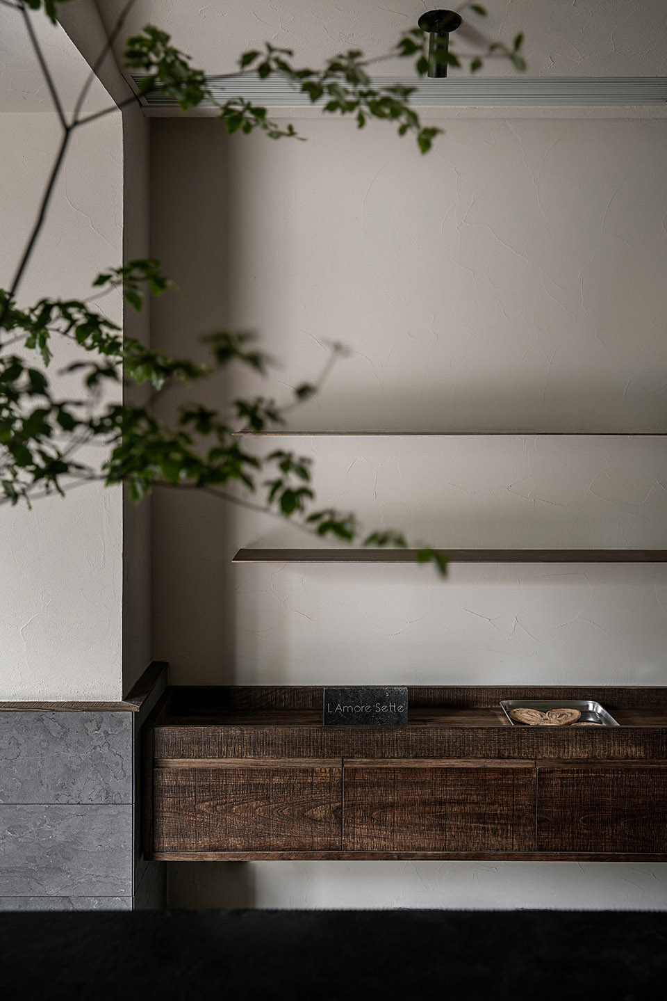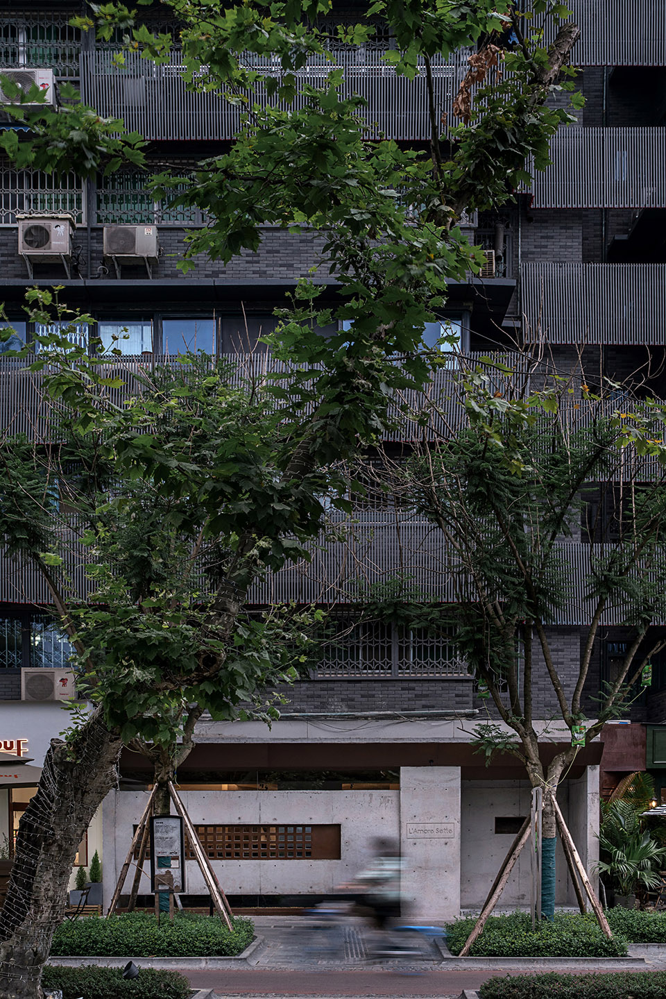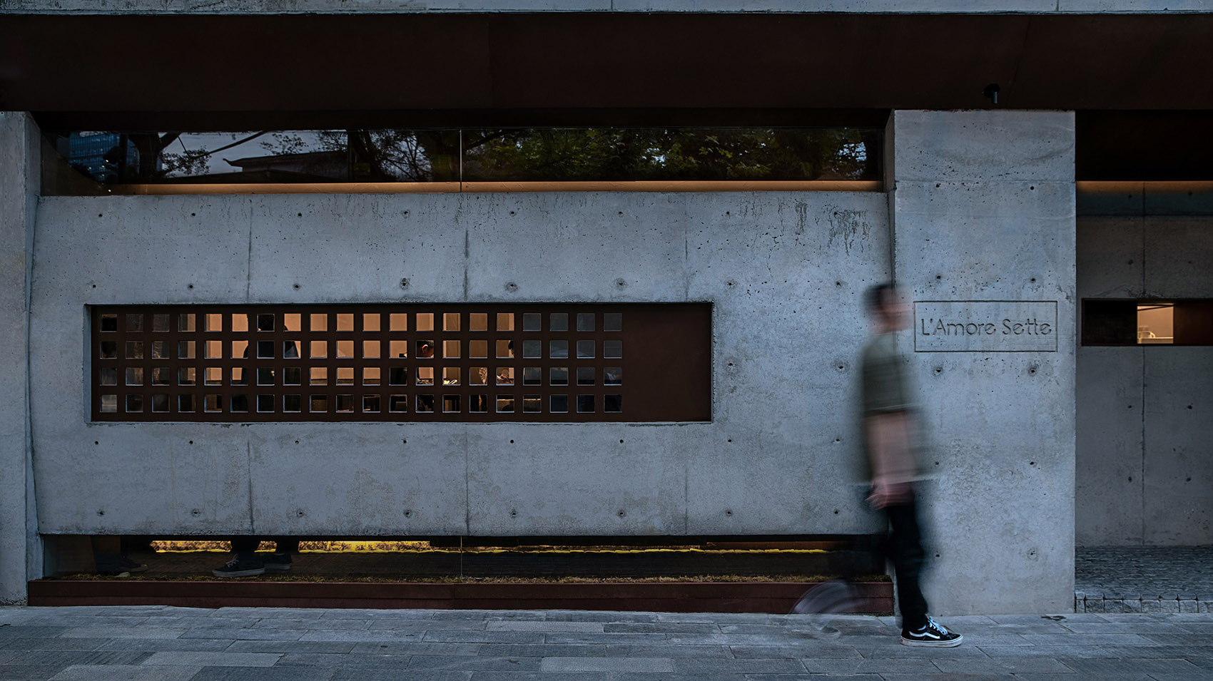 空间布局:“L ’Amore Sette”是由两个独立店铺组成,由于老建筑的限制,临铺的共墙不可有任何破坏。我们向外延伸做了一面“透明”的而不是以实体的墙来区分内与外。于是就有了经过结构计算后的混凝土悬浮外墙。室内的朦胧美感透过耐候钢和玻璃组成的方格窗愈加明显,引得行人纷纷侧目。