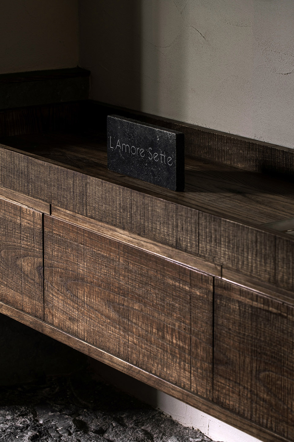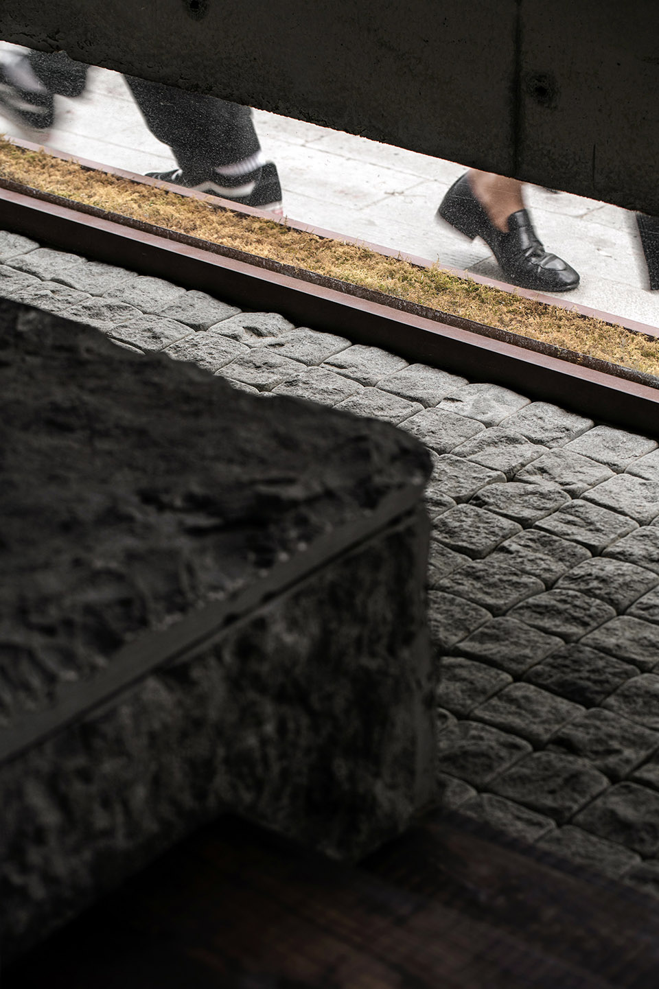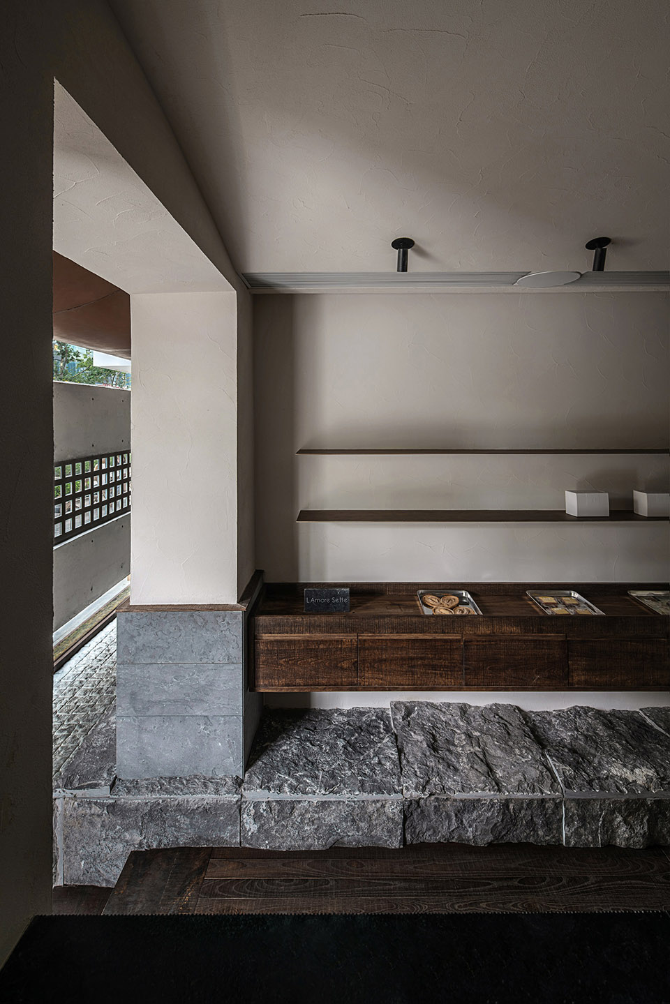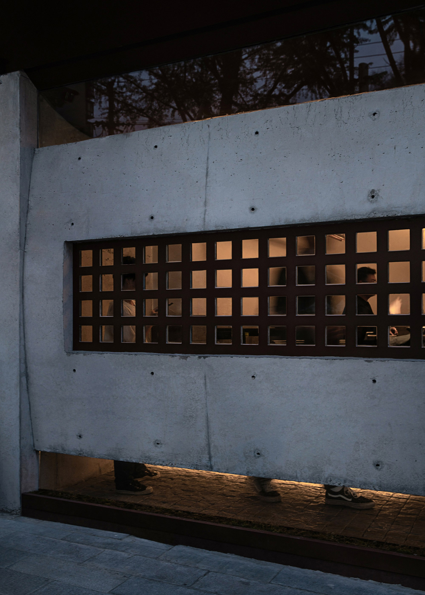 空间布局:“L ’Amore Sette”是由两个独立店铺组成,由于老建筑的限制,临铺的共墙不可有任何破坏。我们向外延伸做了一面“透明”的而不是以实体的墙来区分内与外。于是就有了经过结构计算后的混凝土悬浮外墙。室内的朦胧美感透过耐候钢和玻璃组成的方格窗愈加明显,引得行人纷纷侧目。