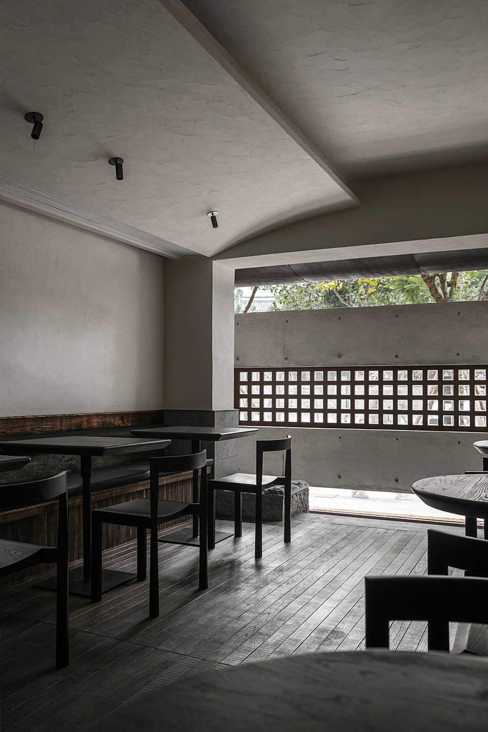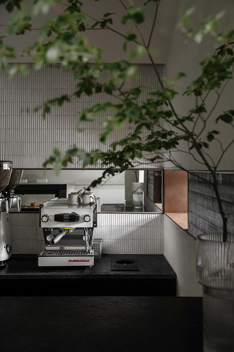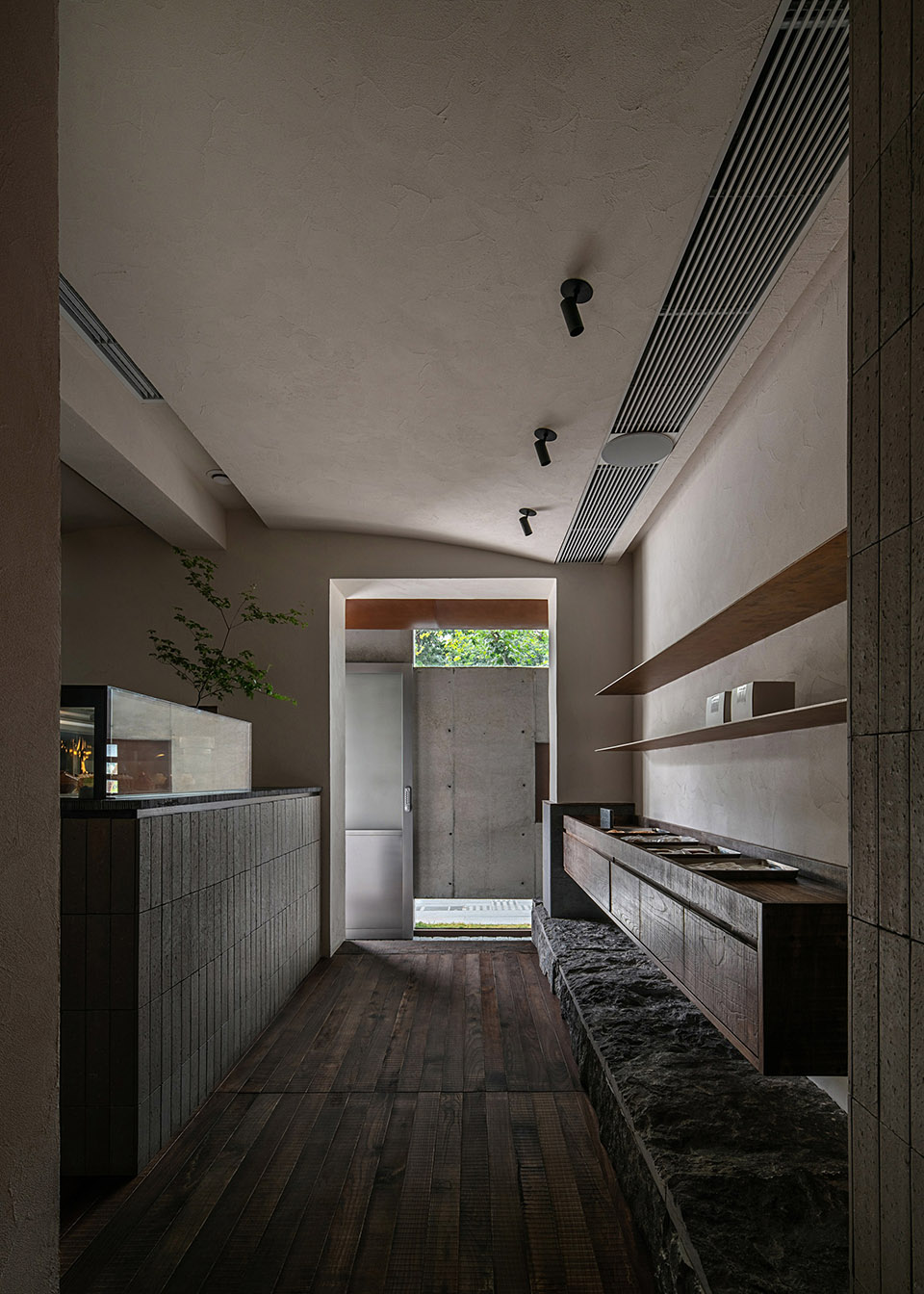 “透明”墙与内退空间形成的走廊把两个独立空间紧密联系在一起。留出一个区域作为模糊室内外的界限,同时也是对外卖功能区域的一个补充。