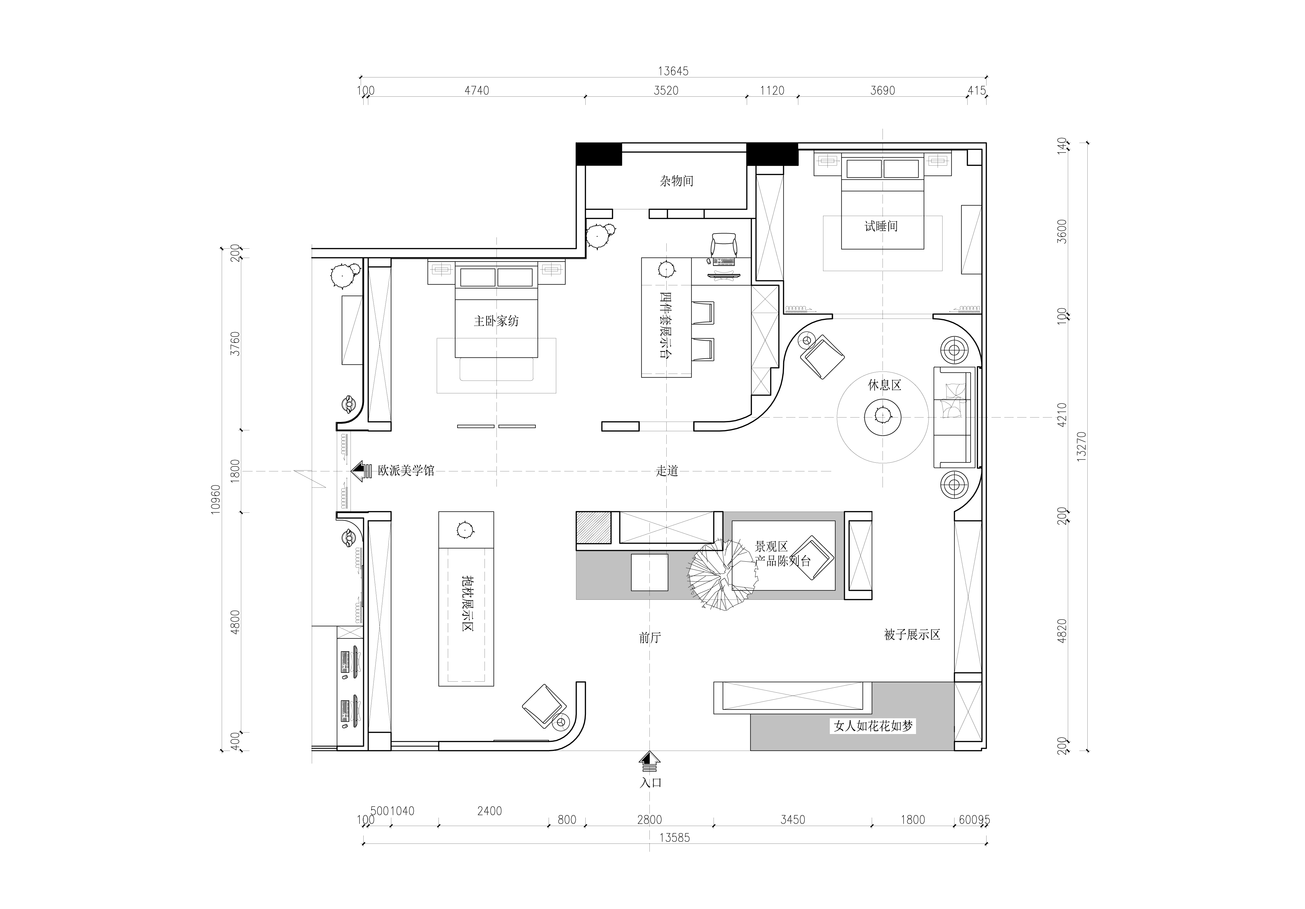 空间布局:环绕式动线蜿蜒曲折,延长停留时间,同时避免空间死角,行云流水般的曲线设计展现时尚女性的柔美。