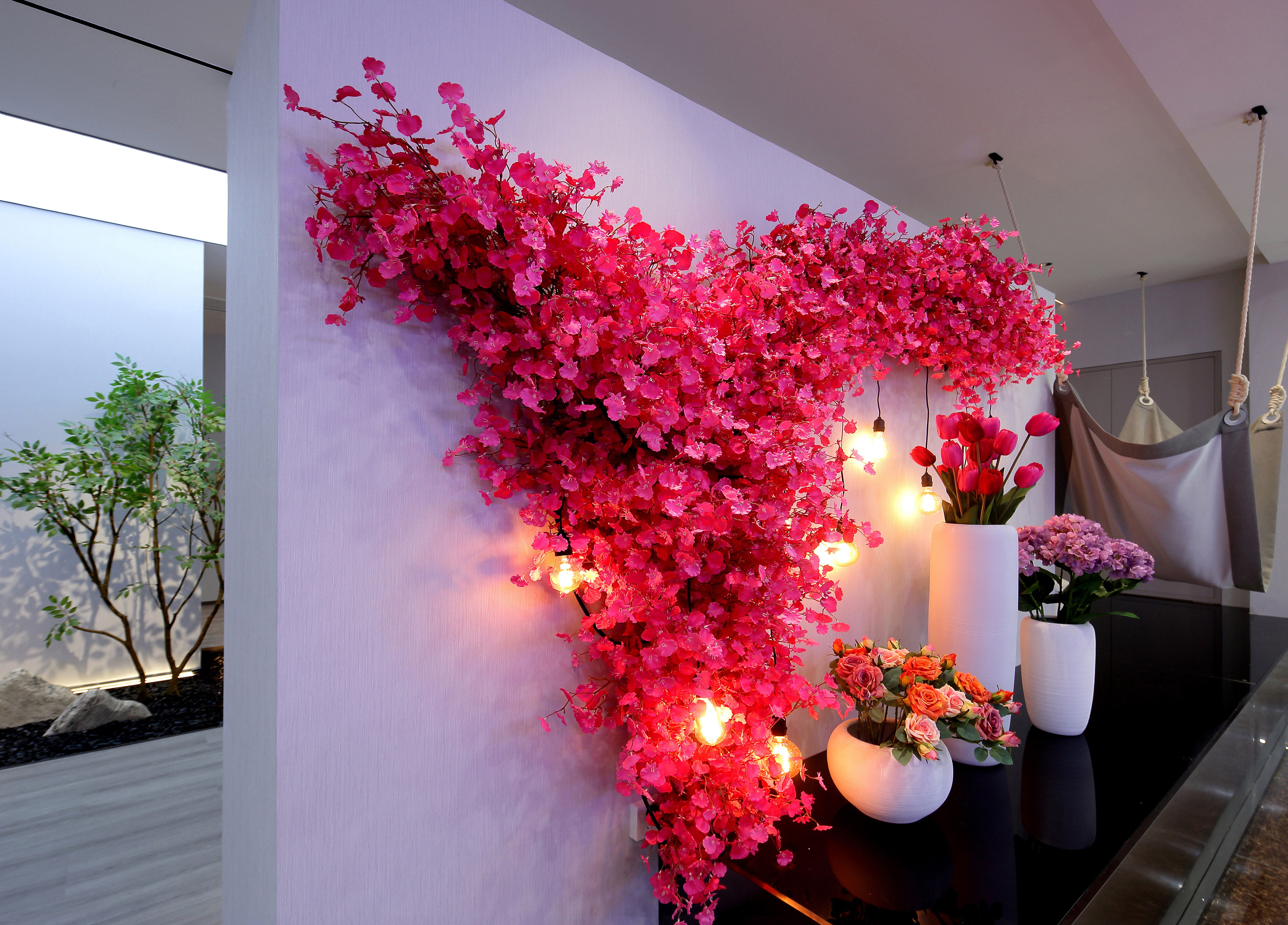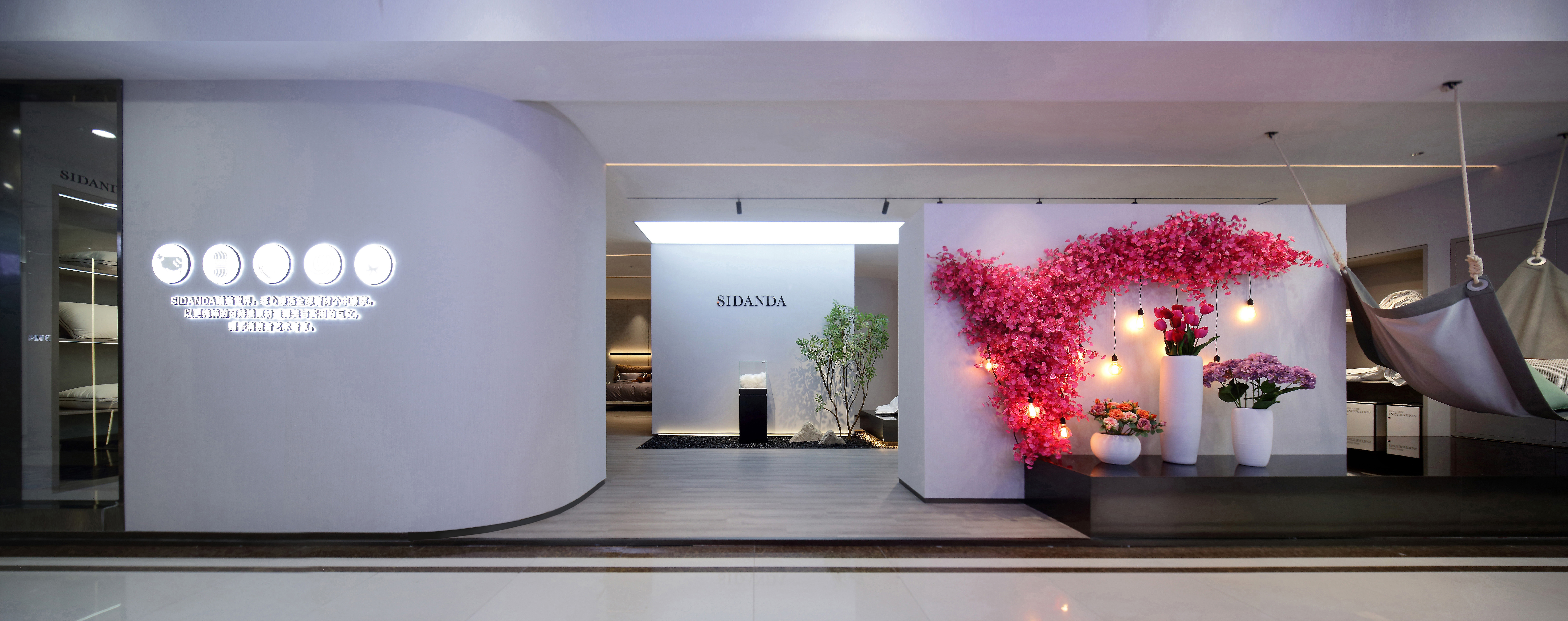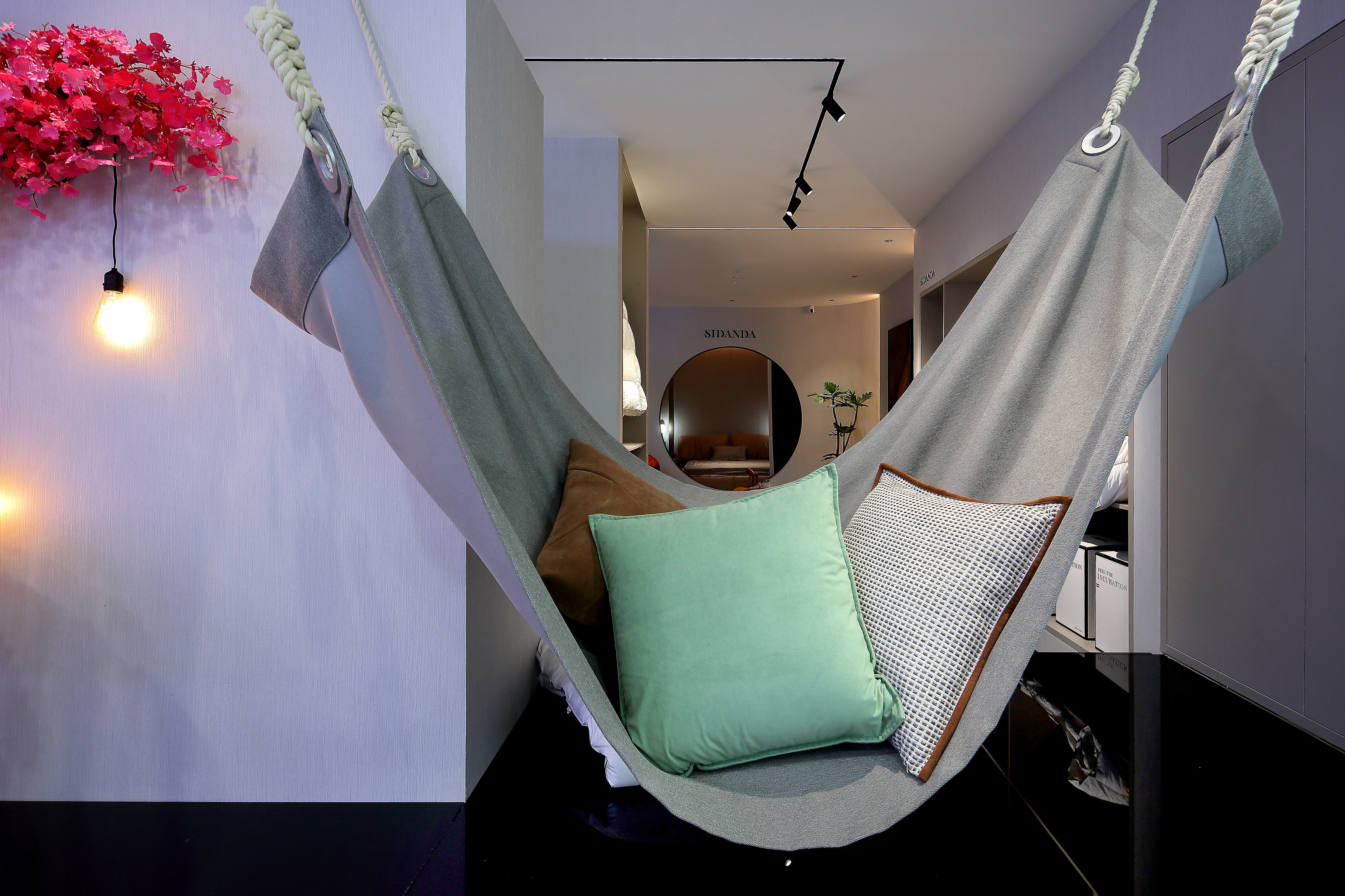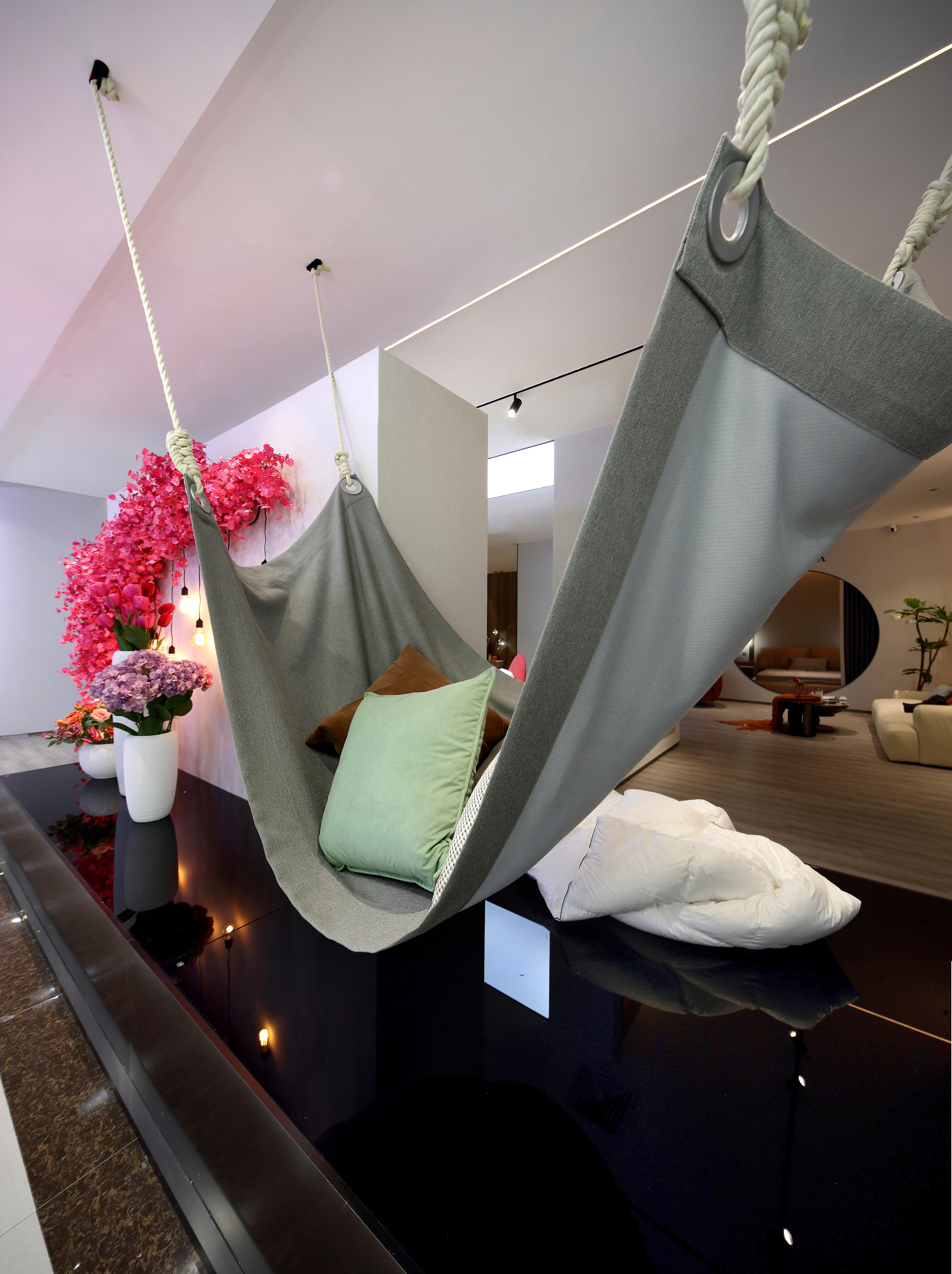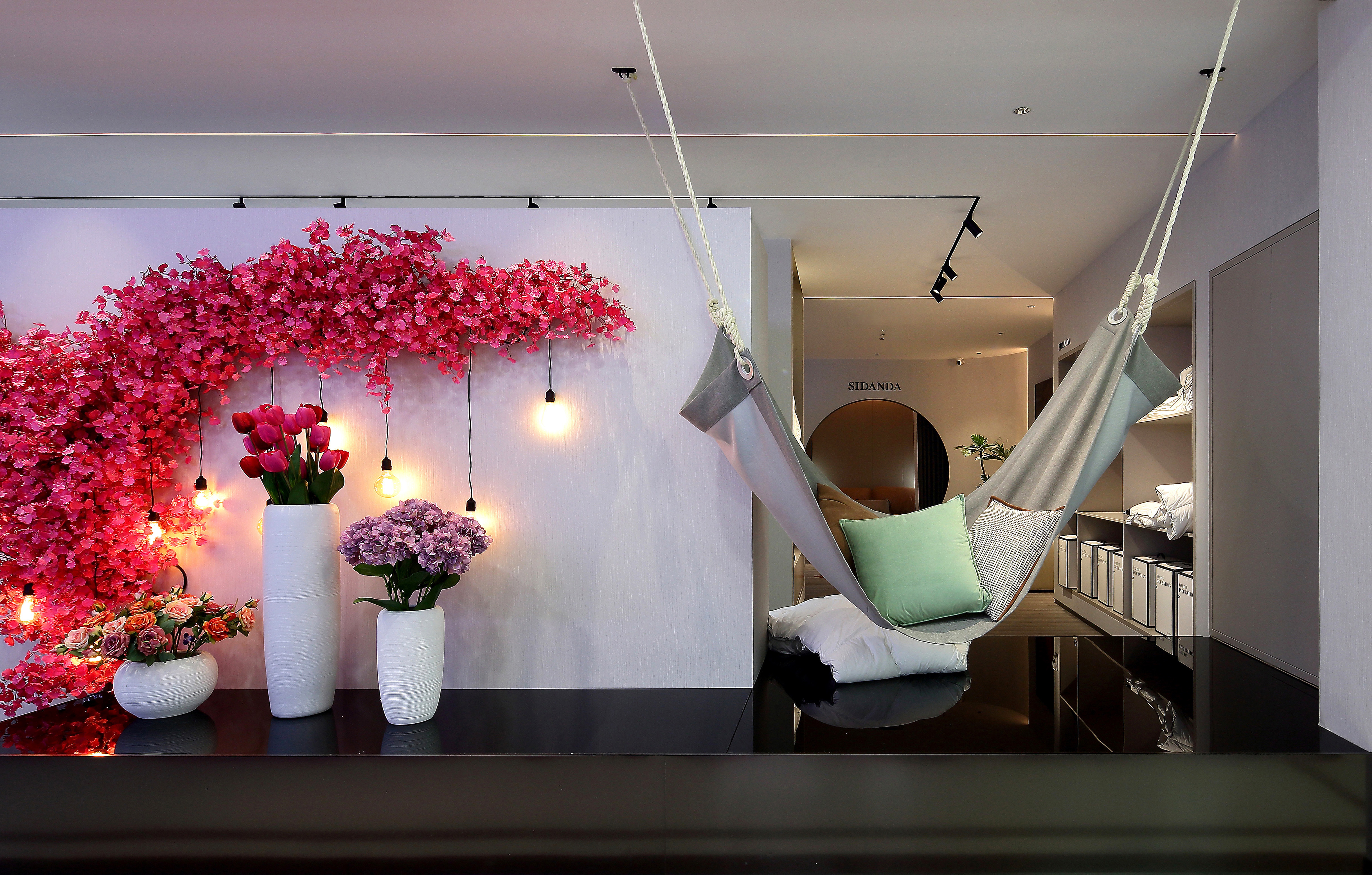 用户体验:女人如花•花如梦•SIDANDA梦里有你,鲜花和吊床展示产品的开放式橱窗设计,意在打造建材卖场里的网红打卡点,极致的现场体验感带来愉悦的购物心情。