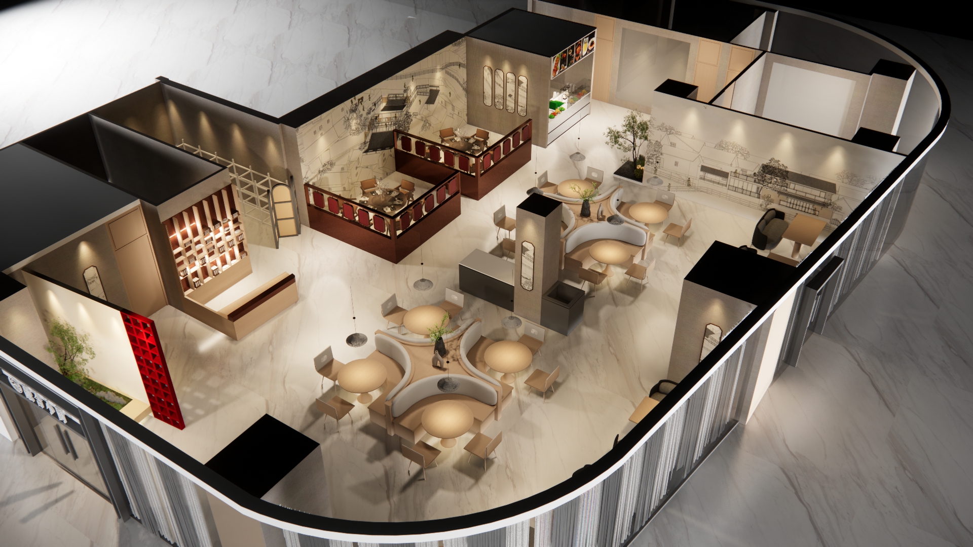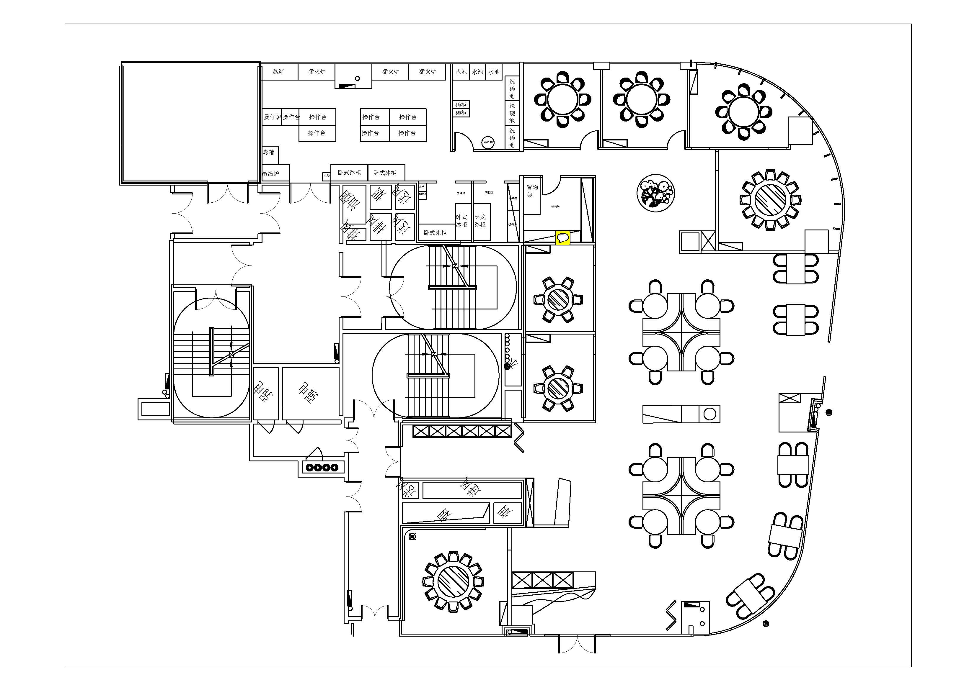 将原有大空间 改造为频效较高的小桌 布局分布张弛有度