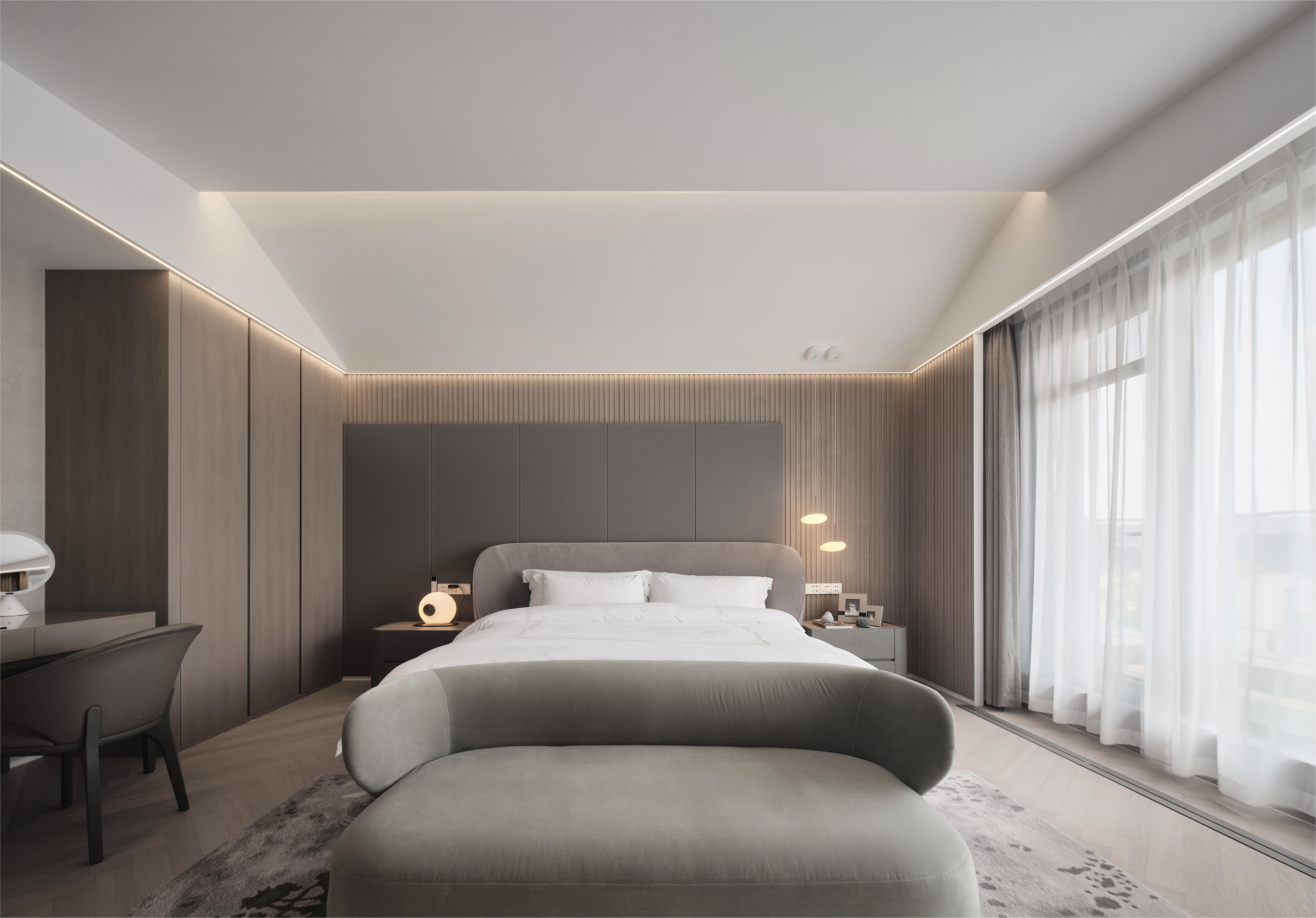 本案别墅的层高都有3米,层高高视野好是一个很大的优势。所以在公共区域的墙面,用格栅板做了墙裙,增加空间中的层次感。在卧室区域的部分,床头的背景以到顶的格栅板结合硬包的形式,突出细节质感。 -