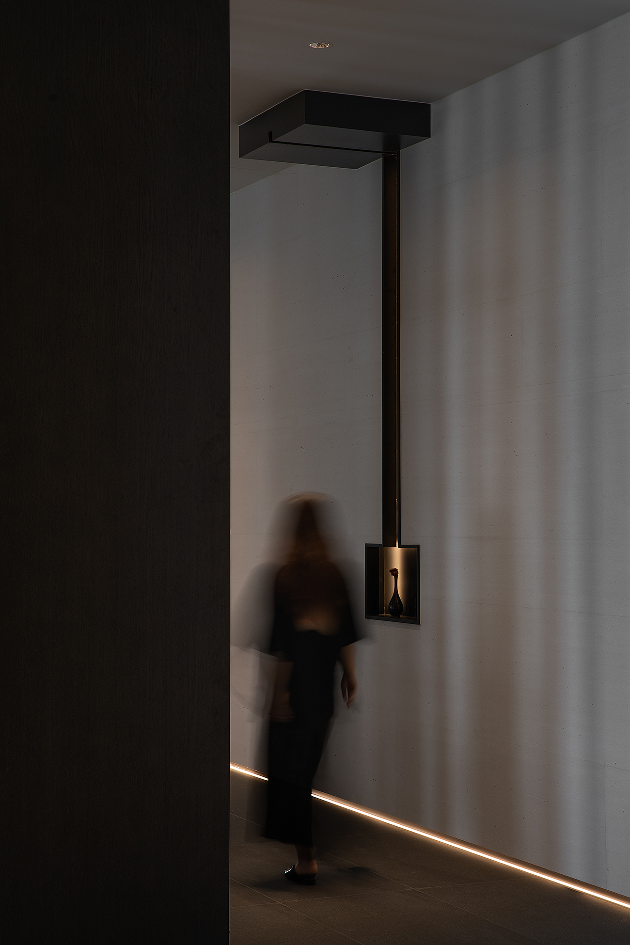 空间布局:前厅中轴对称的空间形式产生一种“安静”的仪式感,蕴含着平衡、稳定之美。使整个空间具有新东方的美感和秩序感。