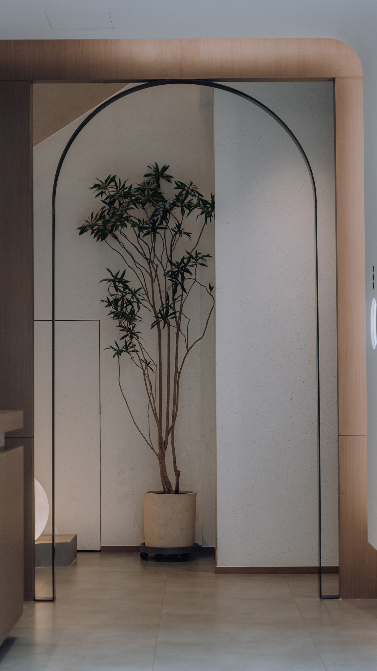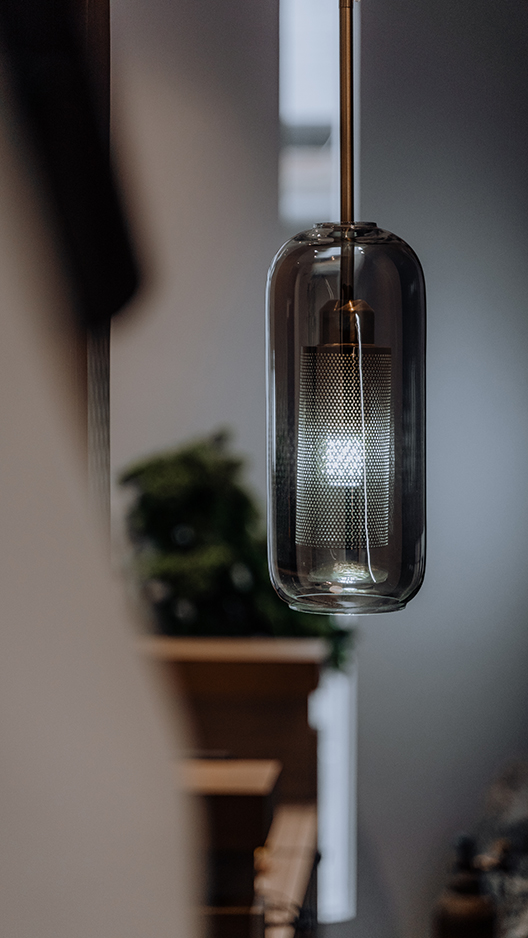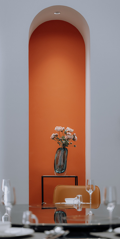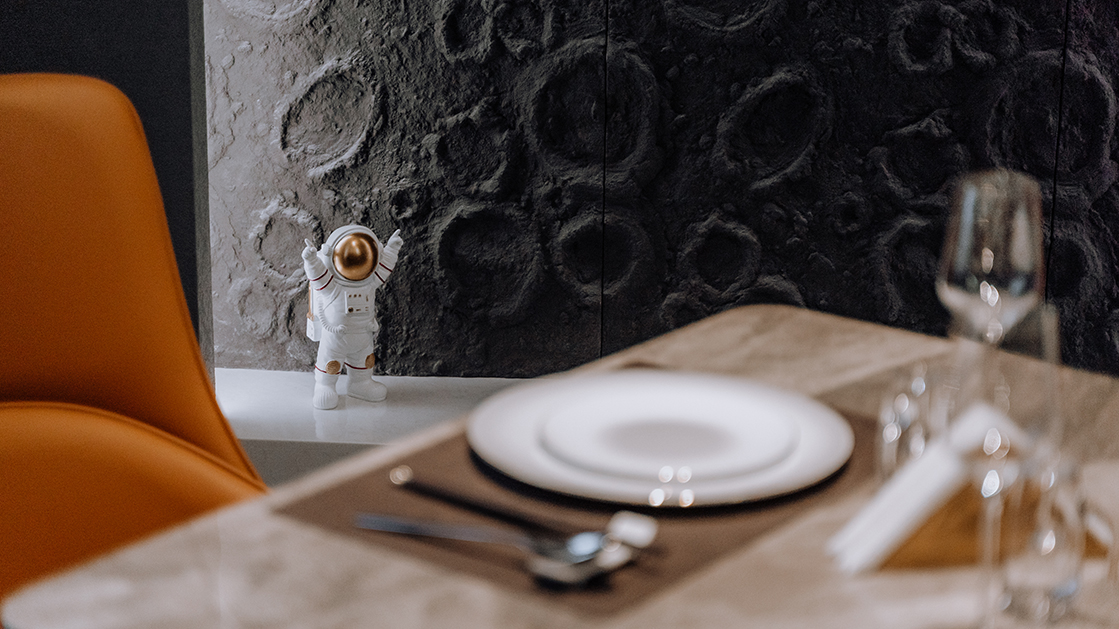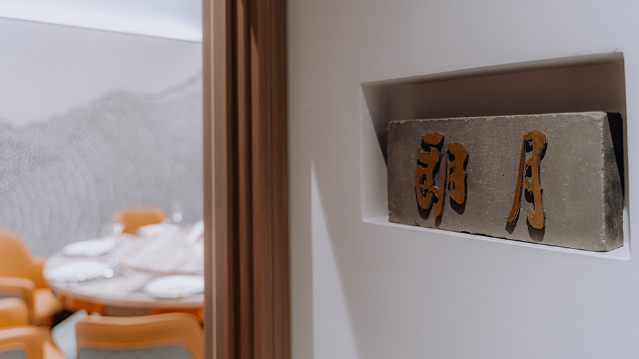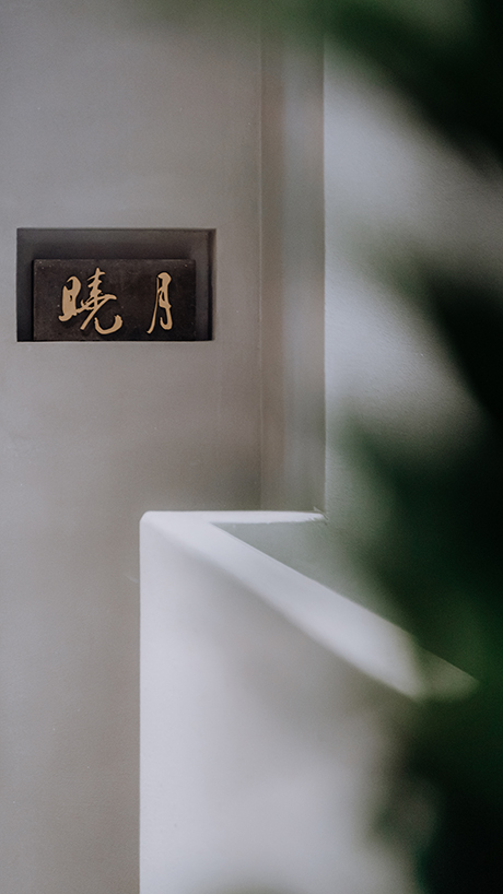 “若人有眼大如天,当见山高月更阔”王阳明这段节选诗句,是这间私厨名字以及整个设计思路的由来。空间转换之中都有“月”的衍生。每个包间都以“月”为主题,但每个包间空间氛围以及颜色搭配都不相同。