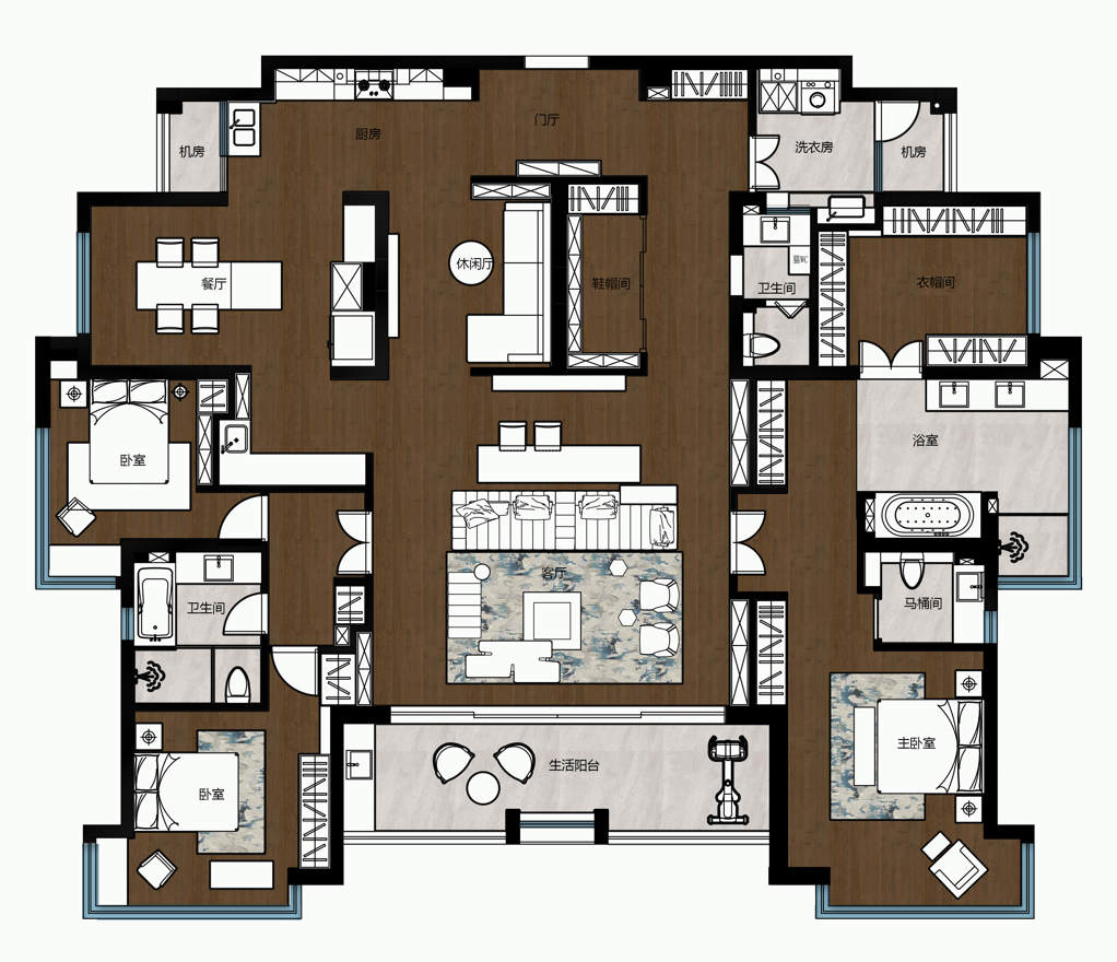 项目定位:本案男主是旅美留学人士,现任国内一投资公司的老总,他要求的空间是不拘束、随意性很强的美式主义,认为凌乱也是美,但空间一定做到动静分明。