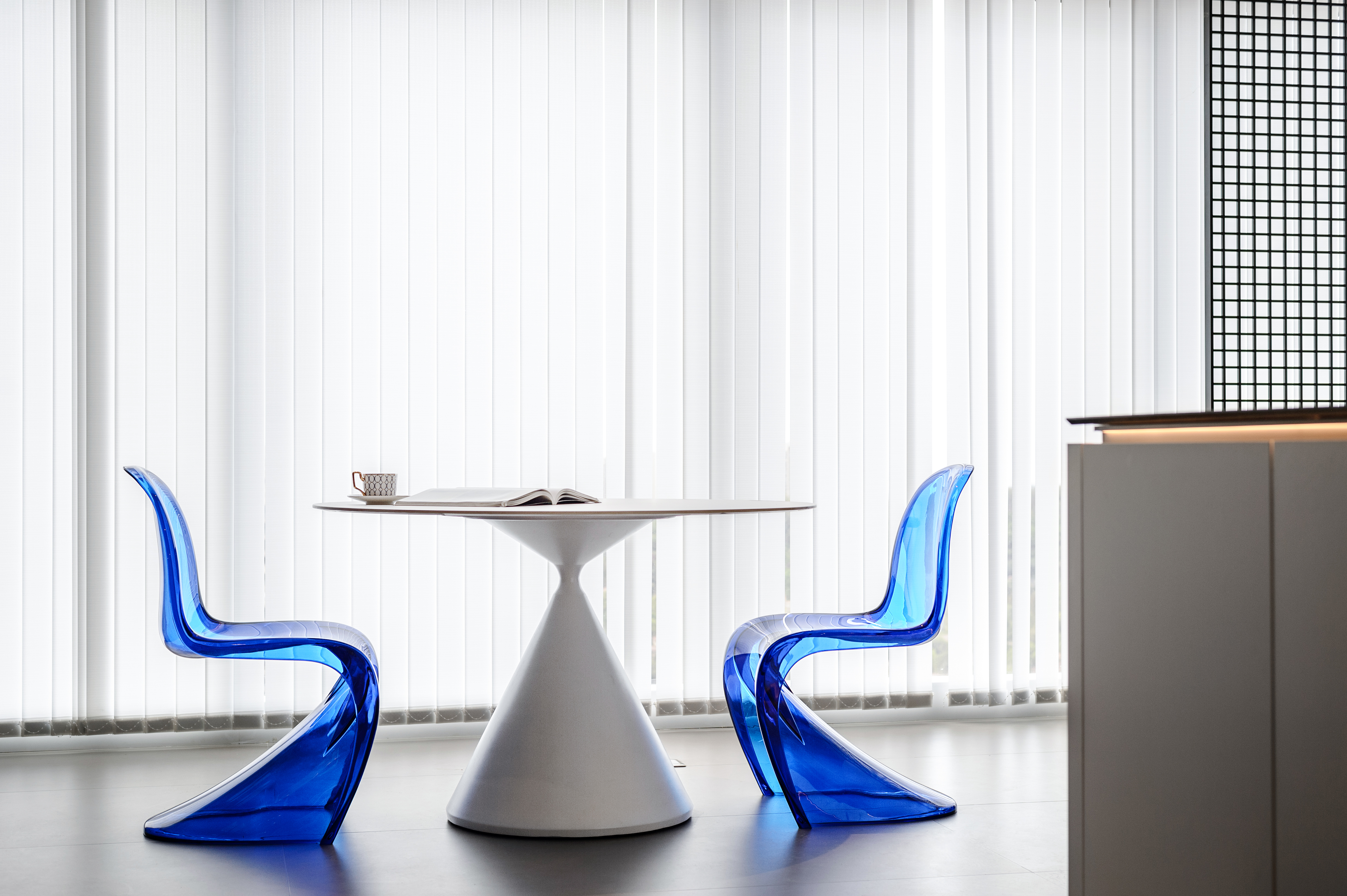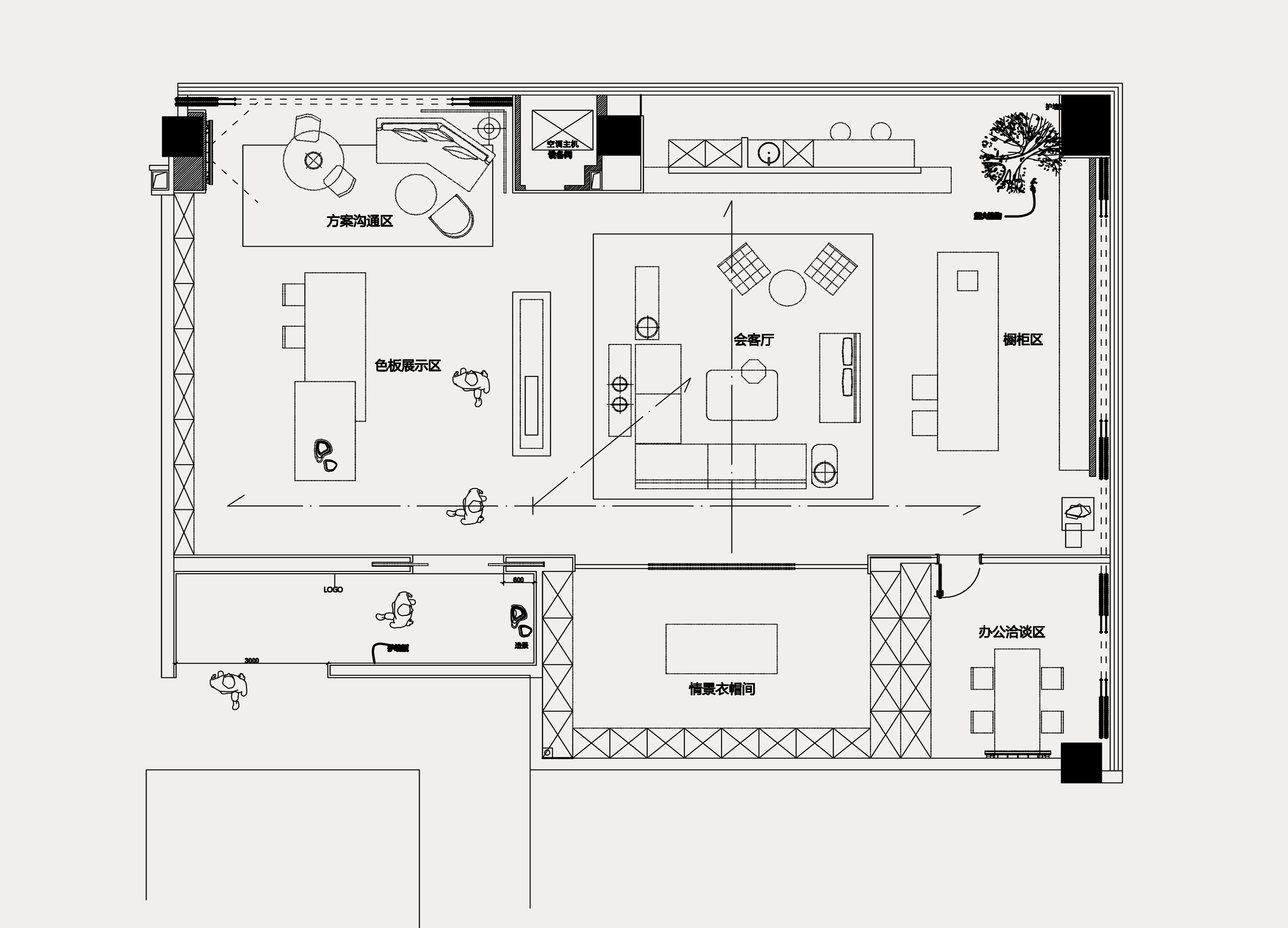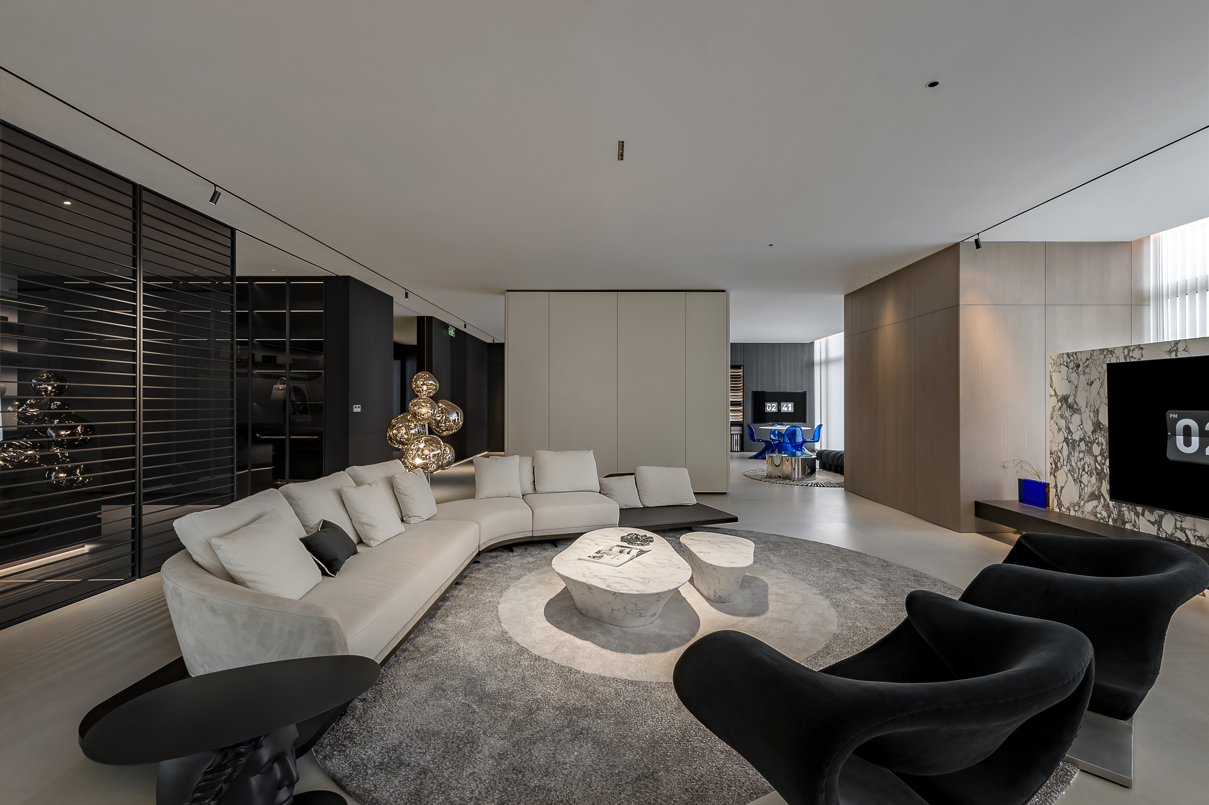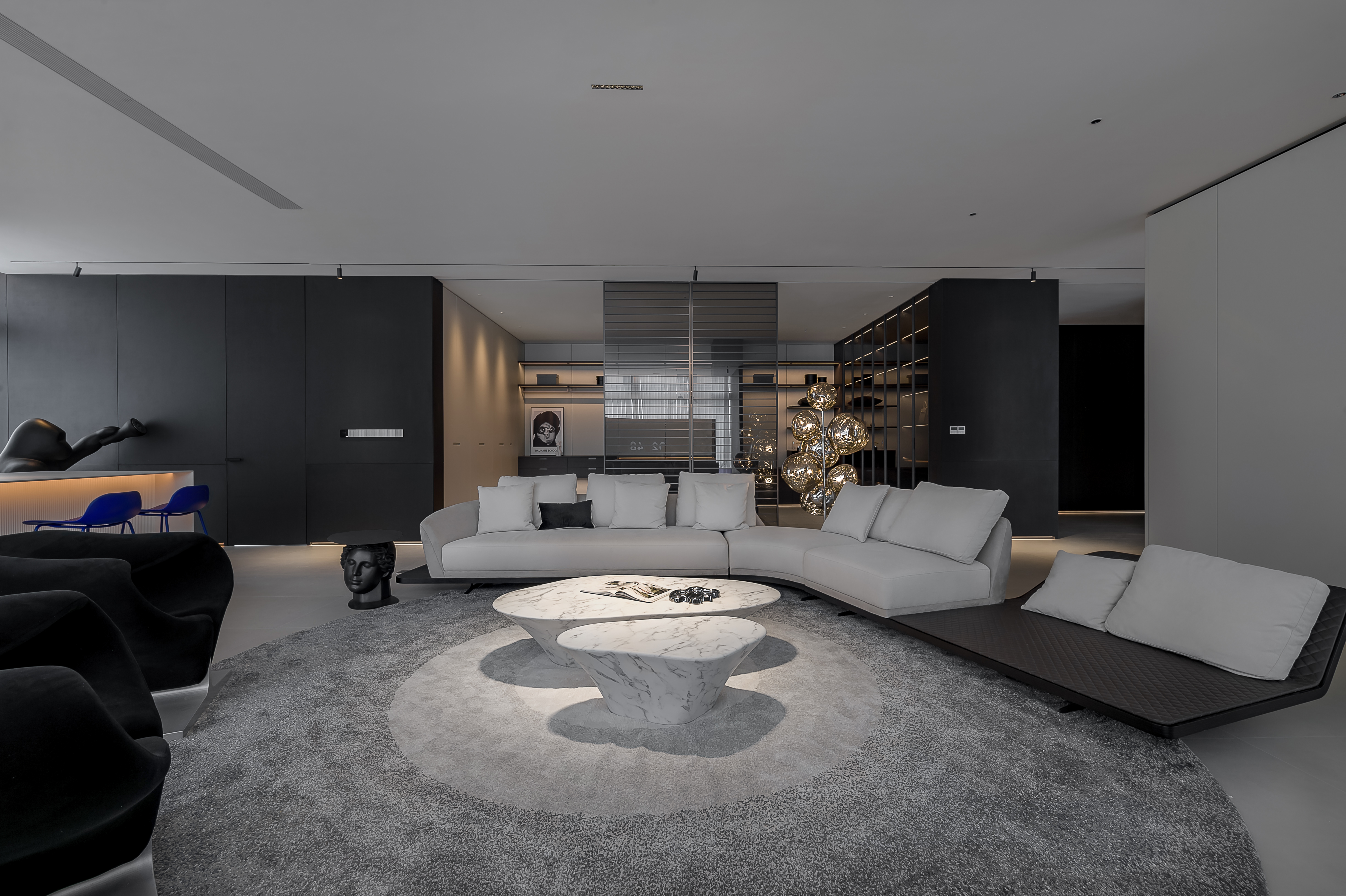 空间布局:本案布局上采用了大场景小空间的方式,没有用过多的墙体来进行分割,而是保留大场景的同时,利用隔断,家具,色彩等软装等围合来制造氛围感。