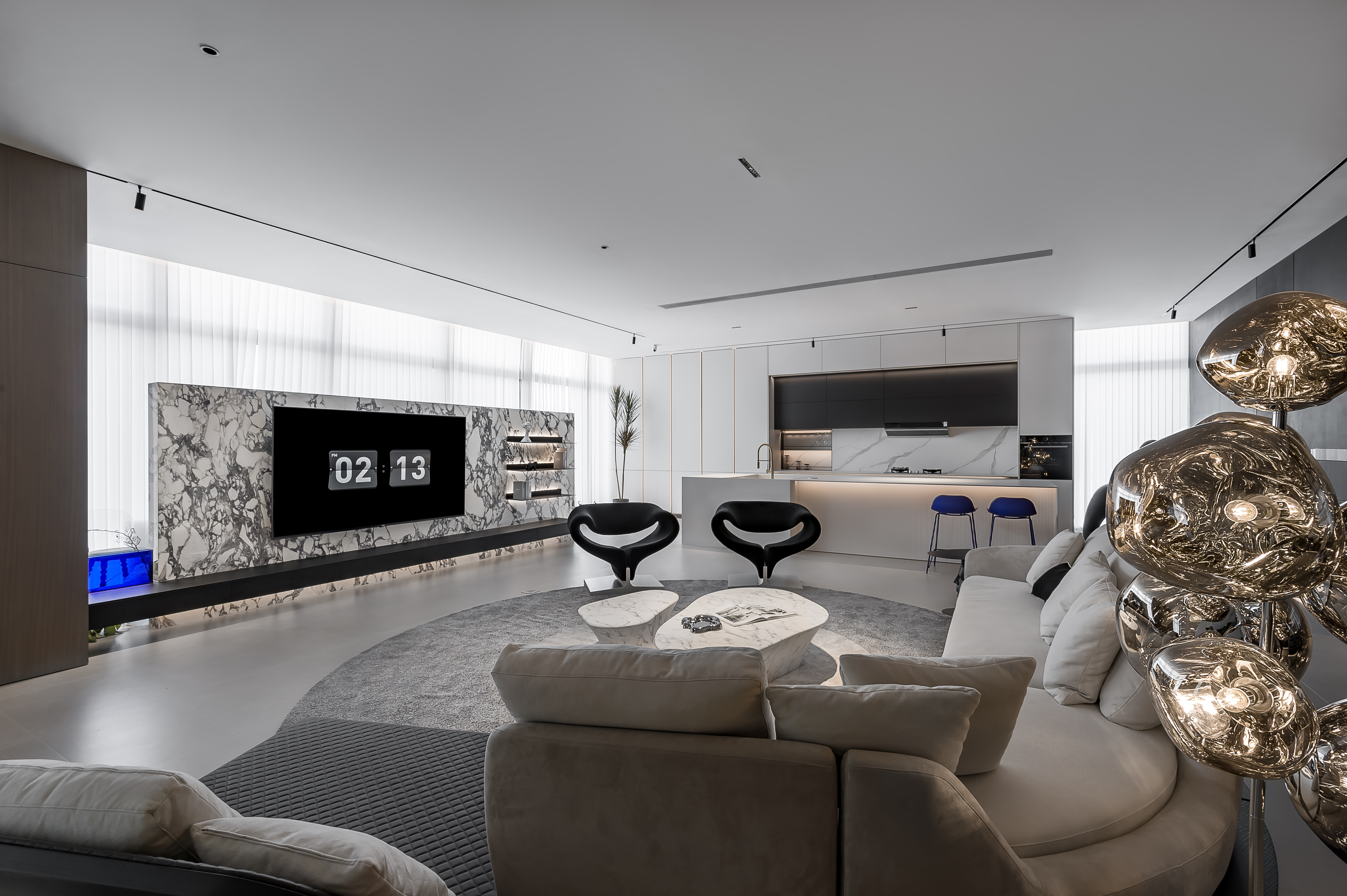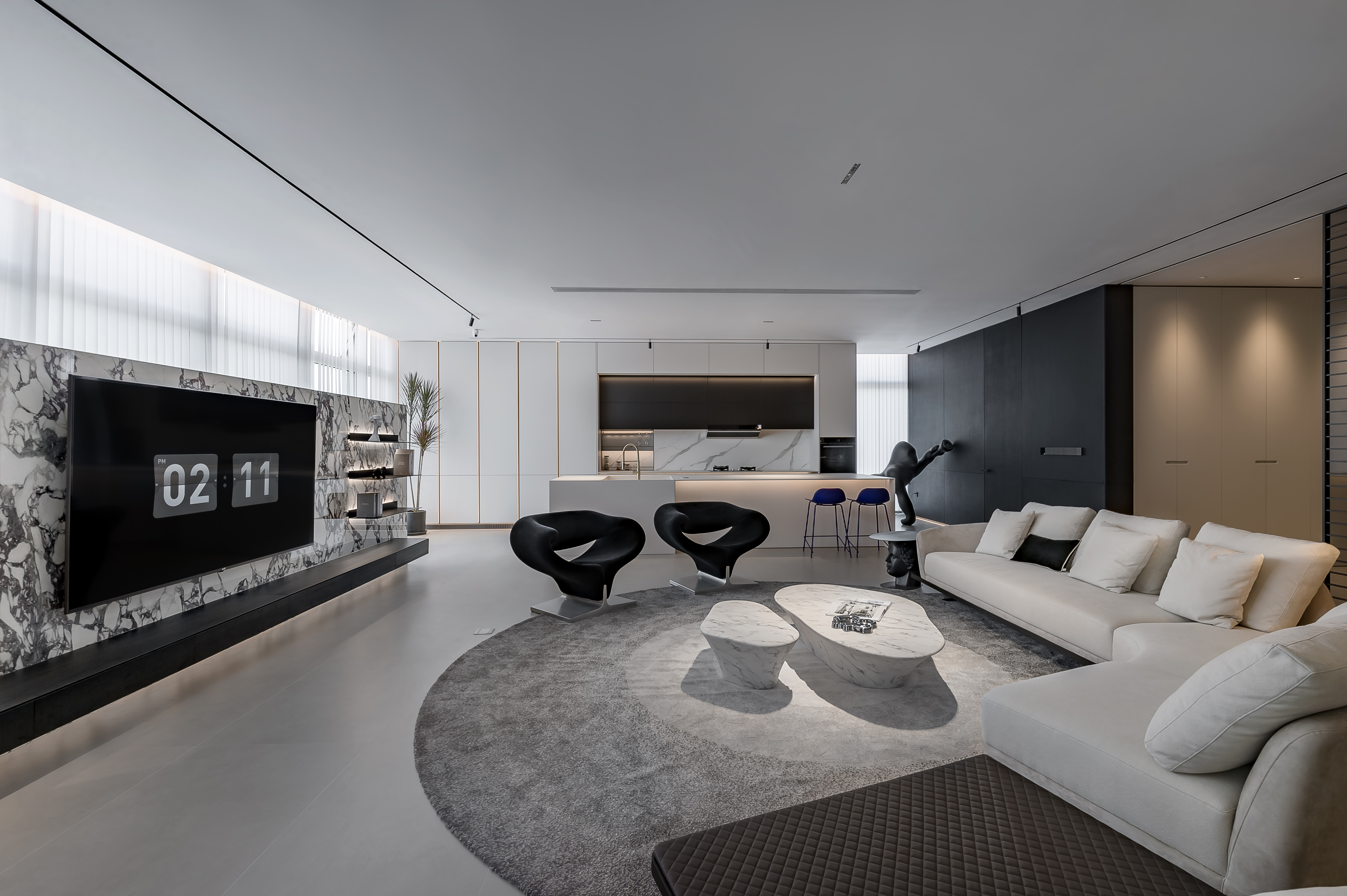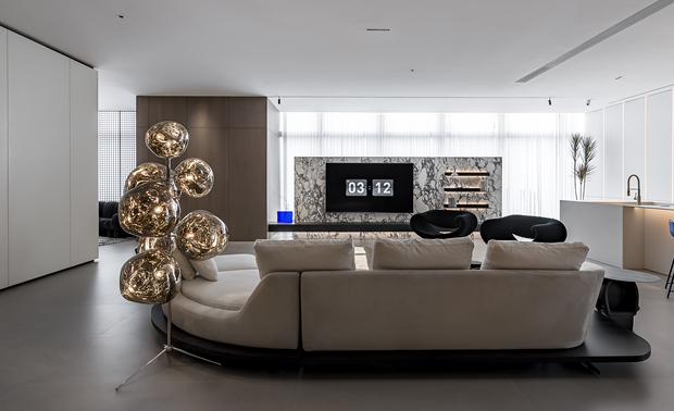 空间意境:该案得益于空中高层,拥有大平层绝佳的视野,在保留大面采光的同时,弱化部分来打造场景空间,使色彩饱和度和空间色彩形成对比,并利用材质的不同,来表达自然与艺术的融合。