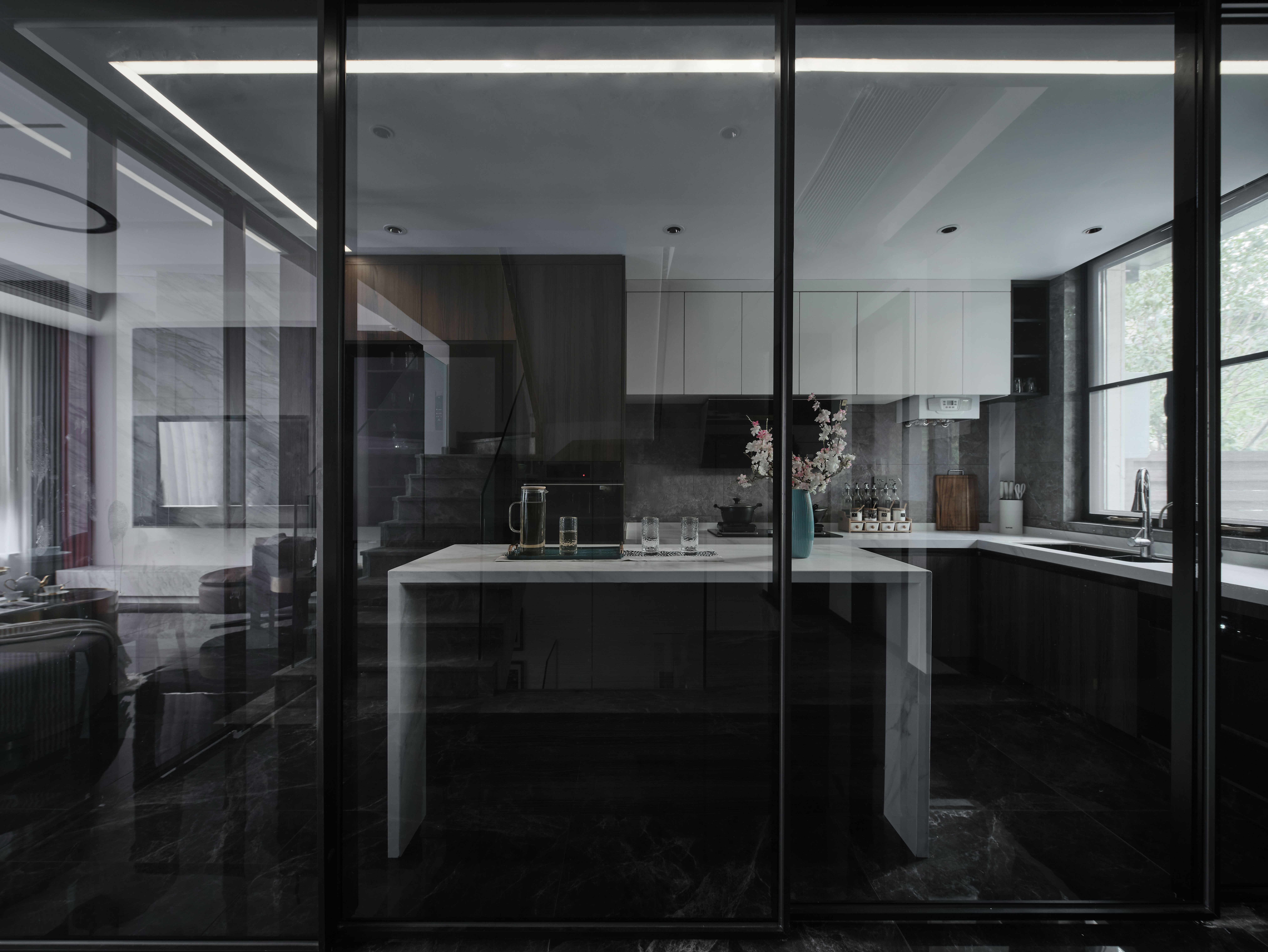 一层作为业主日常生活的重要楼层,同样体现业主对空间的需求。一层空间分为客厅,餐厅,厨房和卫生间。客厅作为一层休闲会客区域,格调的营造必不可少。黑白石材的对比,金属皮革玻璃的穿插,木材和布艺的平衡,无不体现空间的精致感,低调而不失内涵。
