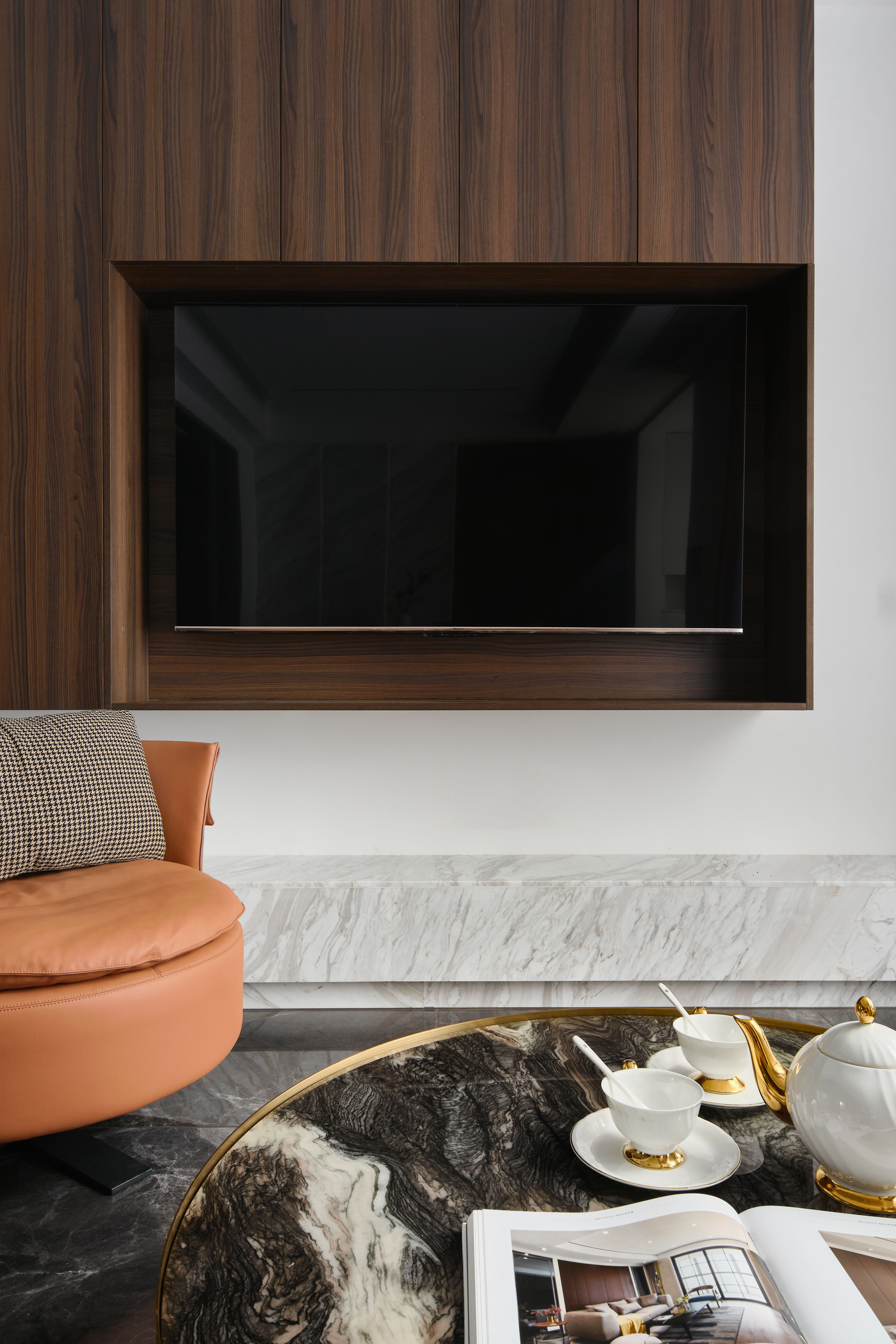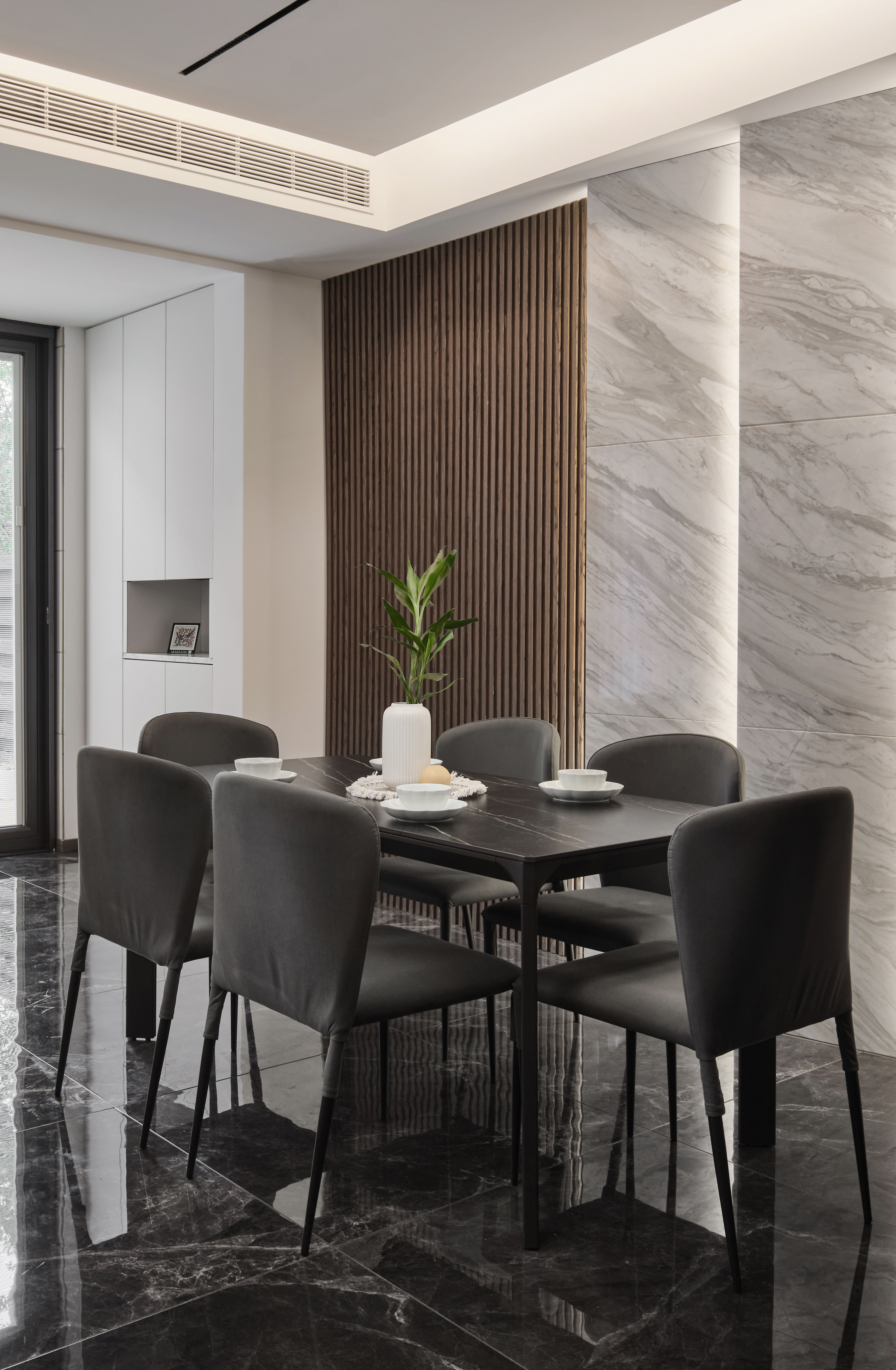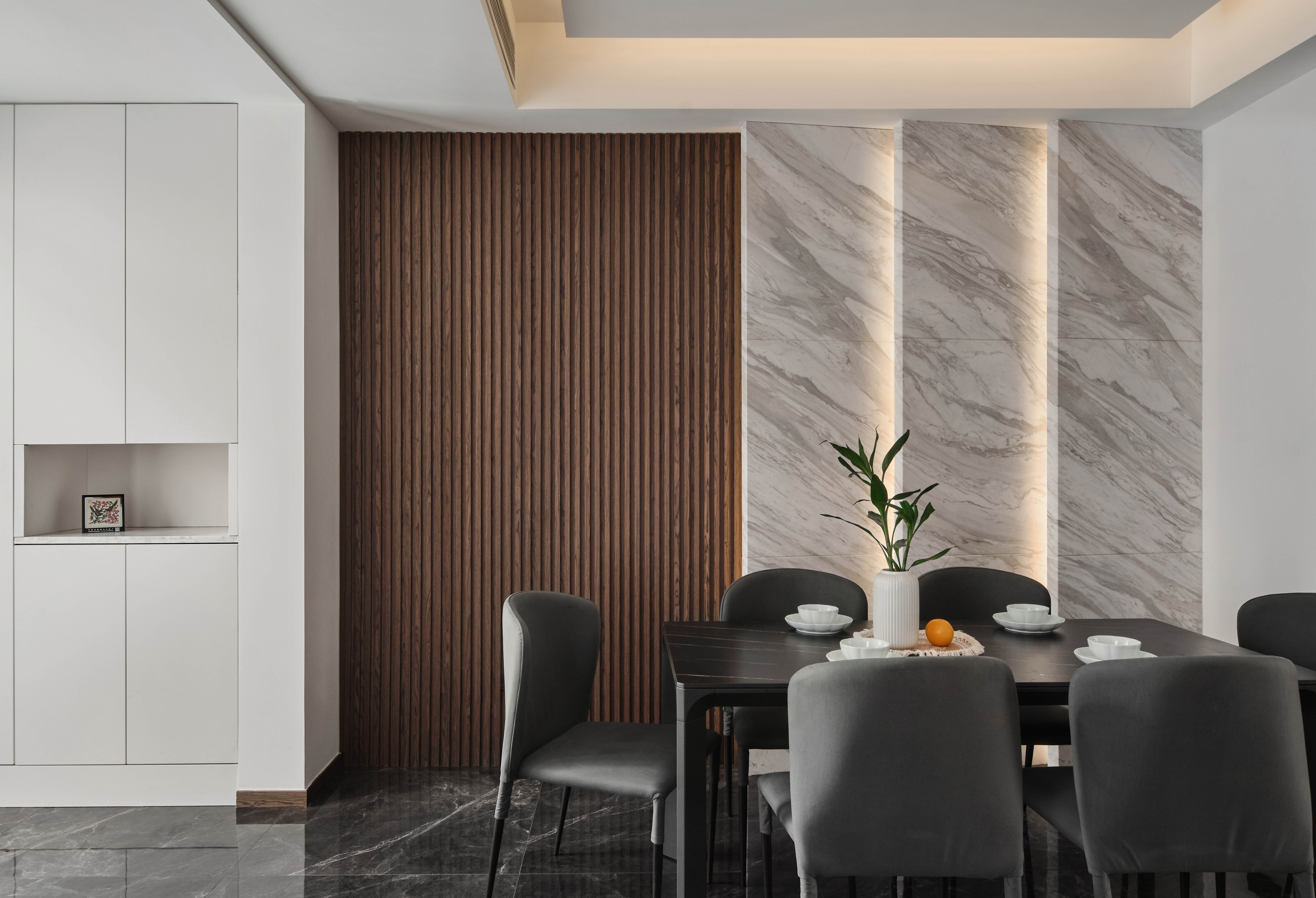餐厅与客厅共同安排在南边的位置,形成一个南向双开间的休闲就餐空间。应用爵士白石材搭配木饰面,呼应电视背景配色,通过背景造型的区别丰富空间表现力