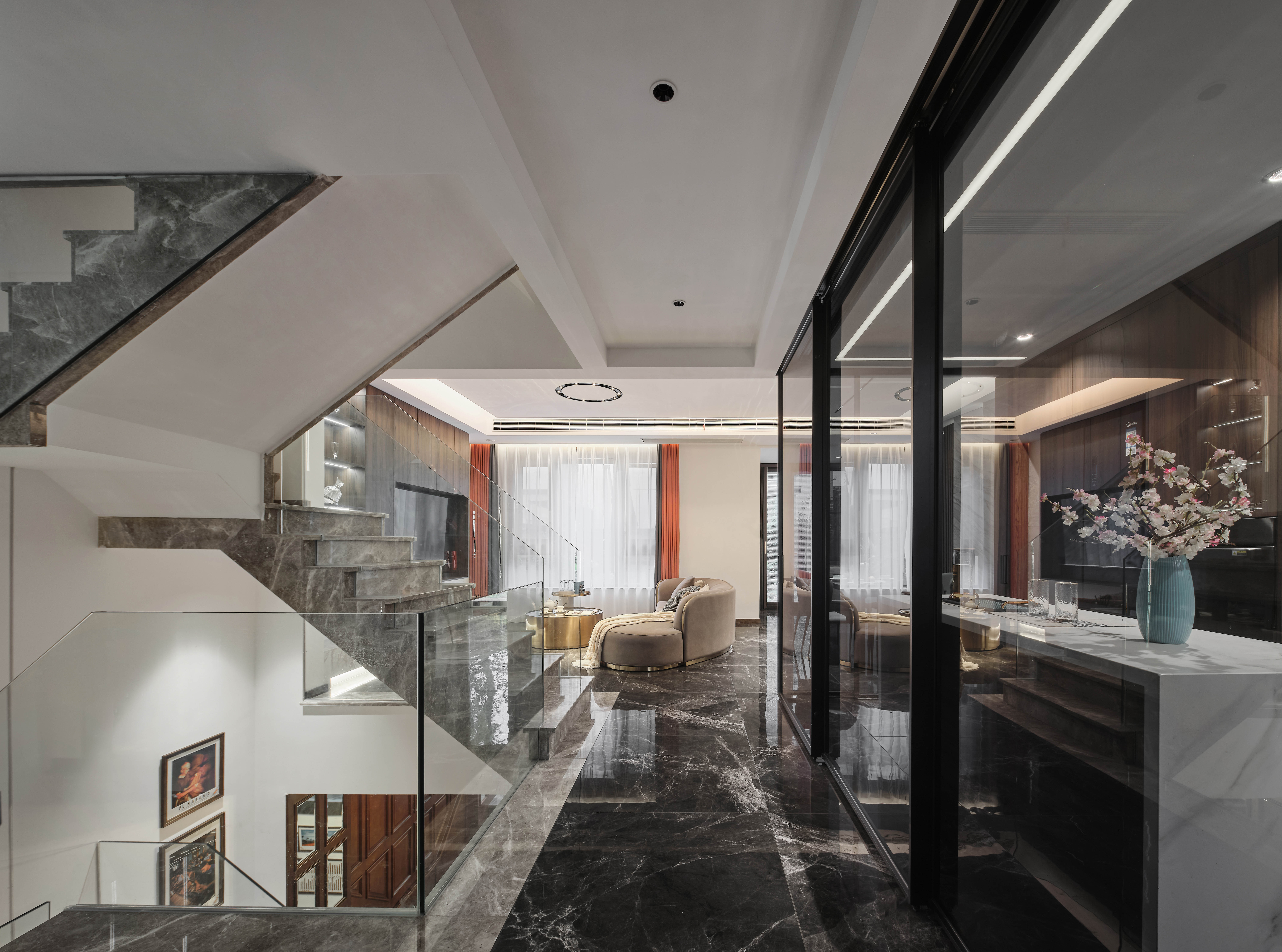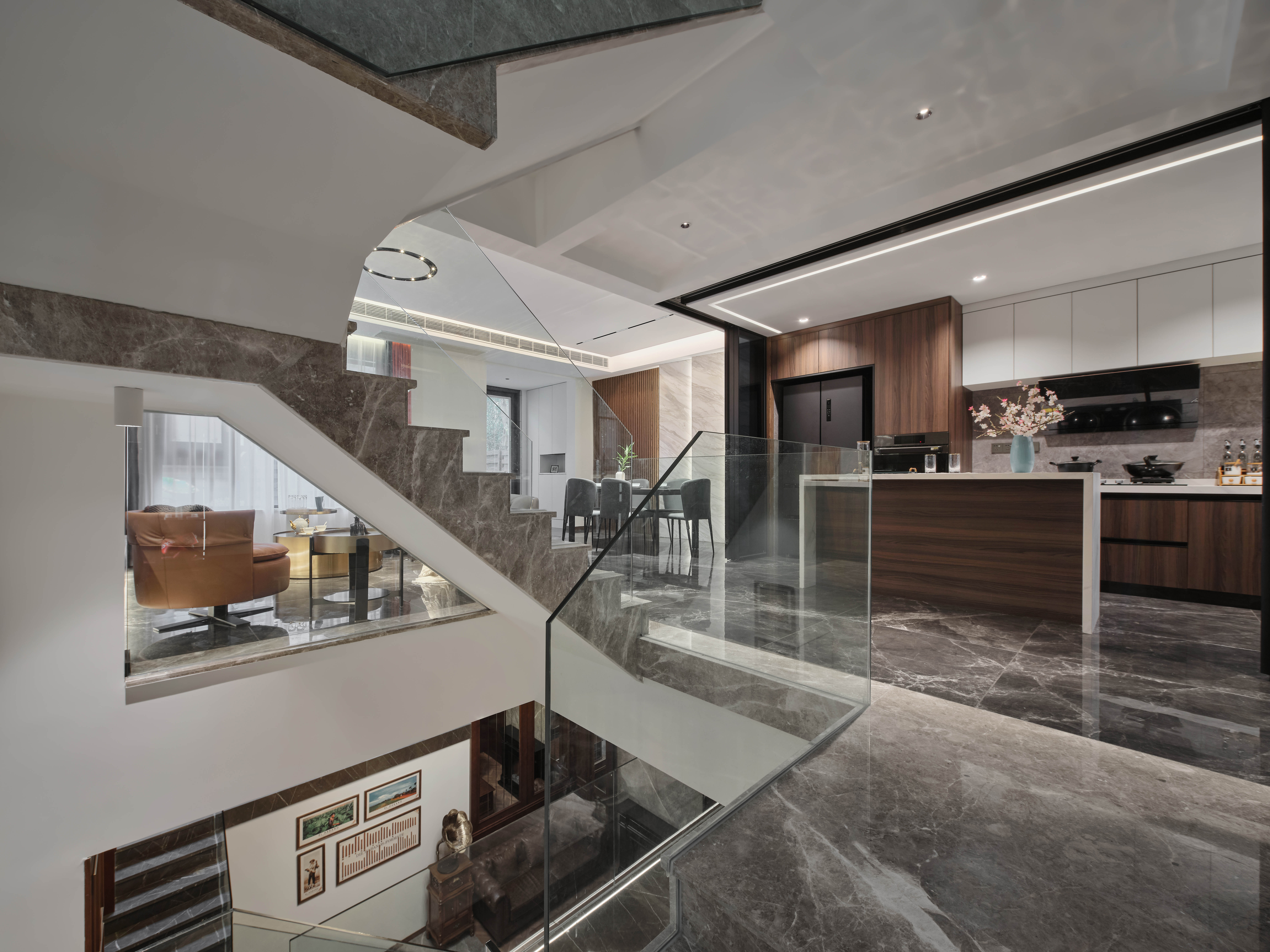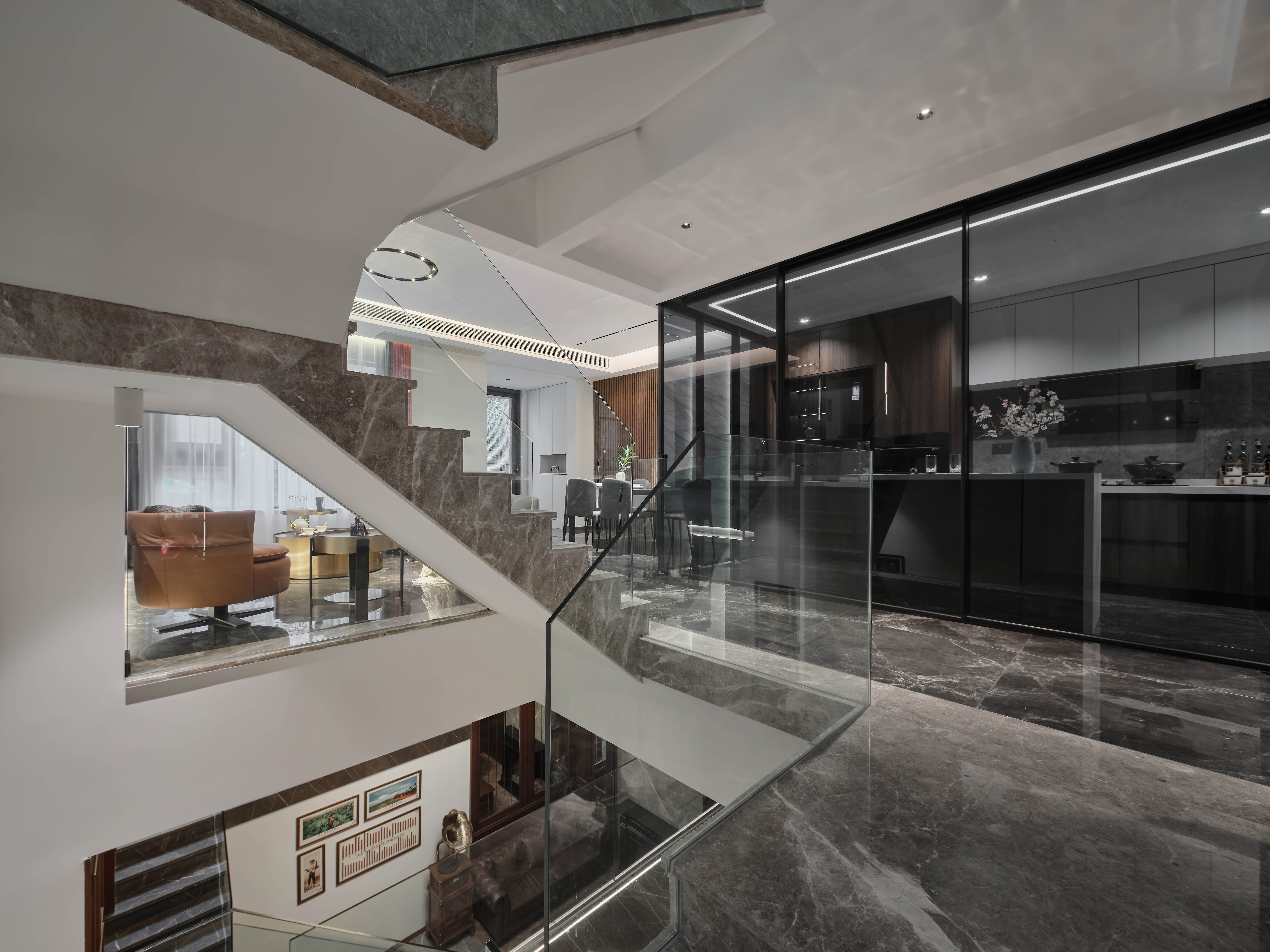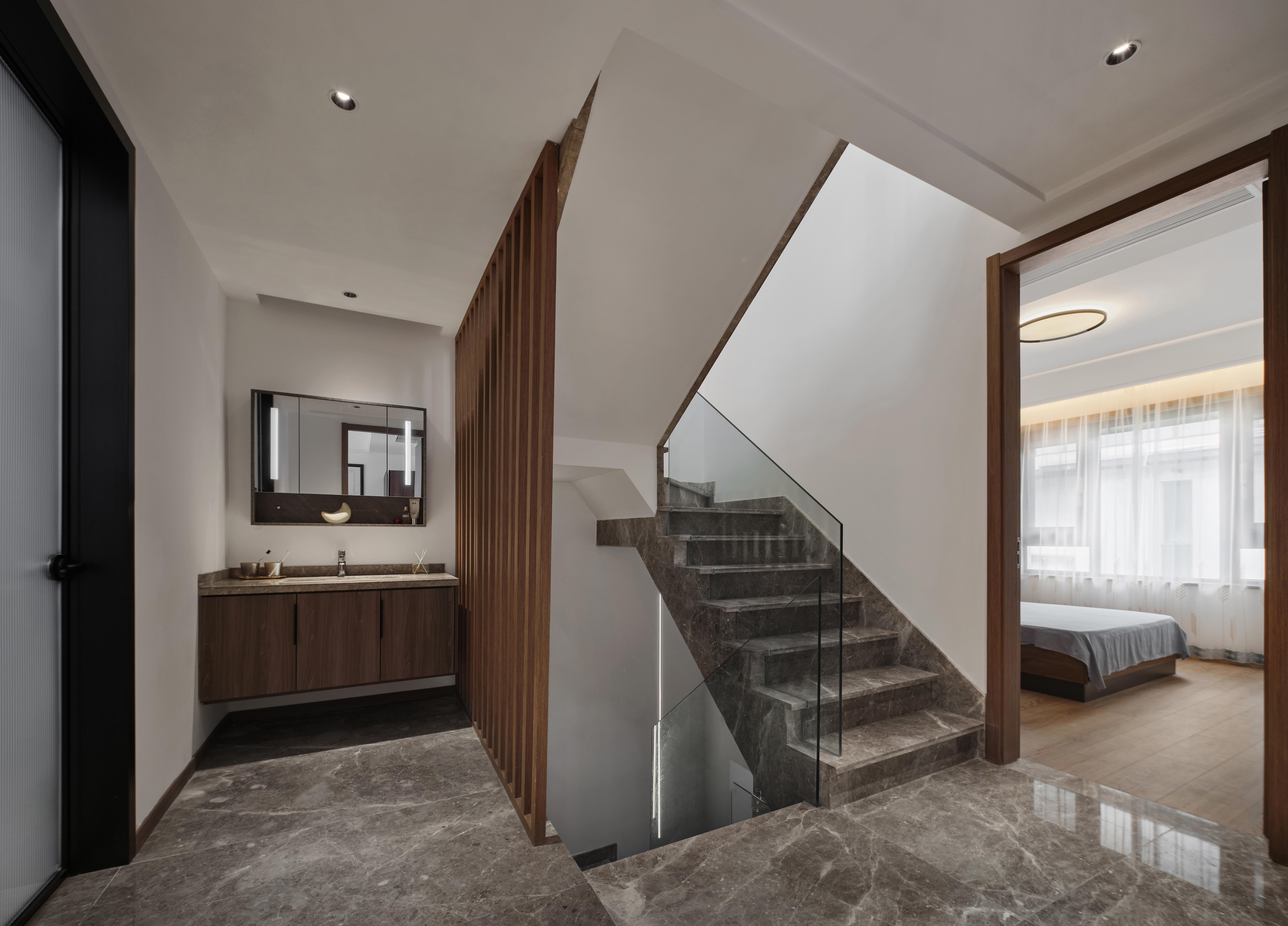 负一层以上楼梯全部采用云朵拉灰石材,暖灰色石材搭配无框玻璃,形成一道连通楼上下的主线。错位的楼梯设计初步考虑到负一层使用空间的规整性以及空间的最大利用,同时有意增加空间的贯通,使地下空间得到更多的通风和采光。同时也增加空间视觉贯通,负二层可以看到一层,一层可以看到负二层,增强不同楼层的家庭成员联系。同时不同风格空间之间的相互碰撞,相互成就,使得每一种风格在各自的对比下尤为明显。