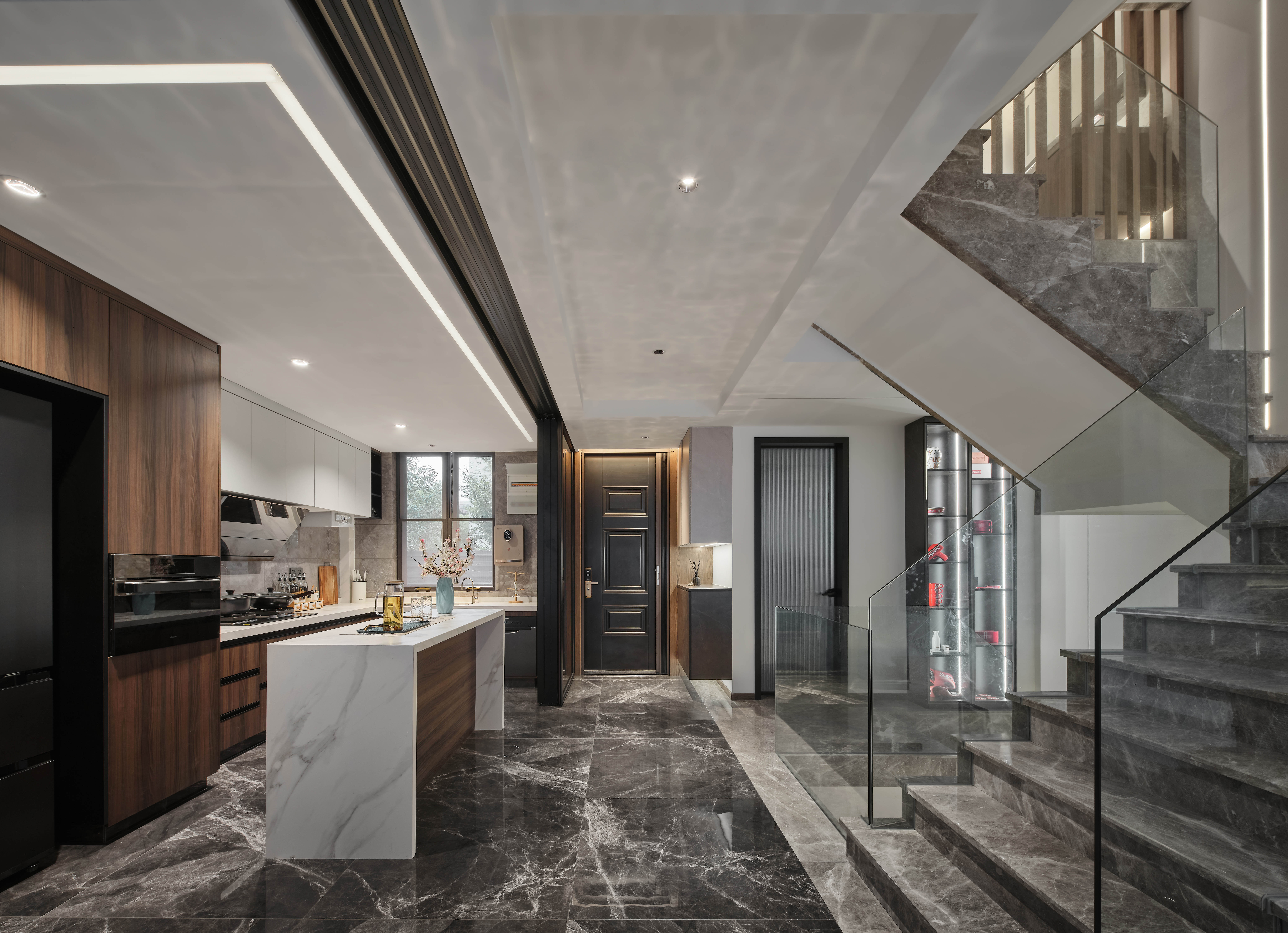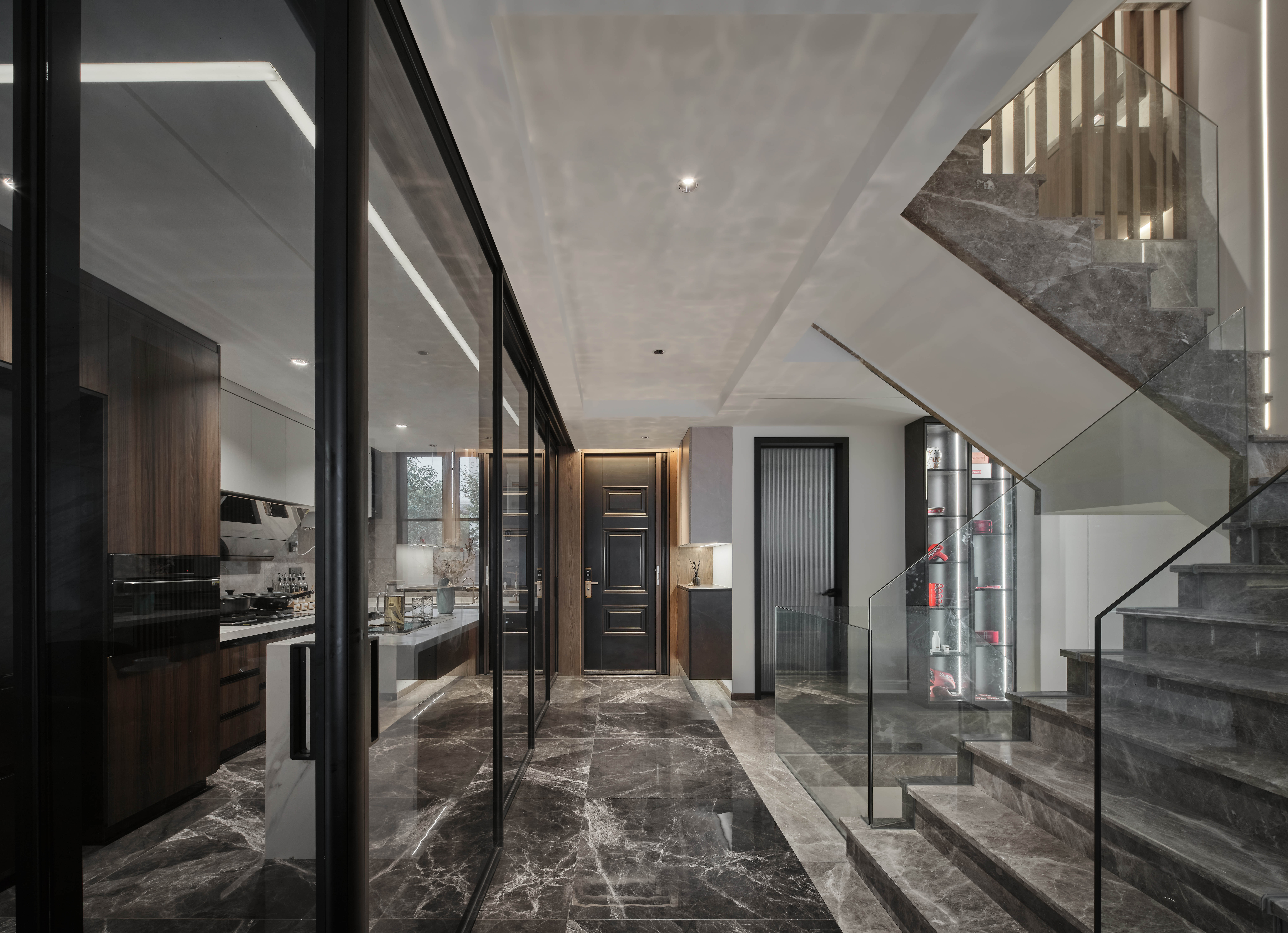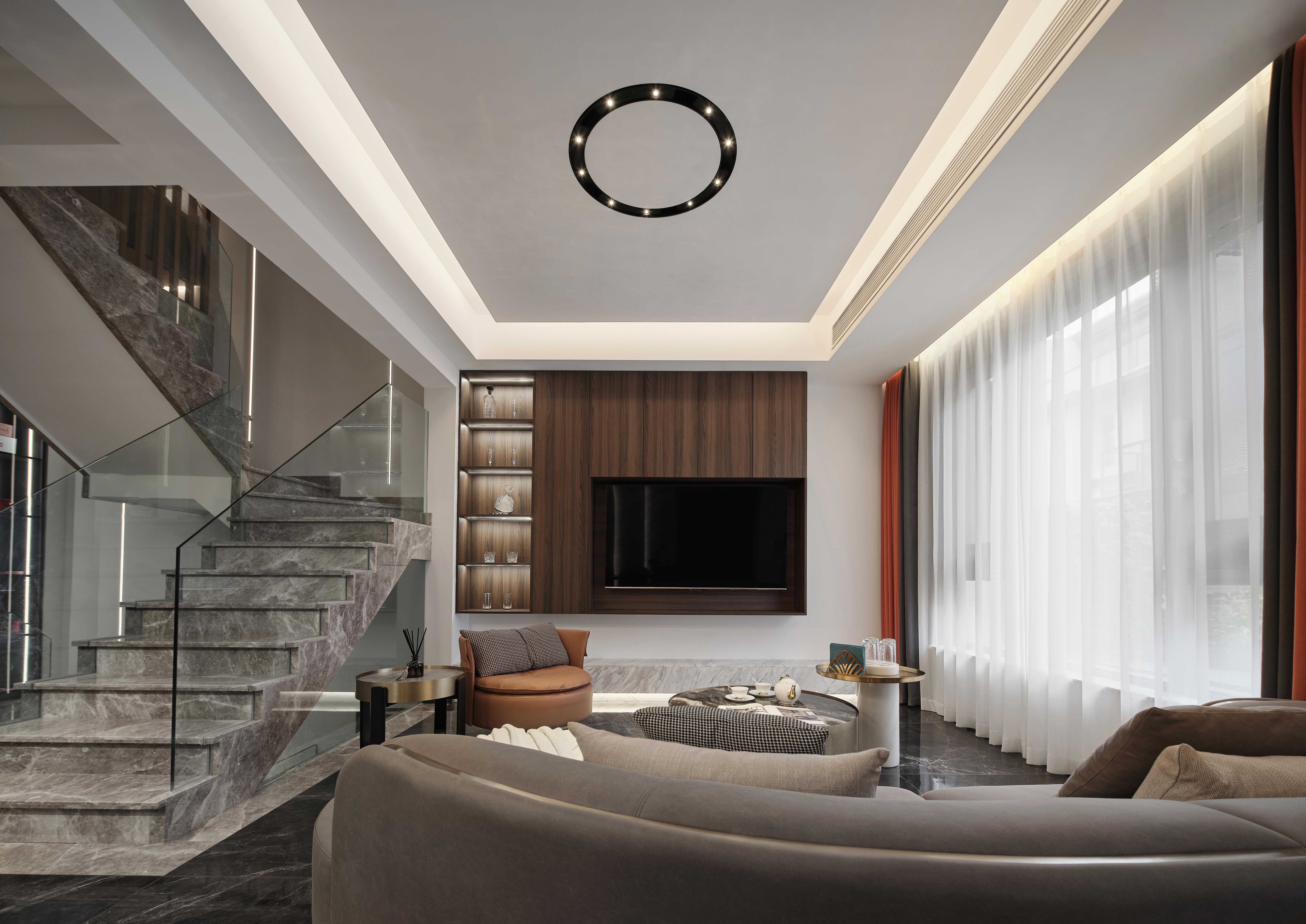 负一层以上楼梯全部采用云朵拉灰石材,暖灰色石材搭配无框玻璃,形成一道连通楼上下的主线。错位的楼梯设计初步考虑到负一层使用空间的规整性以及空间的最大利用,同时有意增加空间的贯通,使地下空间得到更多的通风和采光。同时也增加空间视觉贯通,负二层可以看到一层,一层可以看到负二层,增强不同楼层的家庭成员联系。同时不同风格空间之间的相互碰撞,相互成就,使得每一种风格在各自的对比下尤为明显。