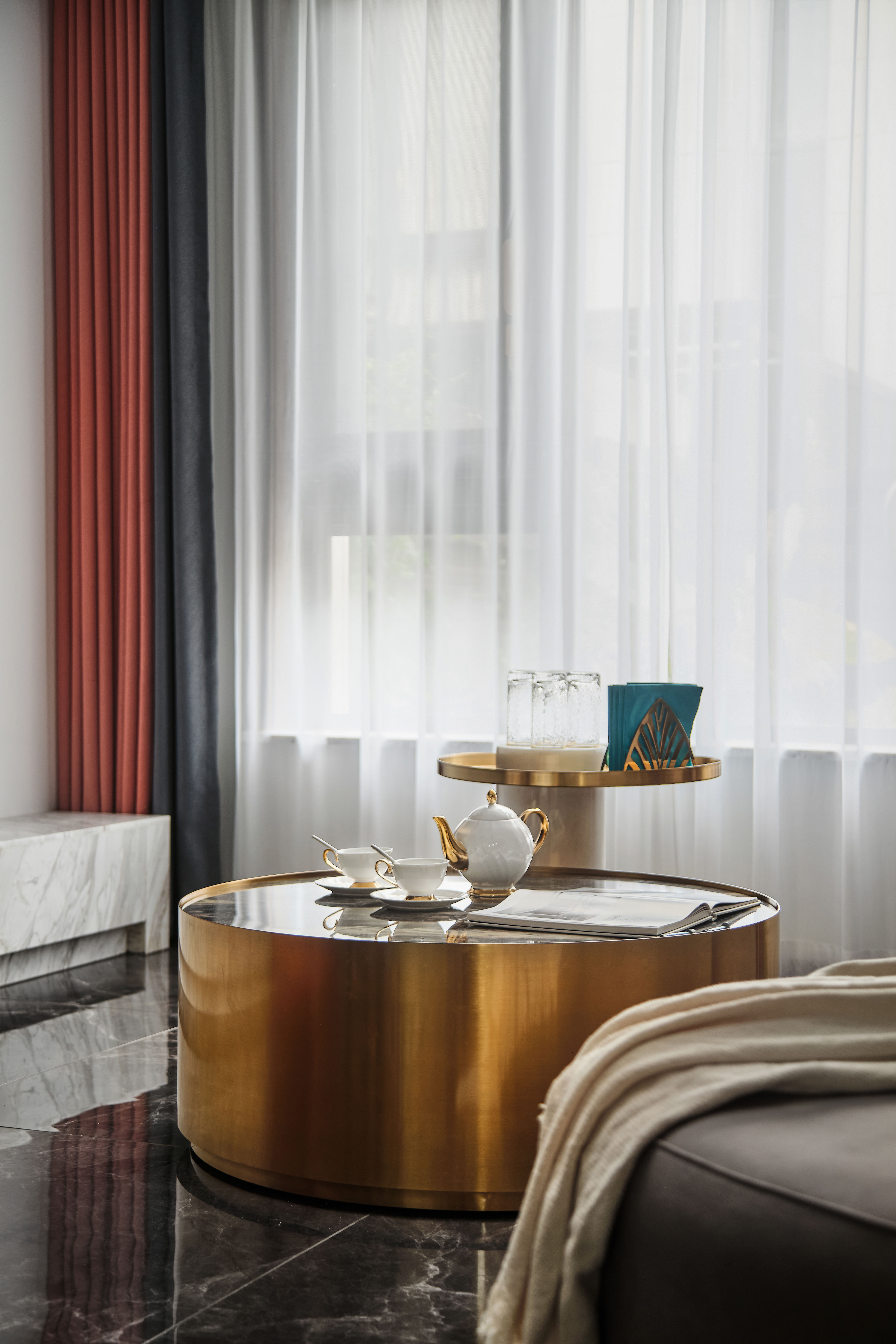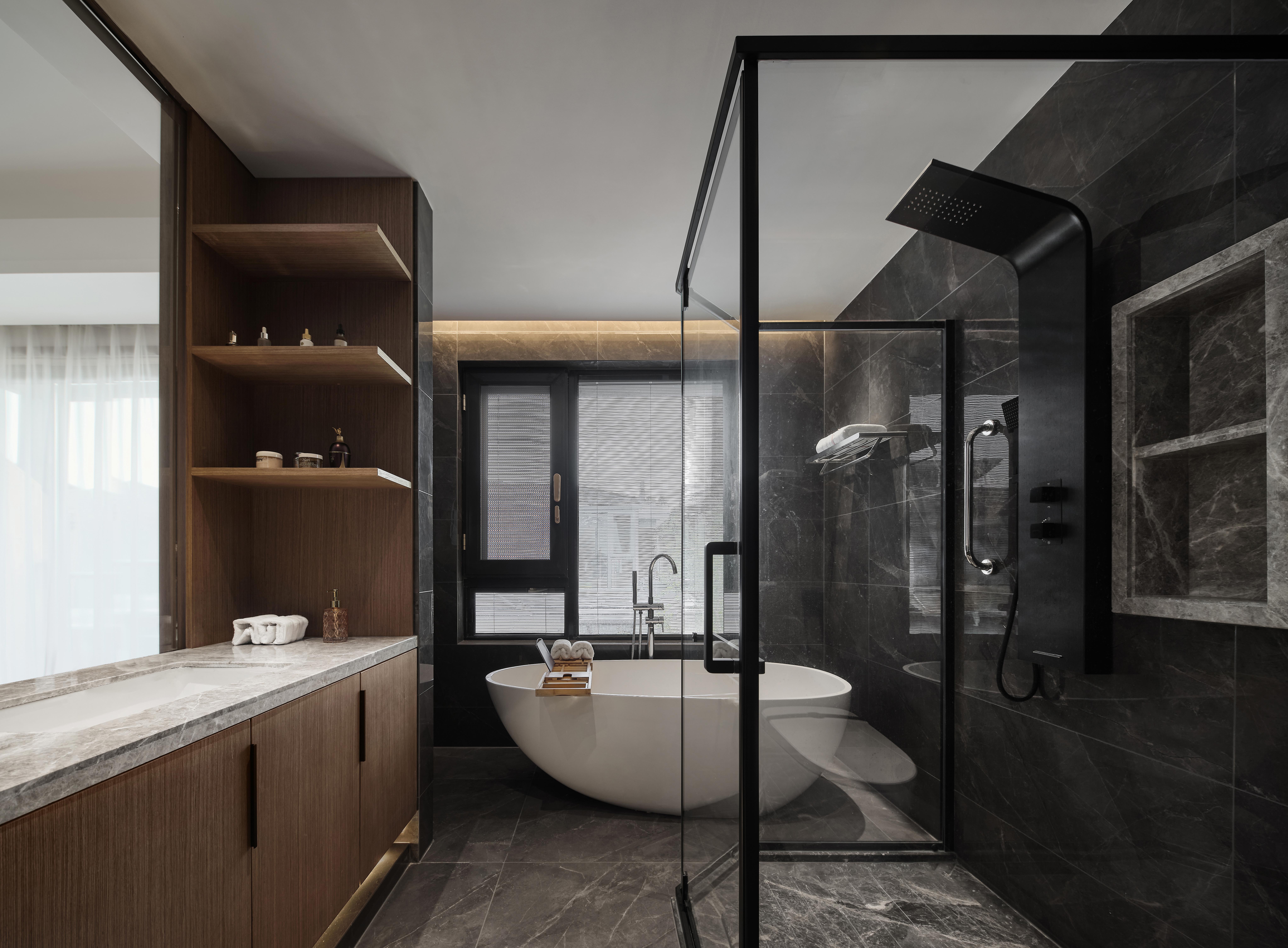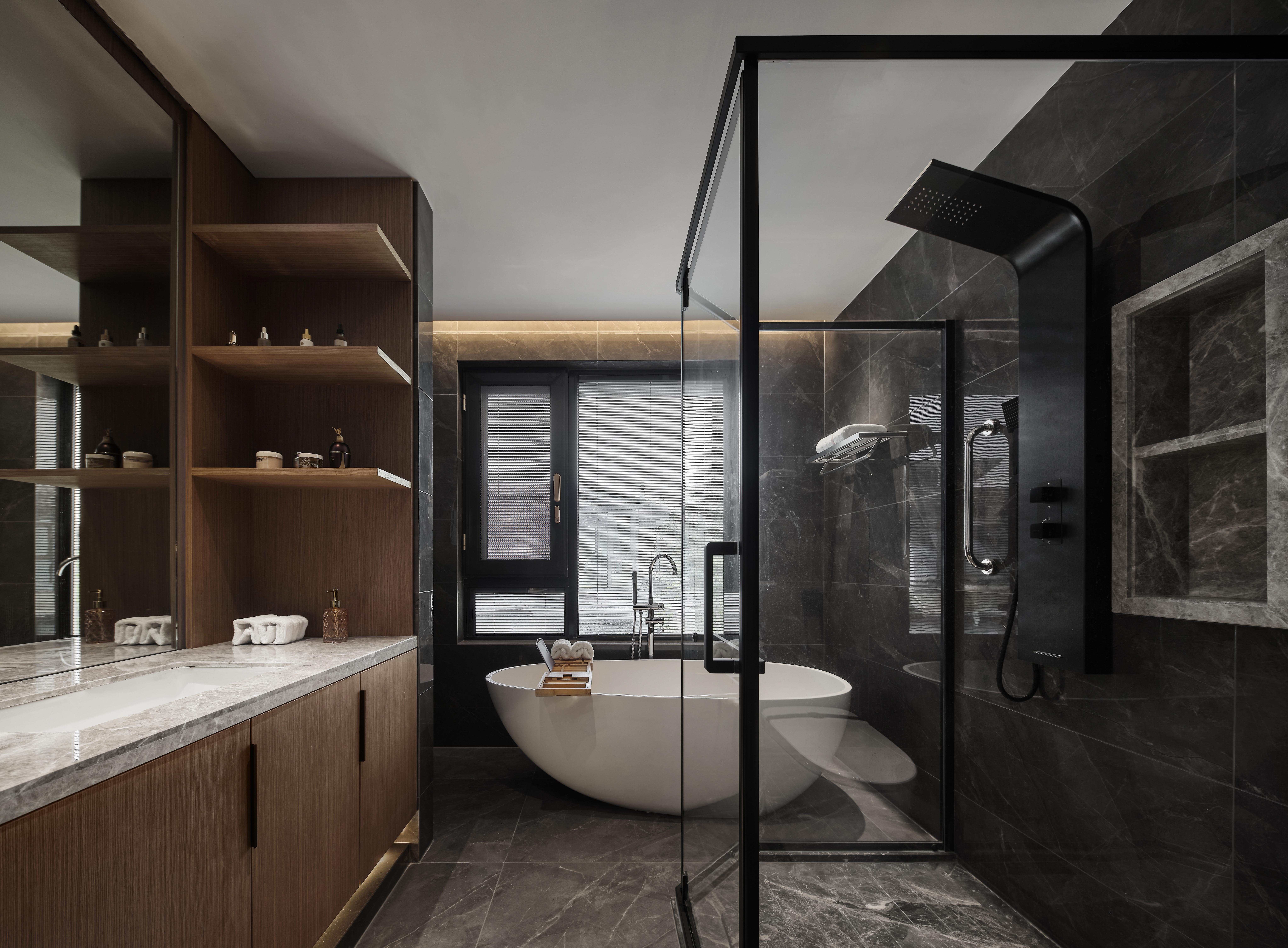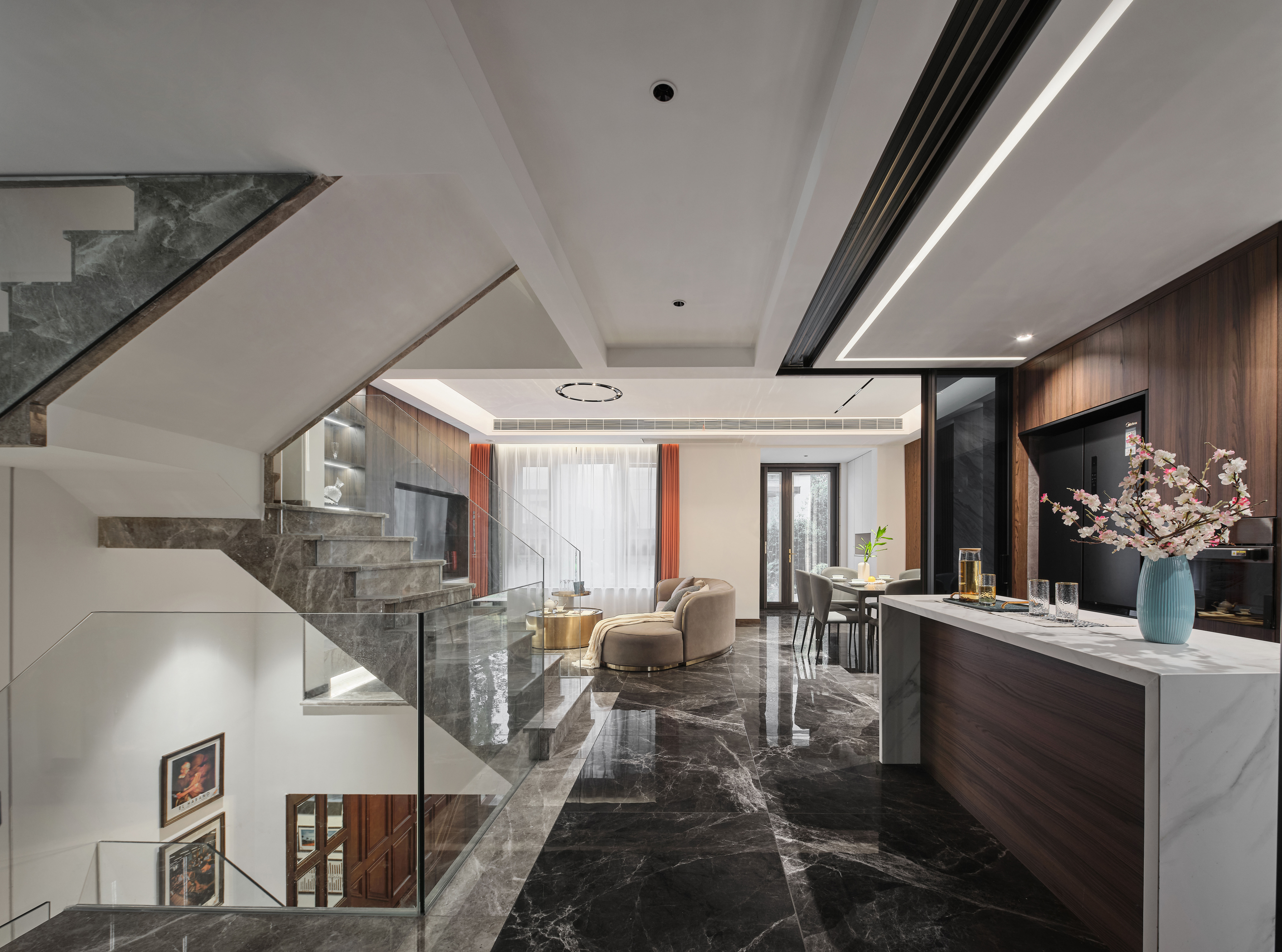 负一层以上楼梯全部采用云朵拉灰石材,暖灰色石材搭配无框玻璃,形成一道连通楼上下的主线。错位的楼梯设计初步考虑到负一层使用空间的规整性以及空间的最大利用,同时有意增加空间的贯通,使地下空间得到更多的通风和采光。同时也增加空间视觉贯通,负二层可以看到一层,一层可以看到负二层,增强不同楼层的家庭成员联系。同时不同风格空间之间的相互碰撞,相互成就,使得每一种风格在各自的对比下尤为明显。