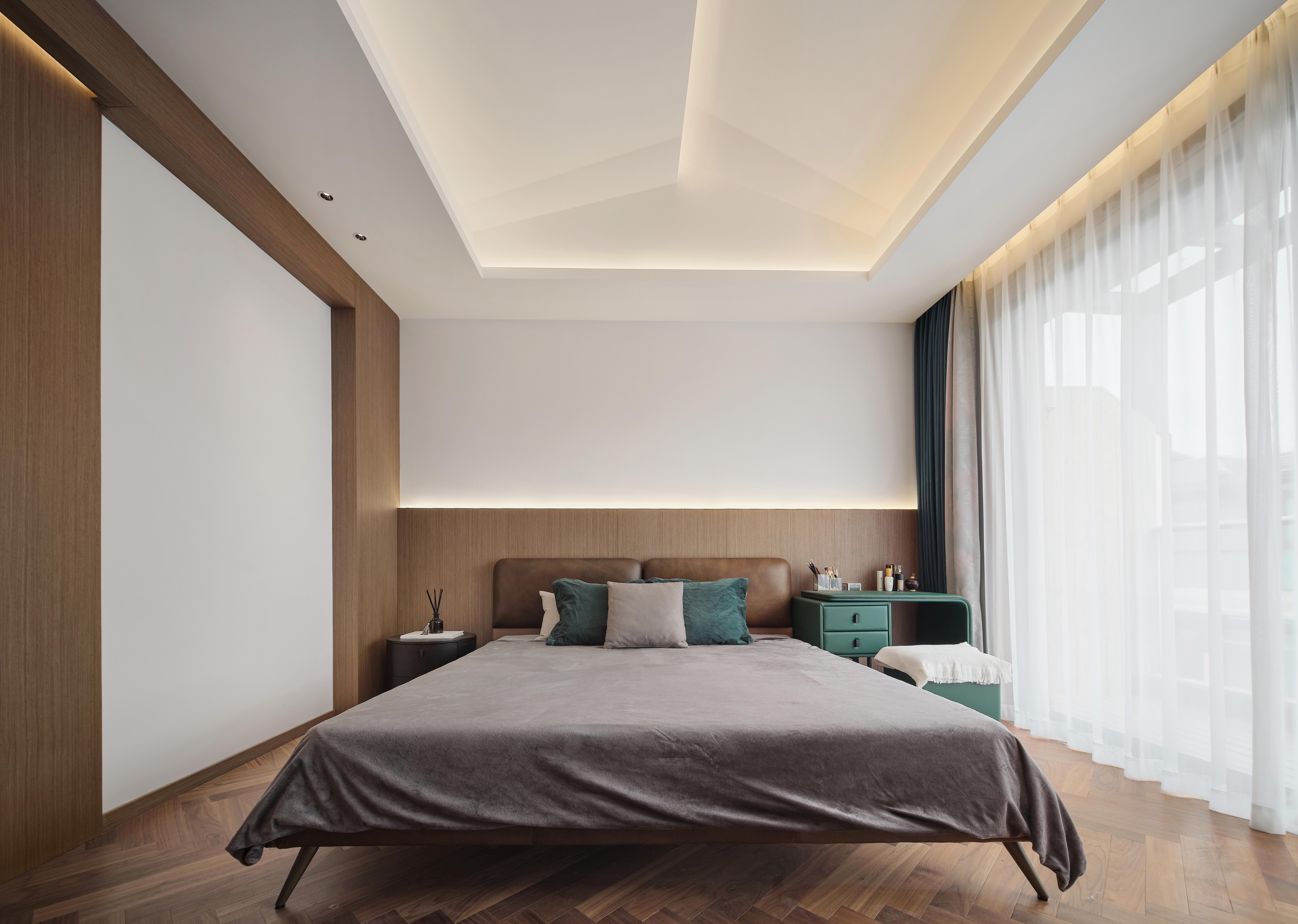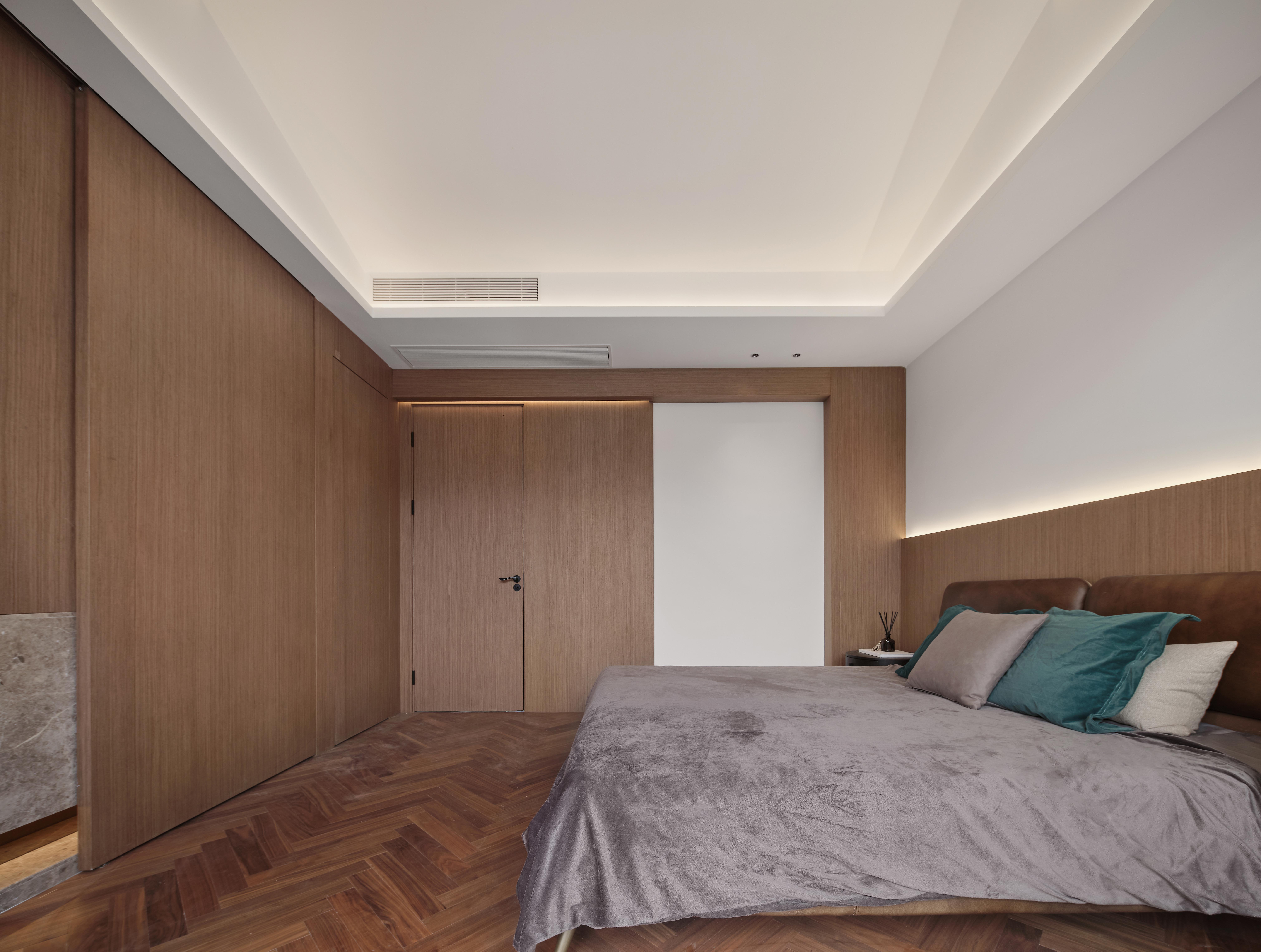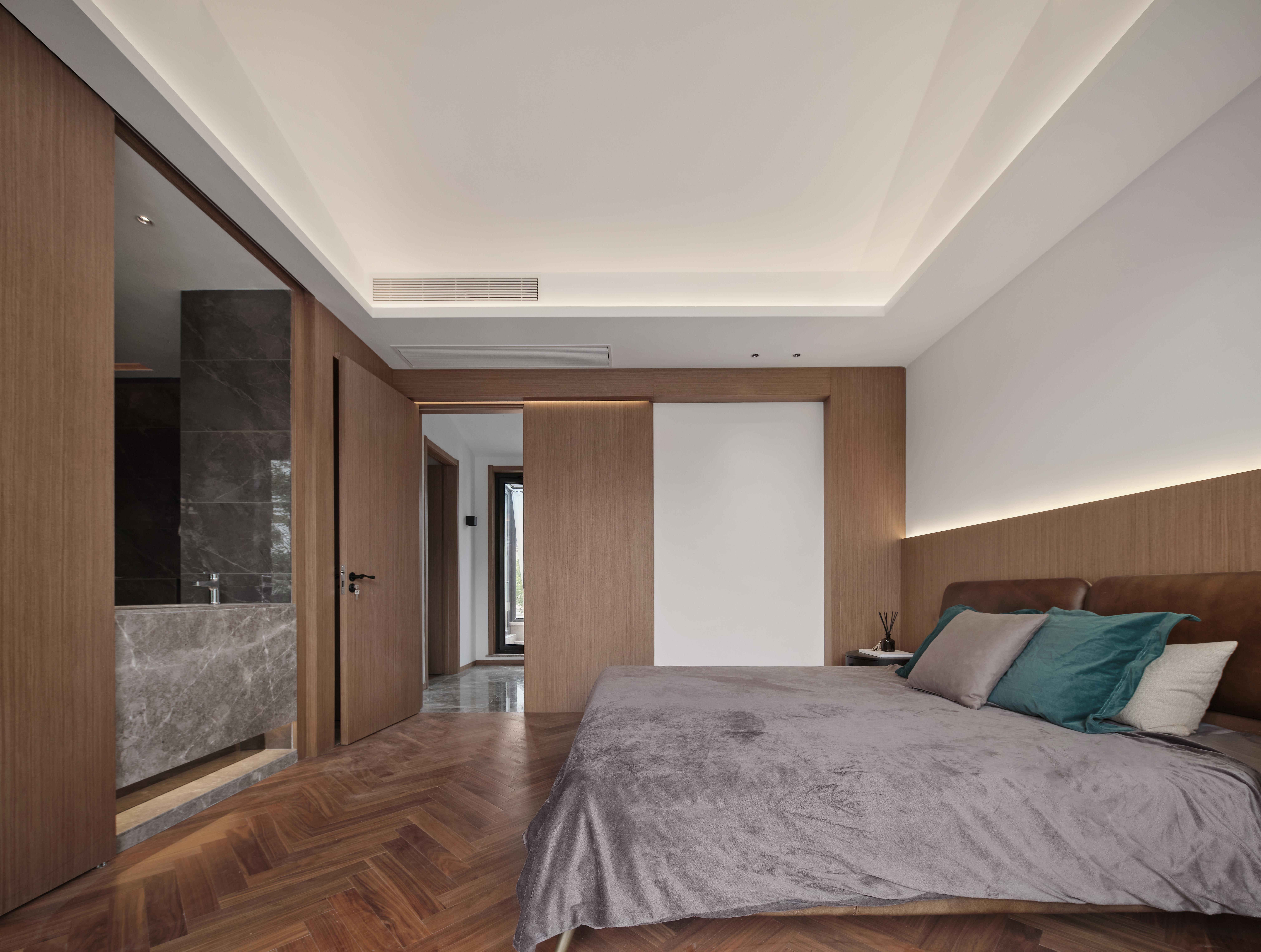 三层空间为主卧空间,搭配南阳台和北露台。主卧空间分为床品区,卫生间和衣帽间。空间整体为现代极简风格,简约的直线条穿插整个空间。木饰面与白色乳胶漆的搭配增加空间层次感,卫生间台盆双面可用,无论在床品区还是卫生间内部都可使用,通过同木色移门可对台盆区域空档进行覆盖,避免房主在睡觉时床品区与卫生间互通。同时台盆区域木制移门背后配备了嵌入式镜子,移门关上的同时,在卫生间使用台盆也可以有镜子能用。吊顶则采用人字型方式,搭配灯带的无主灯设计,简约的同时也增加空间体量感。