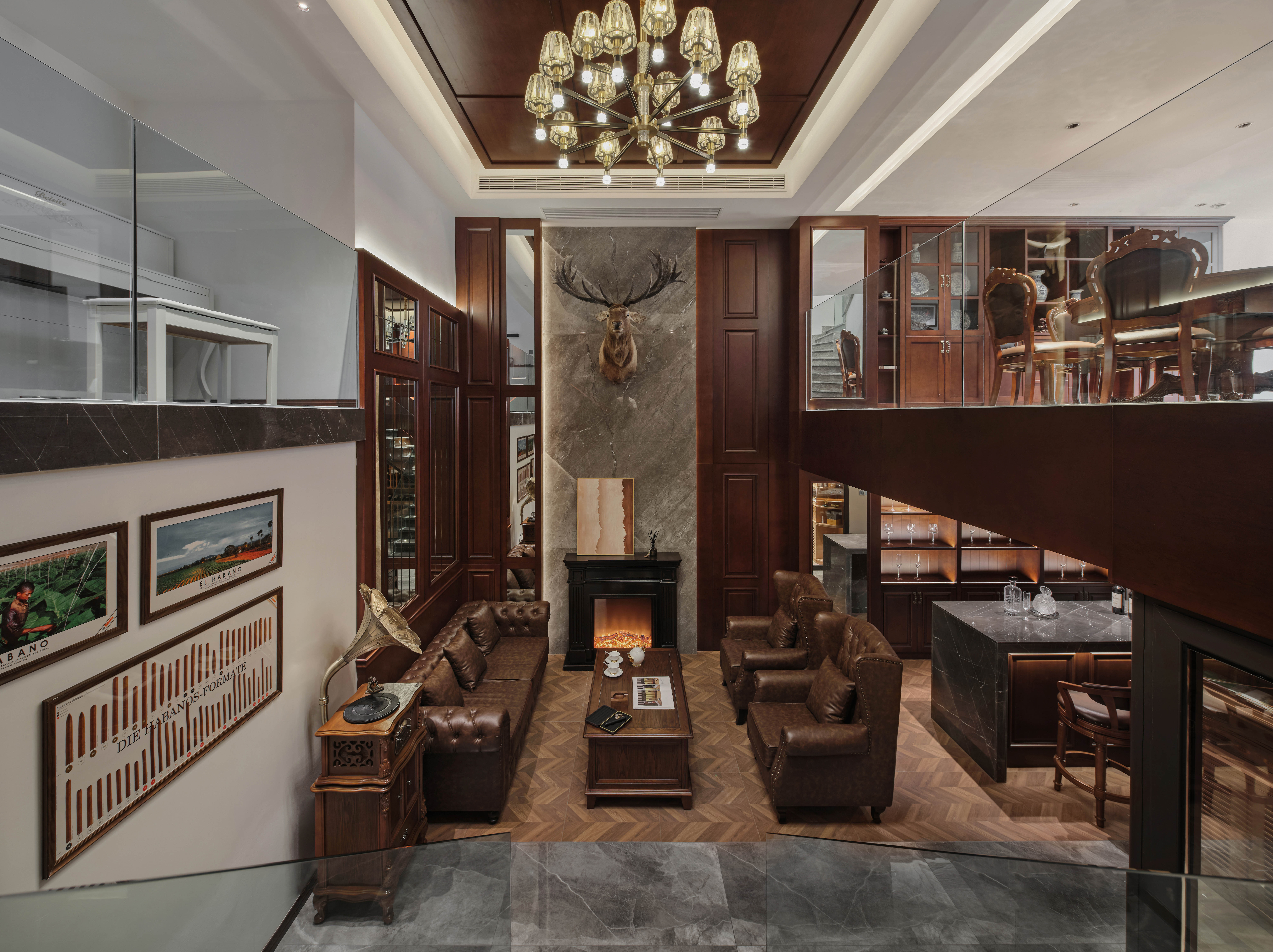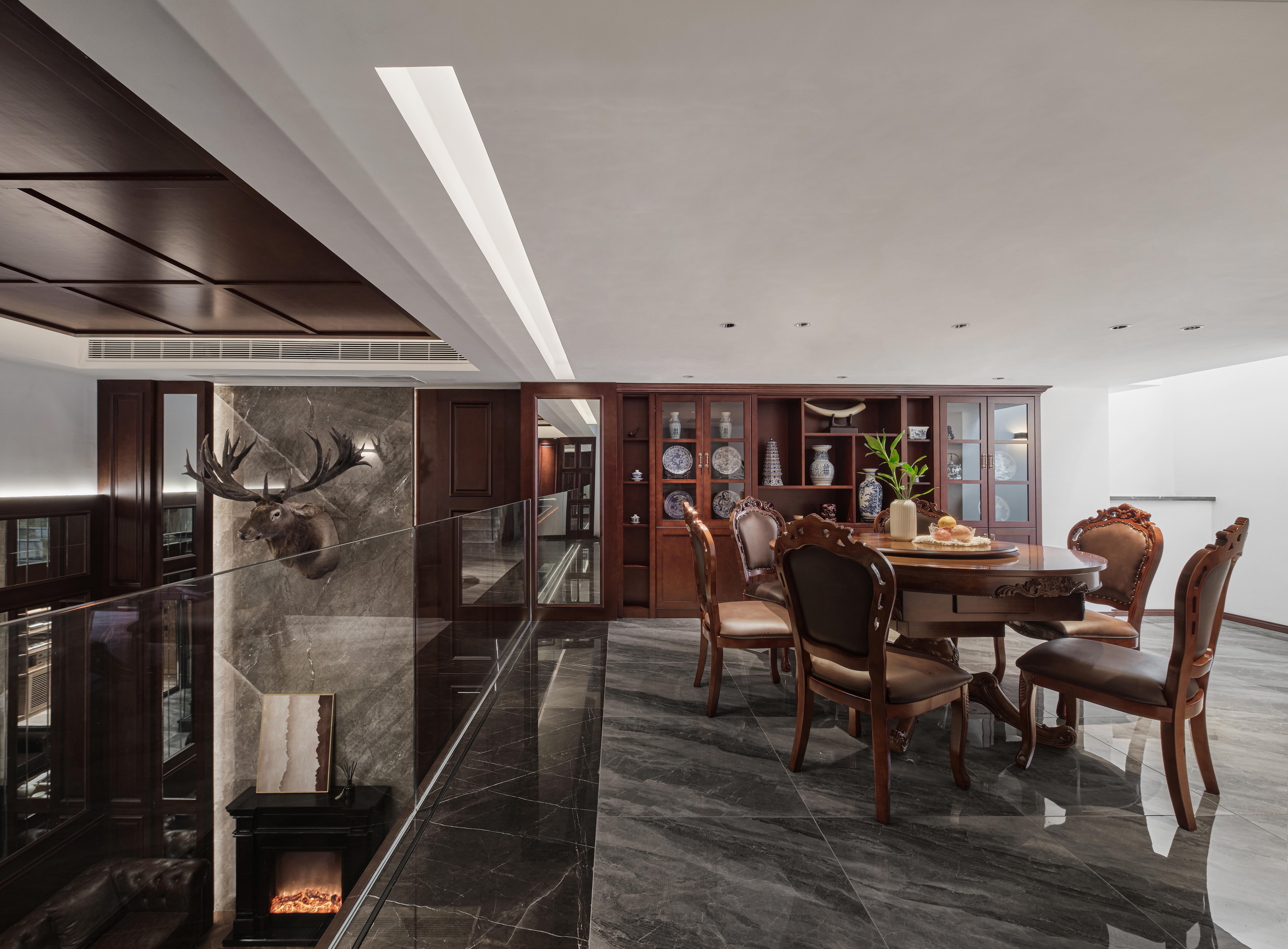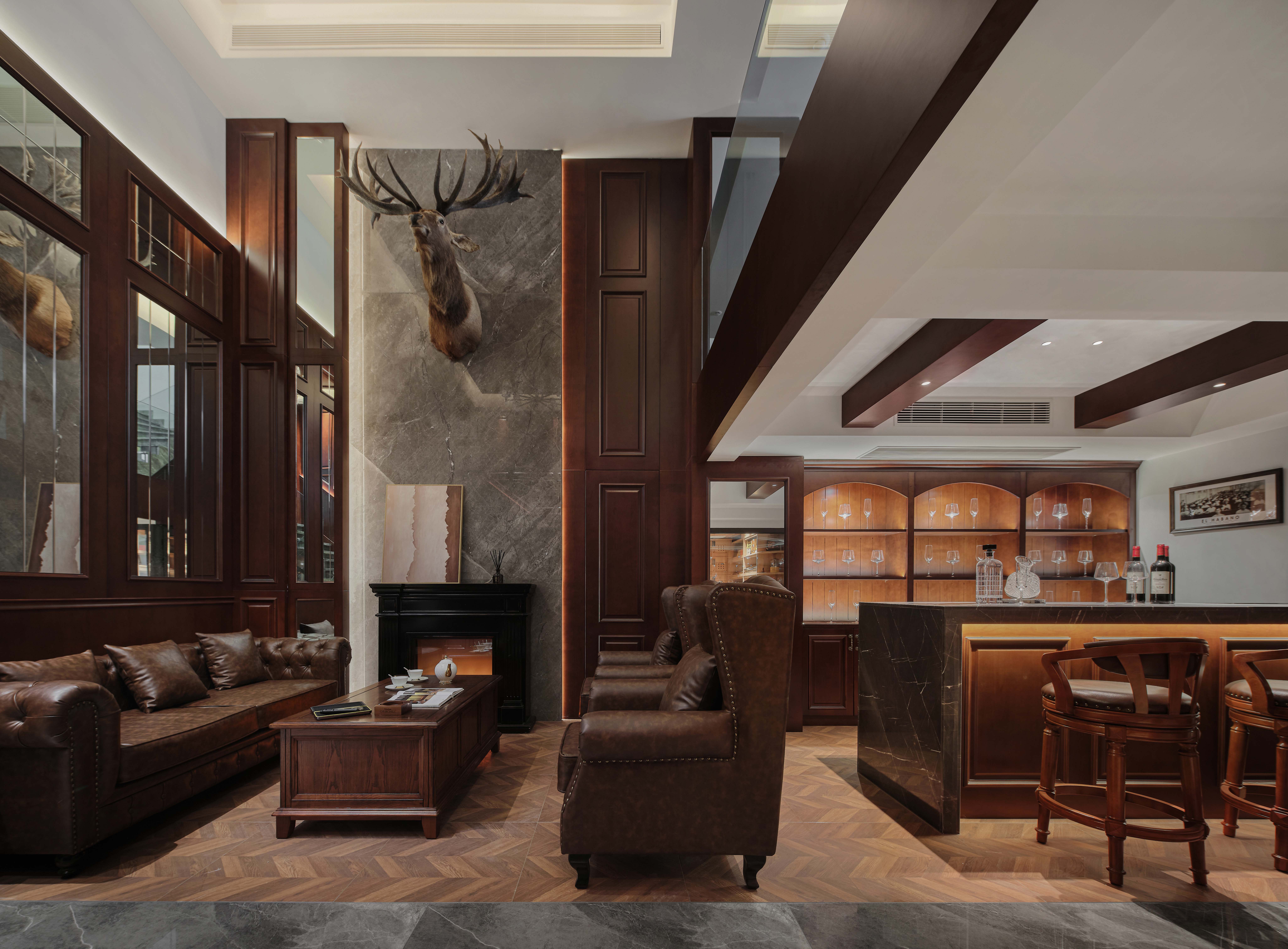 挑高区域为会客区,地面的铺装把会客区和过道做了区分,选用美式地板砖,与美式皮沙发和茶几搭配。挑高的背景墙主要利用红橡色木饰面搭配灰色石材,穿插车刻镜子,增加质感的同时也增加空间感。石材背景上考虑鹿头和壁炉做装饰,马鹿的应用既象征人生的多种可能,也呼应了复古的氛围。吊顶的木饰面与墙地面相呼应,营造整体美式氛围。背景墙后面有影音室和健身房空间,考虑不破坏背景墙的完整性,应用隐形门设计。