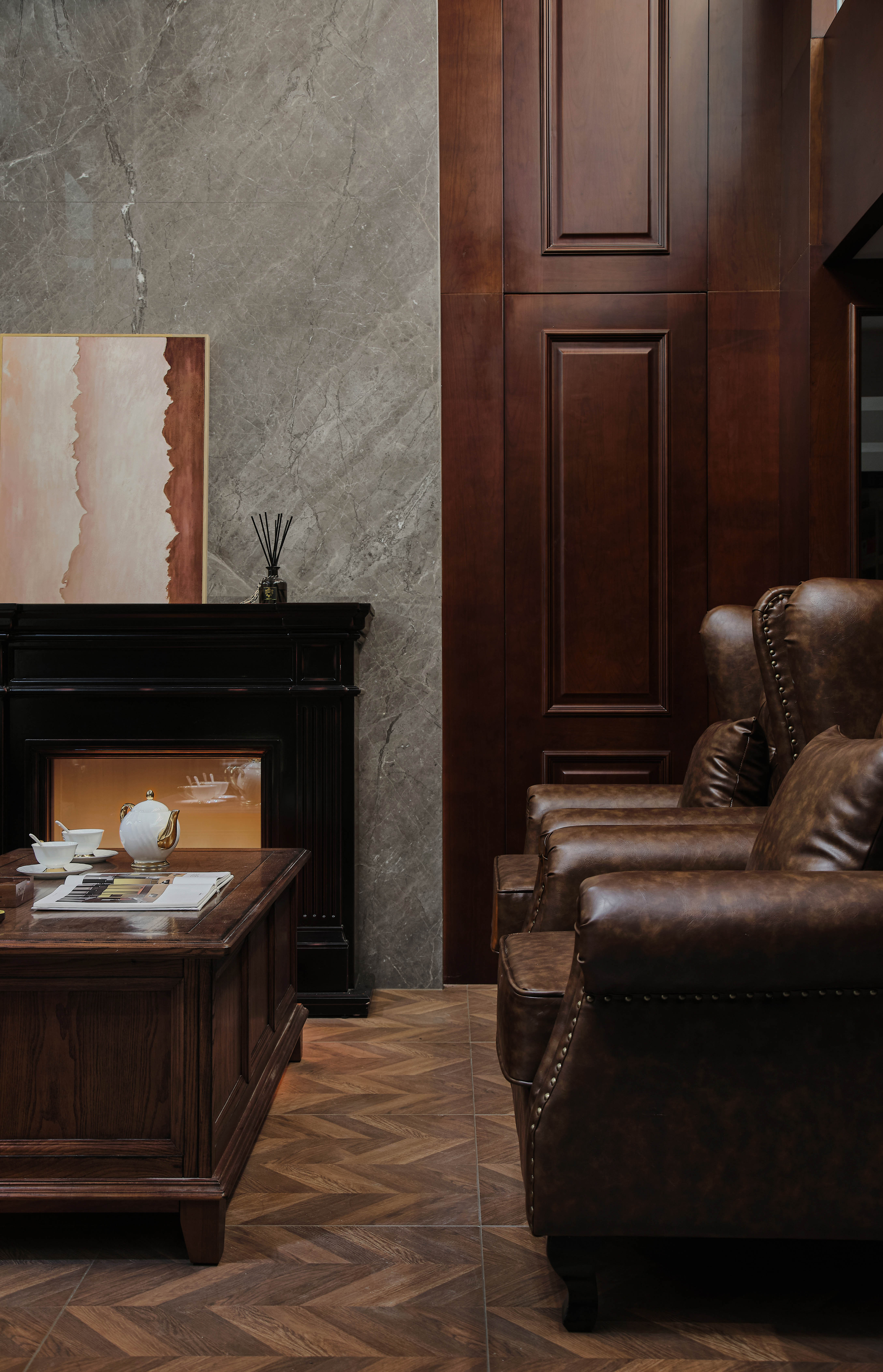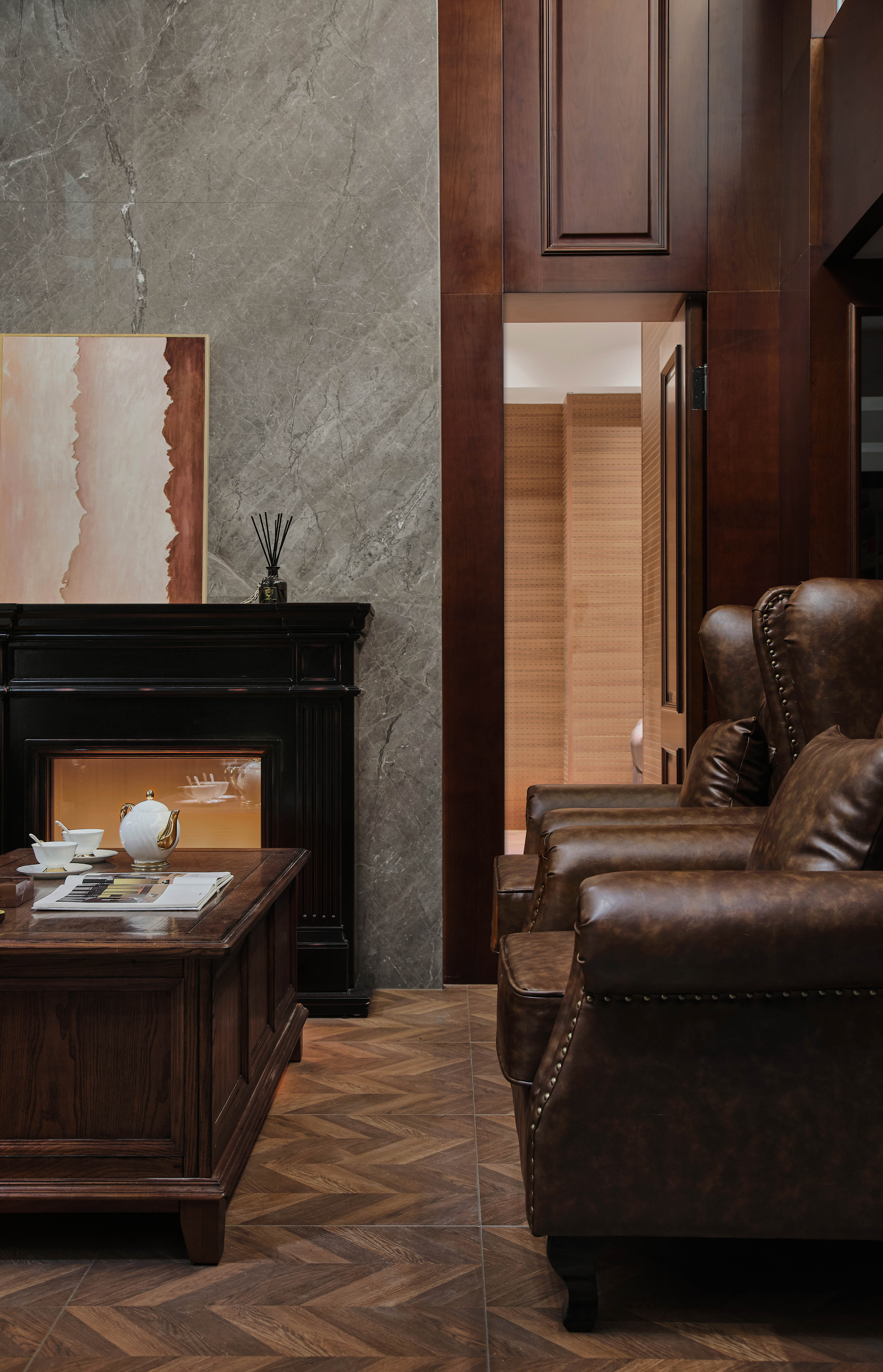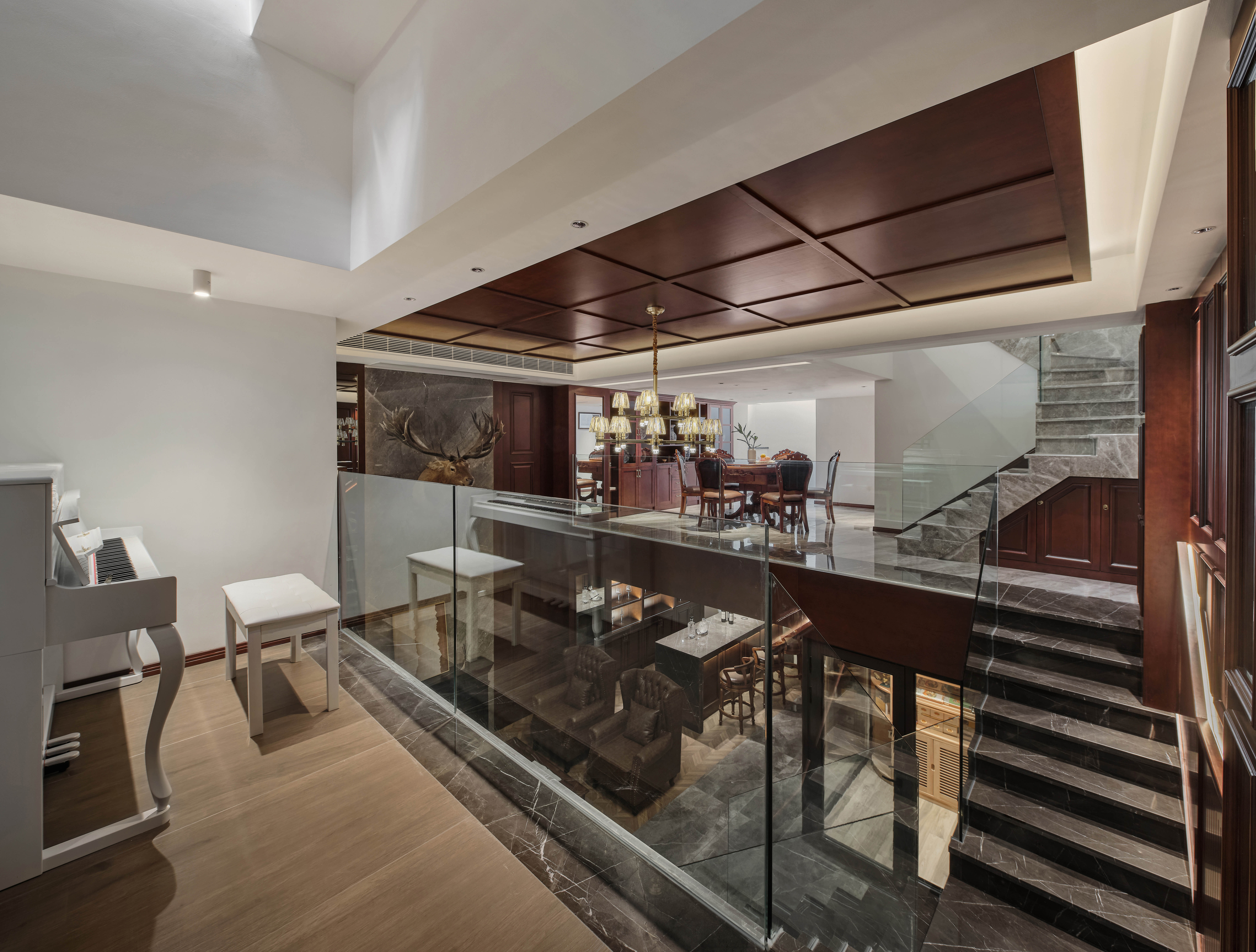 挑高区域为会客区,地面的铺装把会客区和过道做了区分,选用美式地板砖,与美式皮沙发和茶几搭配。挑高的背景墙主要利用红橡色木饰面搭配灰色石材,穿插车刻镜子,增加质感的同时也增加空间感。石材背景上考虑鹿头和壁炉做装饰,马鹿的应用既象征人生的多种可能,也呼应了复古的氛围。吊顶的木饰面与墙地面相呼应,营造整体美式氛围。背景墙后面有影音室和健身房空间,考虑不破坏背景墙的完整性,应用隐形门设计。
