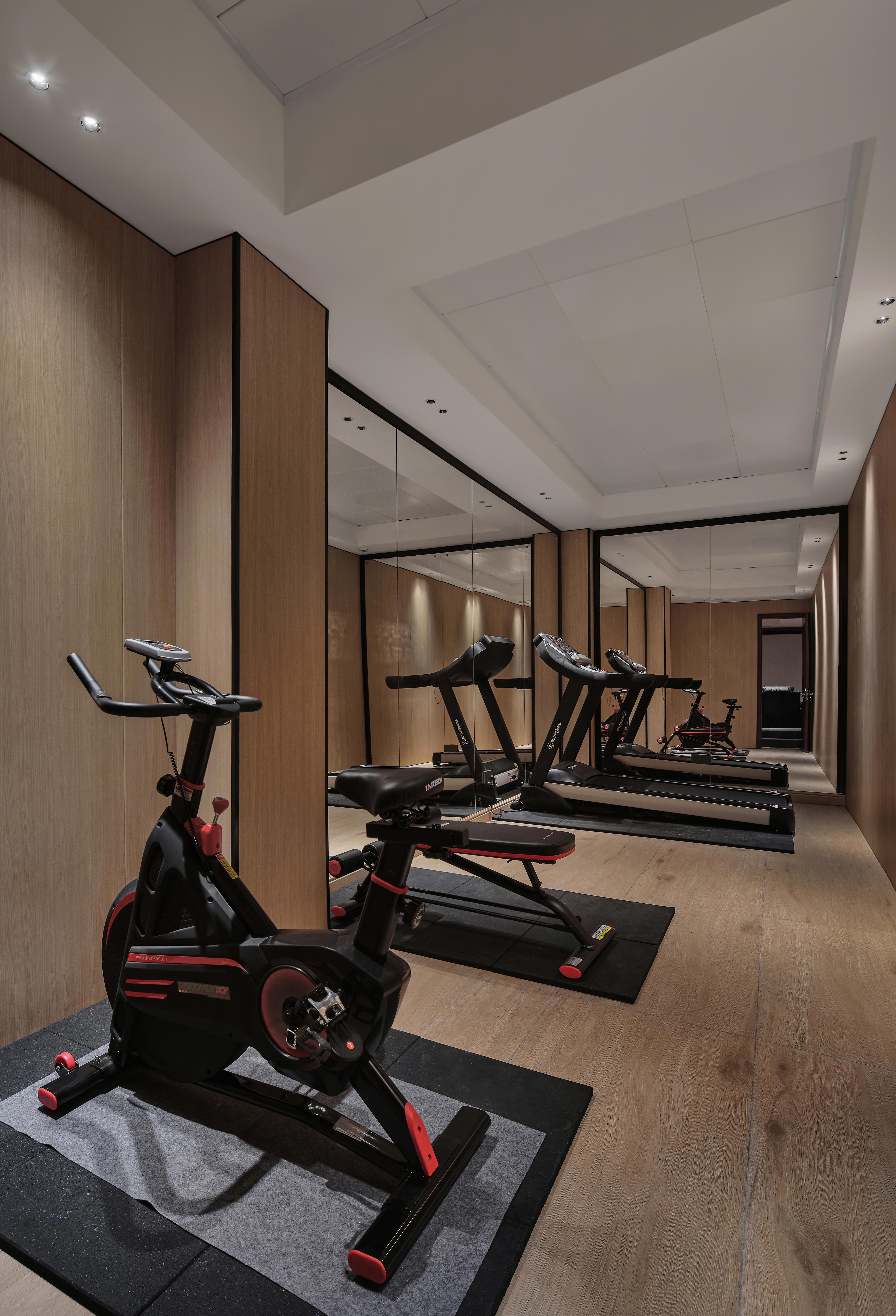 穿过影音室,来到健身房。健身房作为一种更加阳光,健康的空间,色调更加亲近自然,原木色的地面与墙面装饰,带给人一种舒适的感觉。墙面的镜子起到增加空间感的同时,也可以给业主带来时刻看到自己锻炼成果的功能。