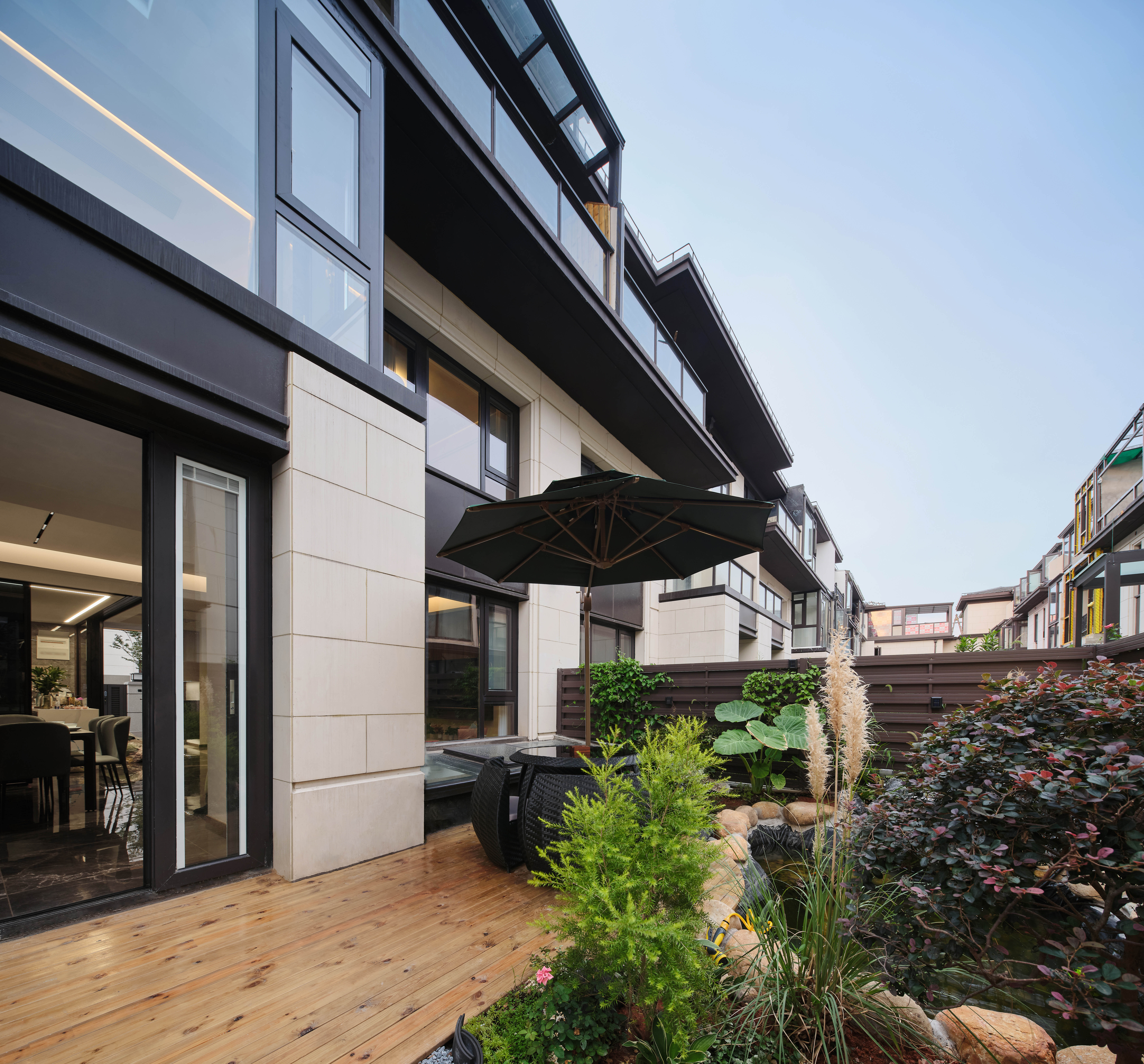 整个房屋还配备了南北院子,南院子整体为原生院子,自然造型的水池和花卉区域,搭配休闲座椅平台,营造出自然的庭院生活气息。