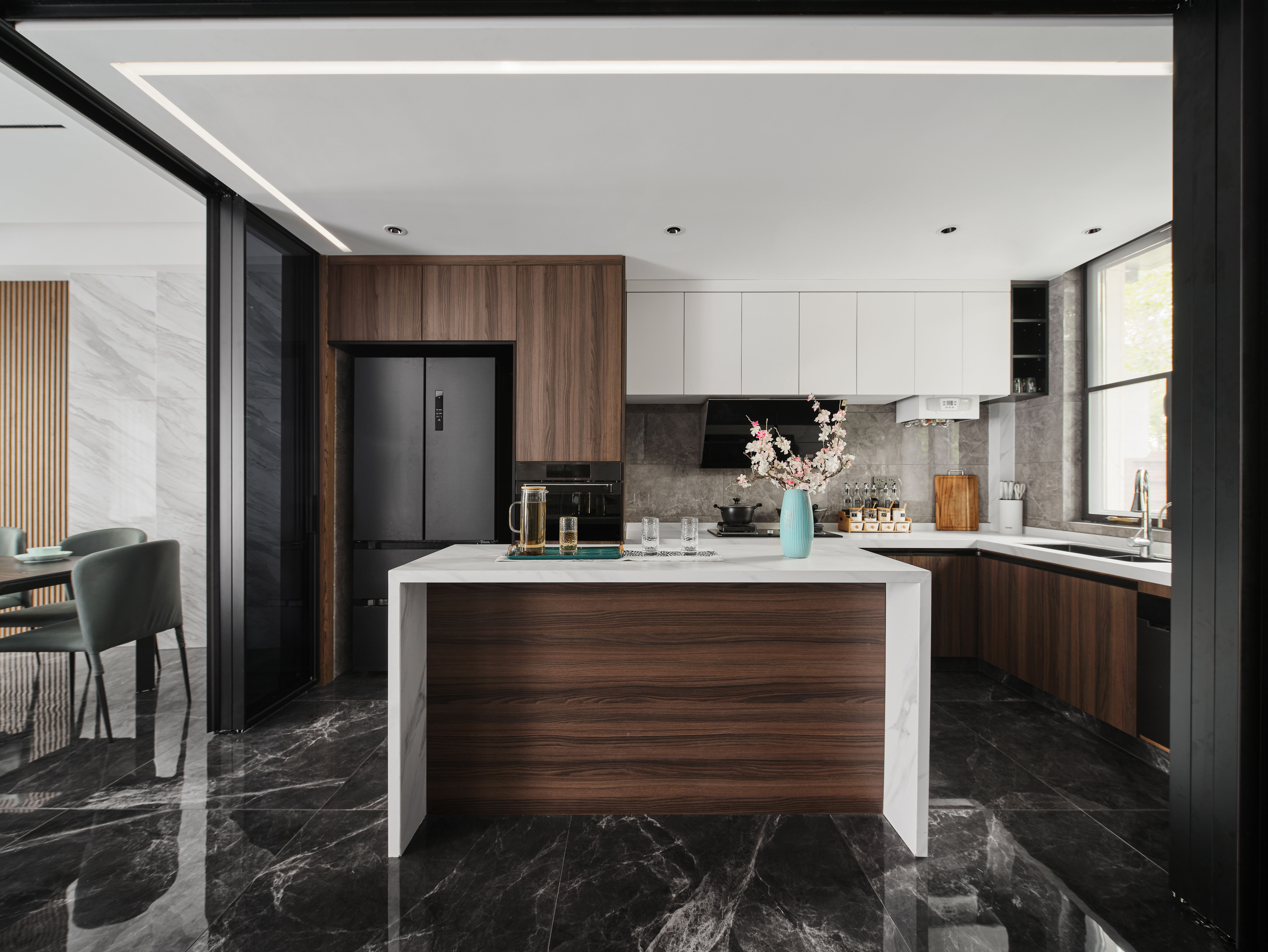 厨房空间打破原有封闭的姿态,形成一个开放式的形式。但考虑到纯开放式厨房存在油烟问题,所以我们配备了双向的L 型移门,做到可开放可封闭的厨房空间。打开移门则是一个开放式西厨空间,岛台放置于厨房中间,既满足三两人就餐,也可以作为中西餐操作台。厨房白色的台面以及吊柜搭配木色柜门及木饰面,形成色彩对比,暗色调突出台面线条感,与顶面线性灯相呼应。