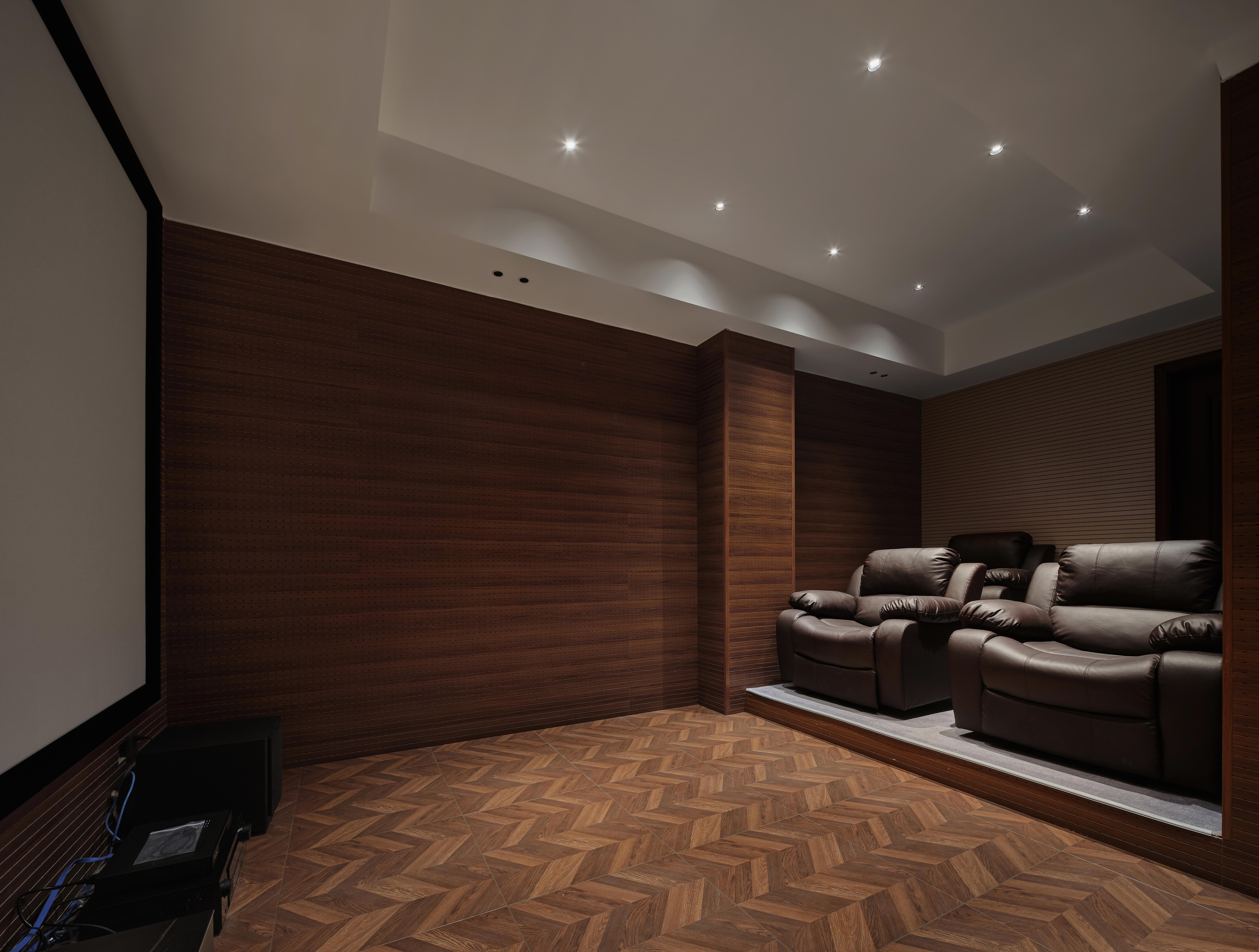 通过隐形门便进入影音室,影音室通过与会客厅相似的木纹色调来做整体色调,地台的设计增加视觉高度的同时也可以尽可能增加观看排数,从而做到前排不挡后排视线。整个空间也通过墙面的吸音板与地面的地毯起到吸音的功能。