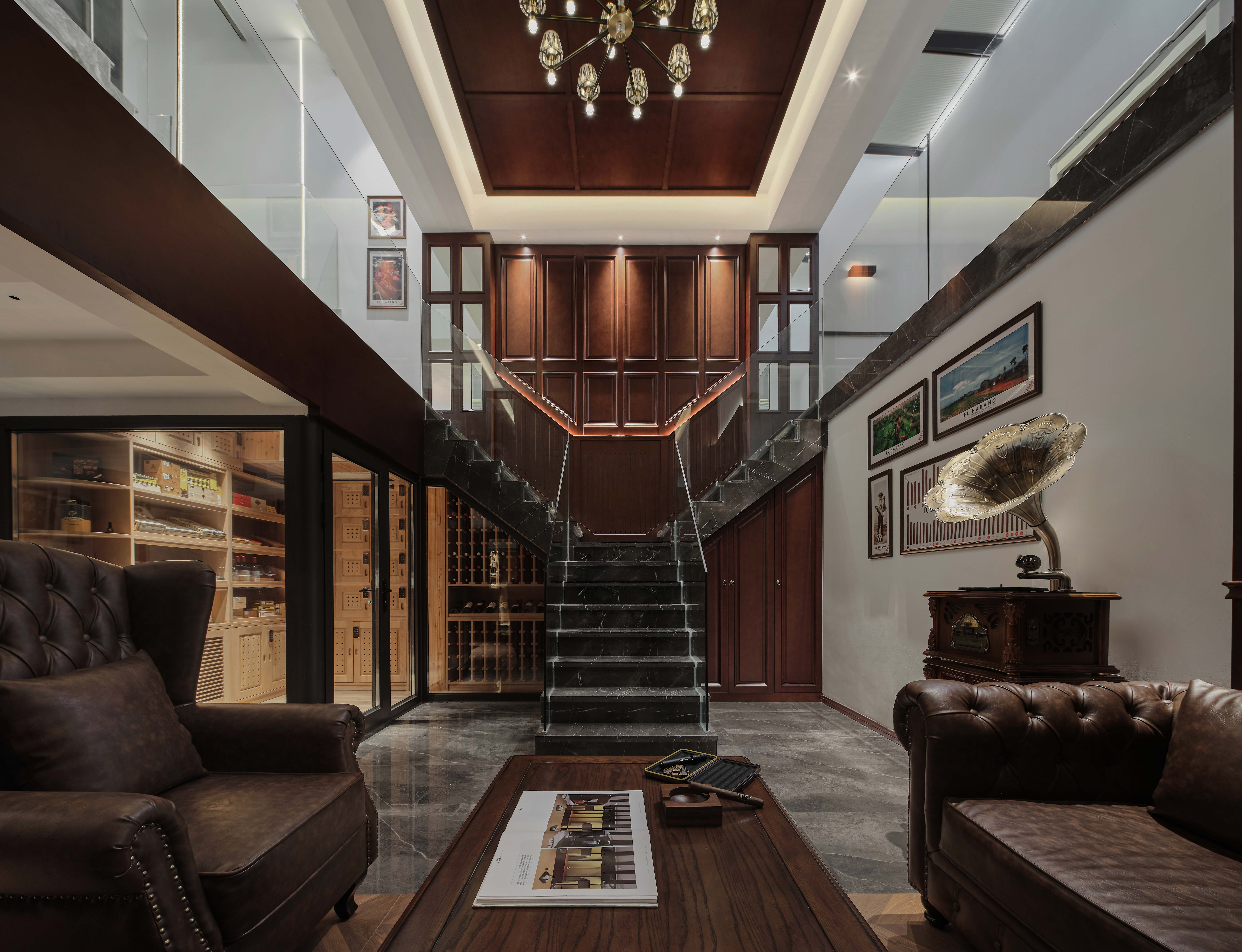 雪茄房则取代了雪茄柜和红酒柜,增加了储存空间,也丰富了空间的功能性。雪茄房区域与吧台对望,既满足业主方便放取雪茄,同时也可以利用楼梯下方区域,与隔层下方连成一个整体,大面积玻璃封闭,既可以有展示作用,也可以起到很好的保温性。楼梯下方另一边则作为储物空间,用美式的柜门遮蔽,与左边的雪茄房区域形成非对称感。 负二层楼梯为三向楼梯,采用对称式手法,满足一个楼梯既可以上负一层,也可以上采光井平台,同时也可以下负二层。舍去现浇过道平台去往采光井平台,增加挑高空间面积,也使空间更加通透。楼梯采用保加利亚灰石材,与楼上楼梯颜色形成区别,突出地下空间特有风格,搭配无框玻璃,与背景的美式木饰面形成对比,增加视觉冲击感。